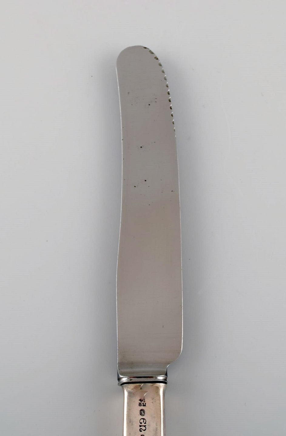 Evald Nielsen nummer 14 middagskniv i hammerslået sølv (830) og rustfrit stål. 1920'erne. To stk på lager.