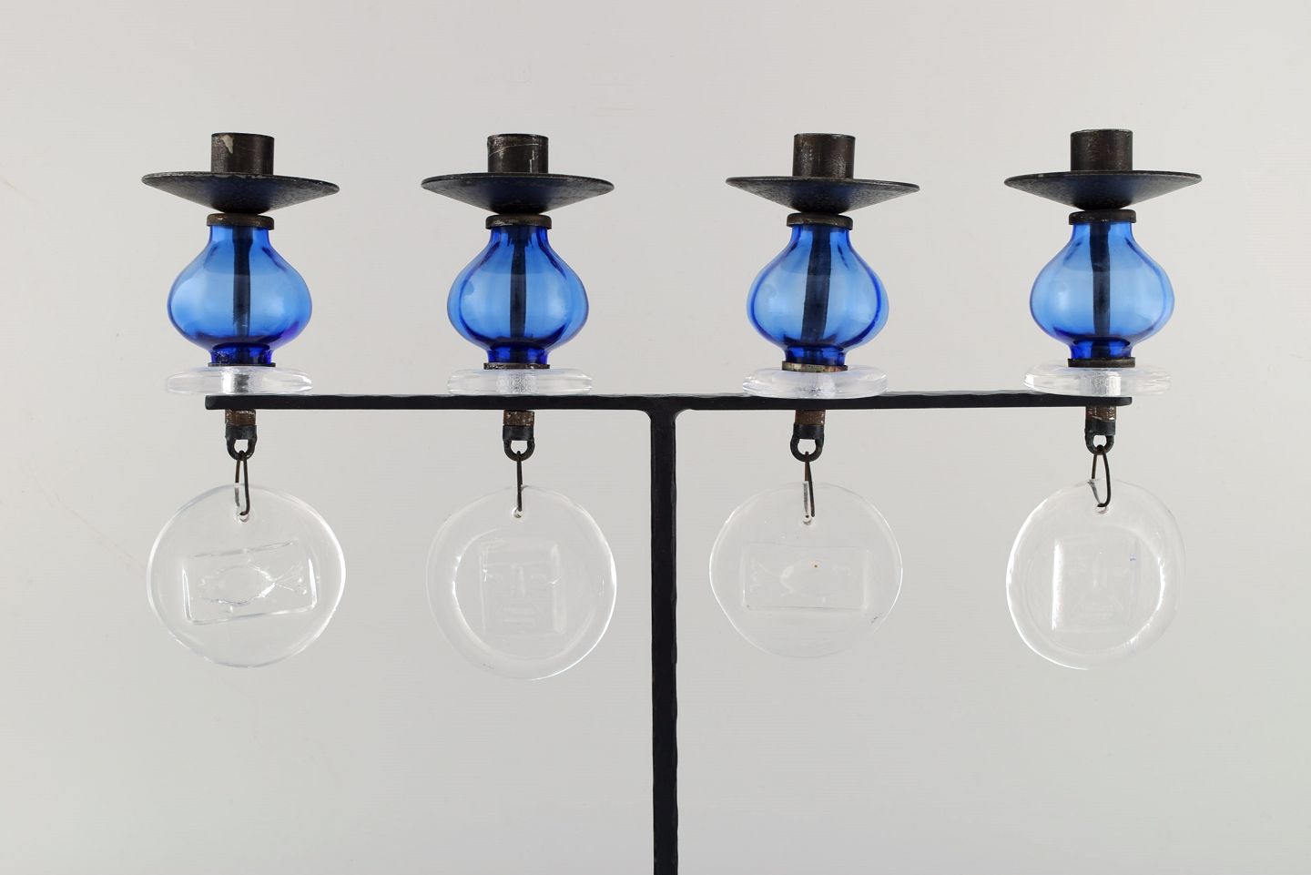 Erik Höglund for Kosta Boda, stor lysestage i støbejern med mundblæste glas. Midt 1900-tallet. I flot stand. Måler 44 x 42,5 cm.