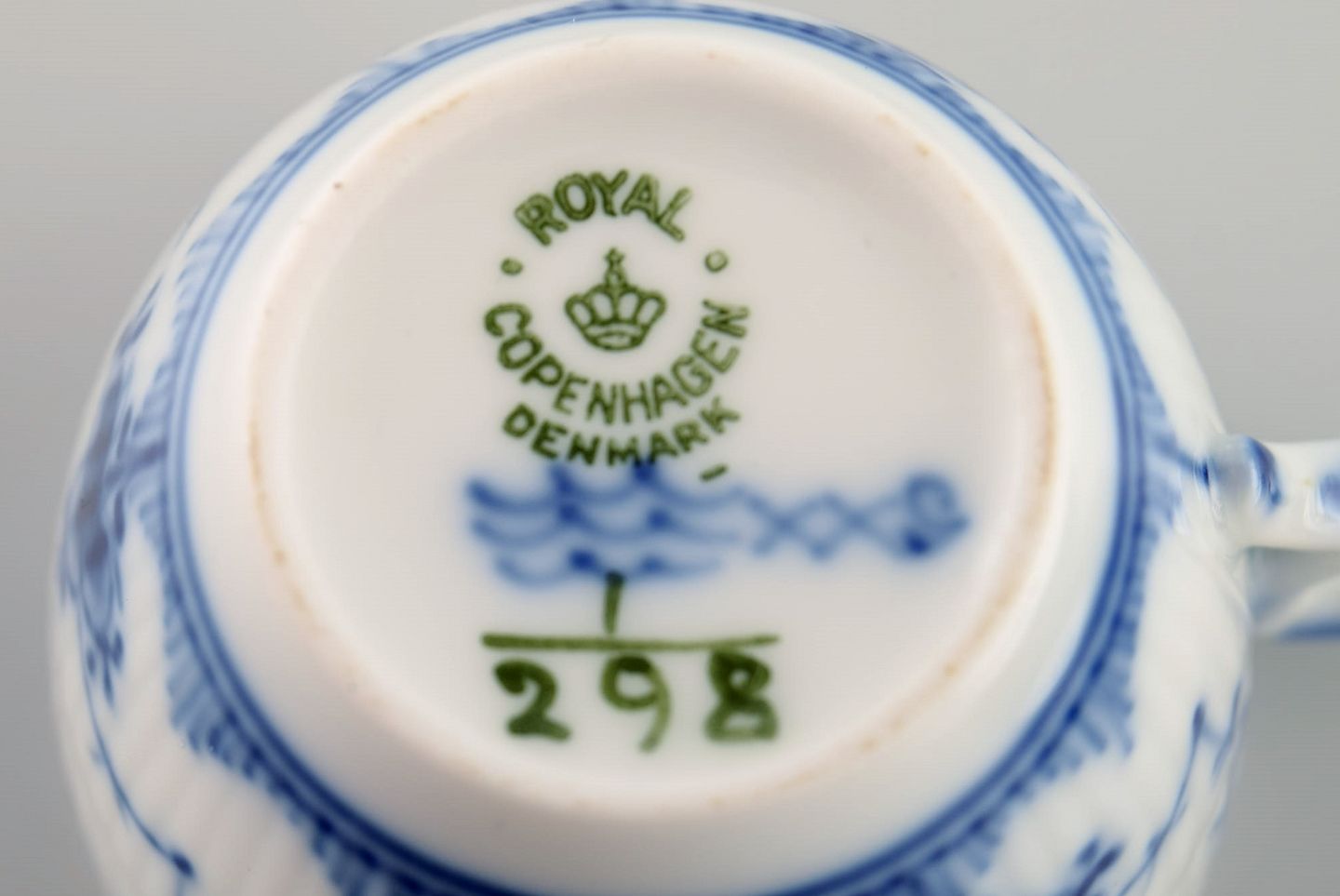 Royal Copenhagen Musselmalet Riflet kaffekop med underkop. Modelnummer 1/298. Dateret 1960. Koppen måler: 6,5 x 5,5 cm. Underkop diameter: 11,3 cm. I flot stand. Stemplet. 1. Sortering.