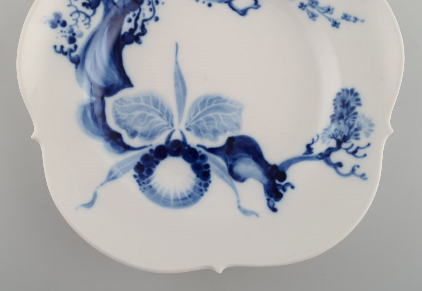 Prof. Heinz Werner for Meissen. To art nouveau skåle i håndmalet porcelæn. Blå orkide på gren. Dateret 1977-78.