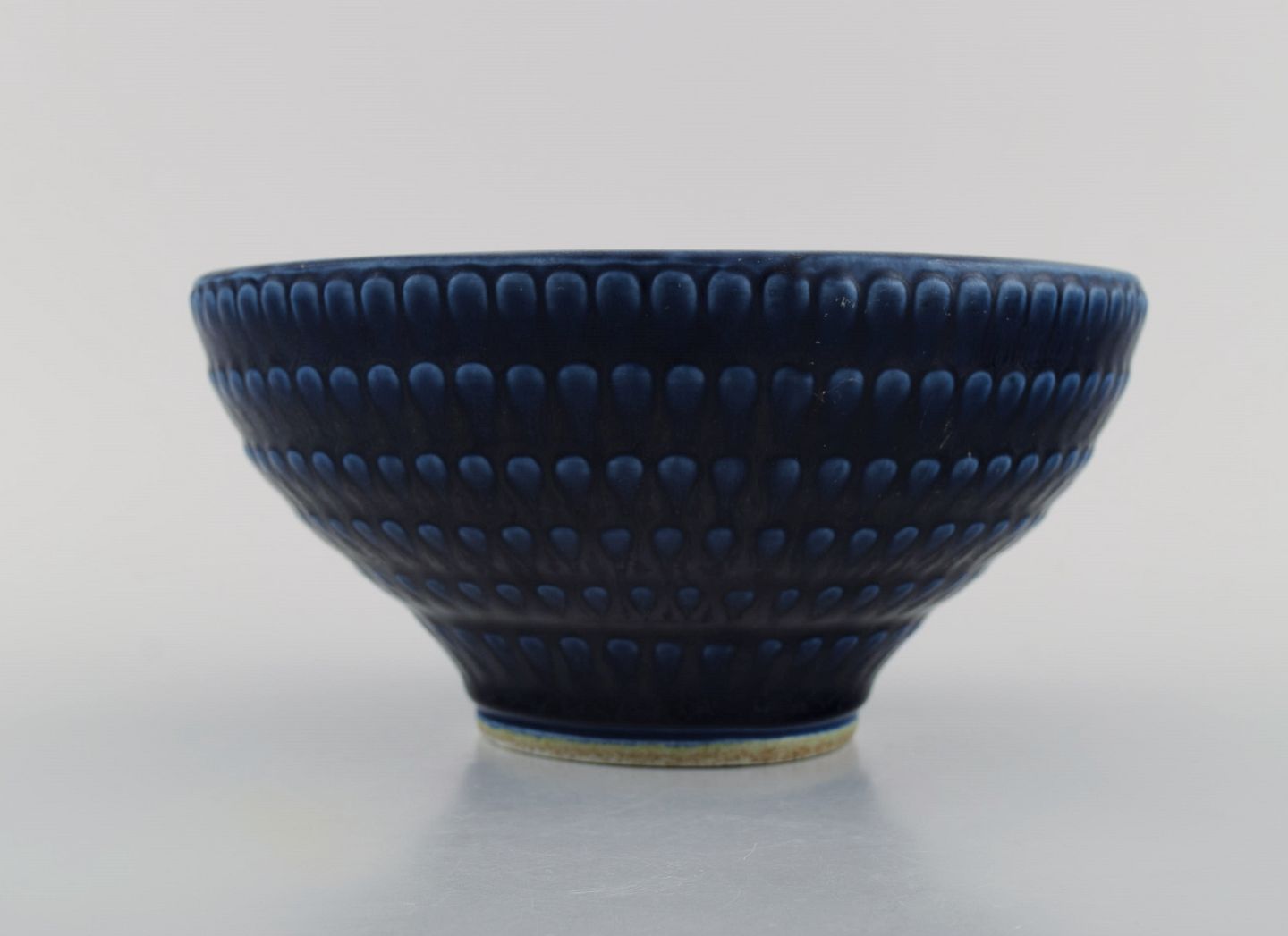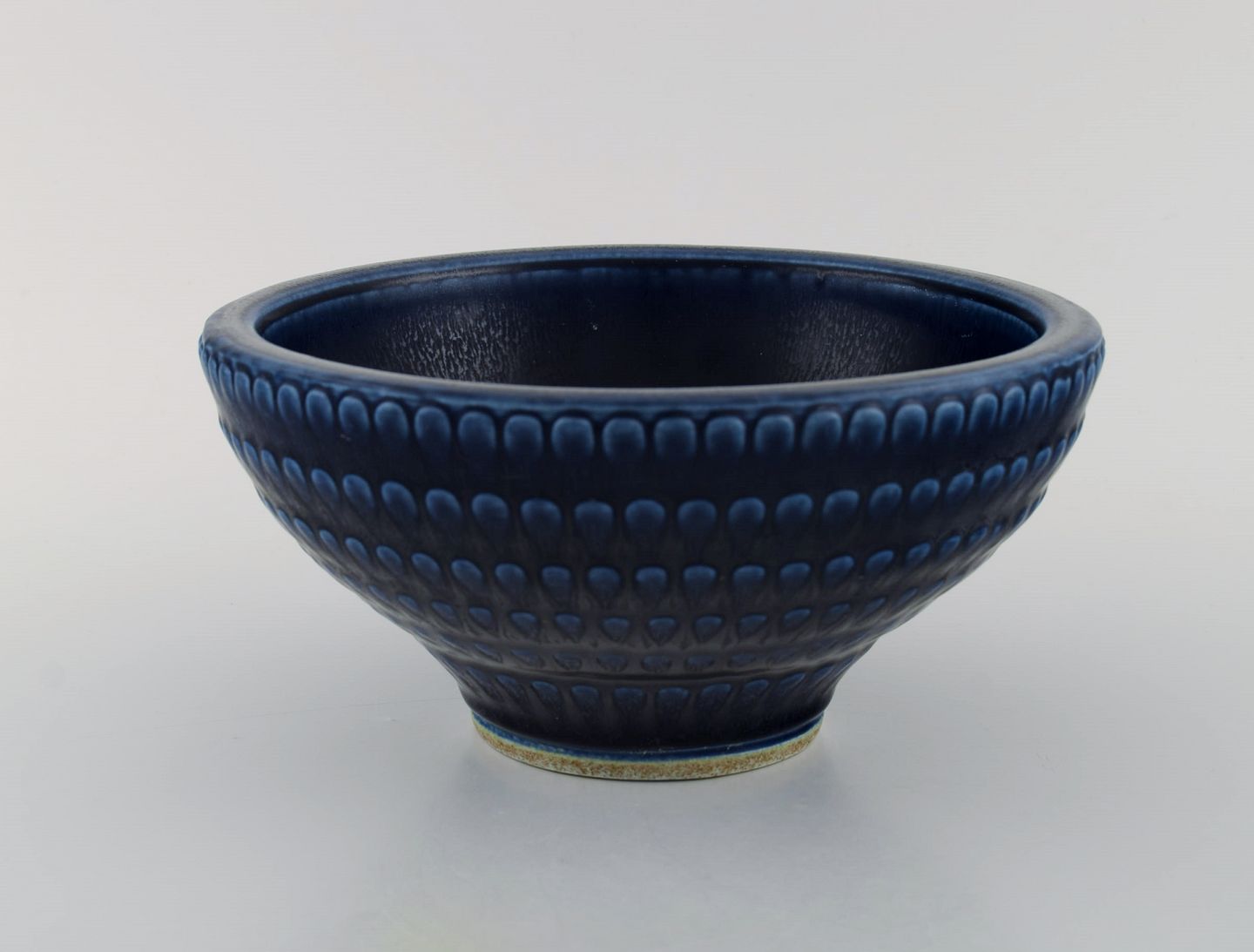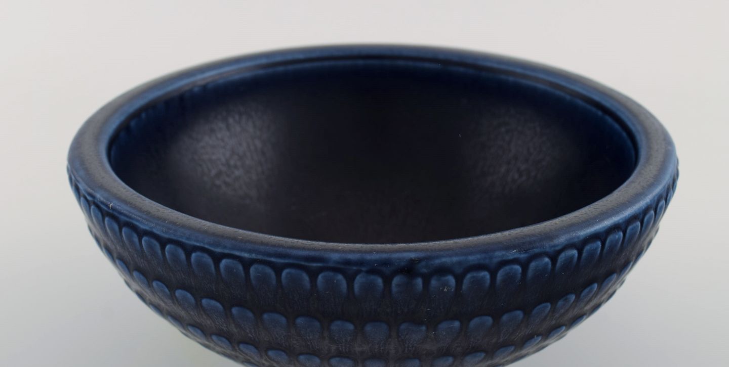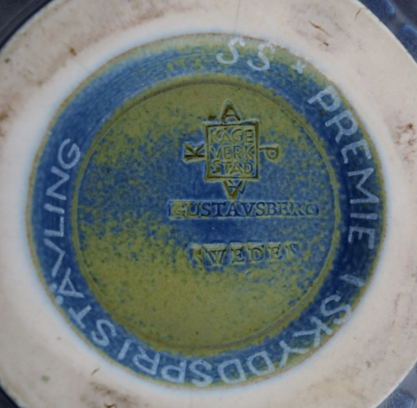 Wilhelm Kåge (1889-1960) for Gustavsberg. Stor skål i glaseret stentøj. Smuk glasur i blå/brune nuancer. Midt 1900-tallet.