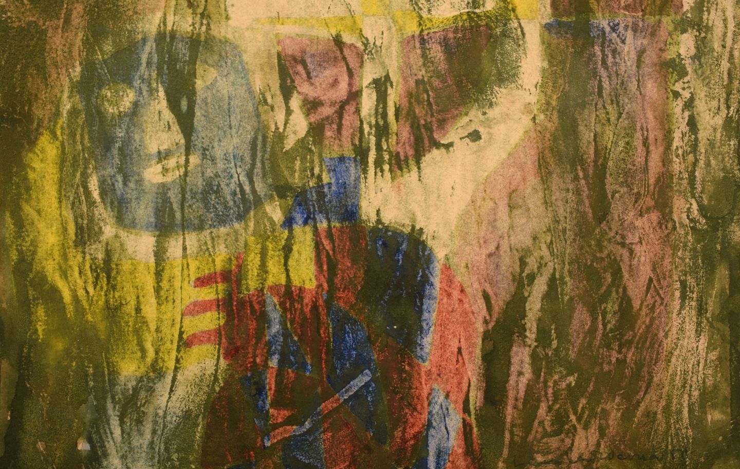 Lambert Werner (1900-1983), svensk kunstmaler. Mixed media på papir. "Flickan med dockan". Midt 1900-tallet.