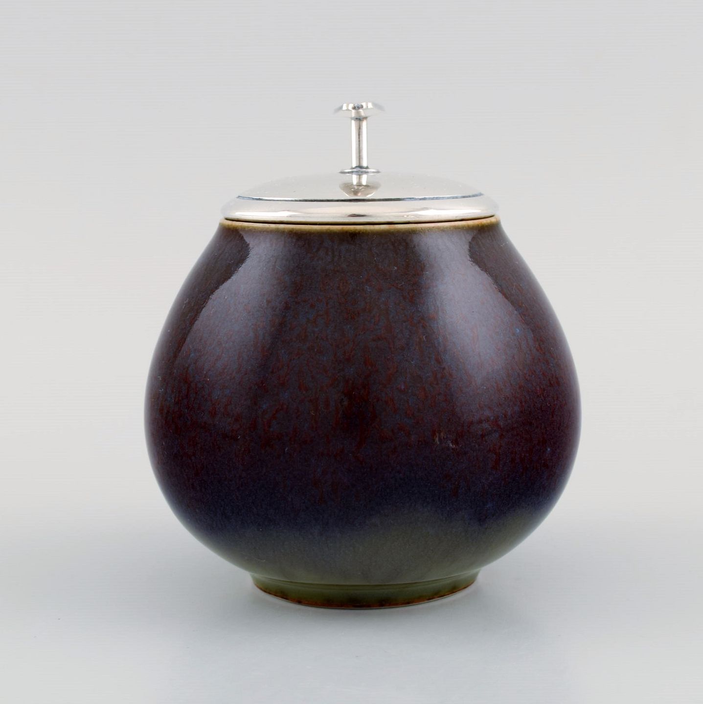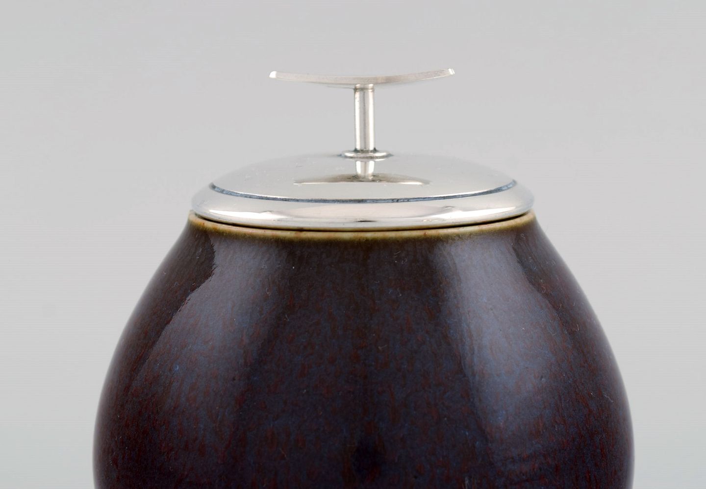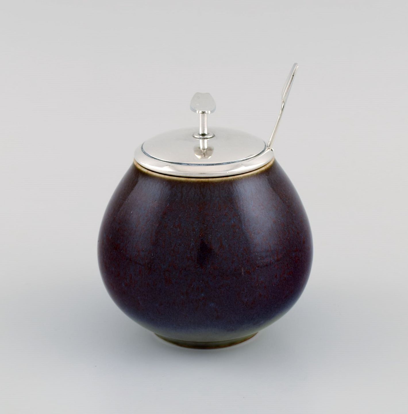 Royal Copenhagen og Franz Hingelberg. Lågkrukke i glaseret stentøj med modernistisk låg og ske i sterlingsølv. Midt 1900-tallet.
