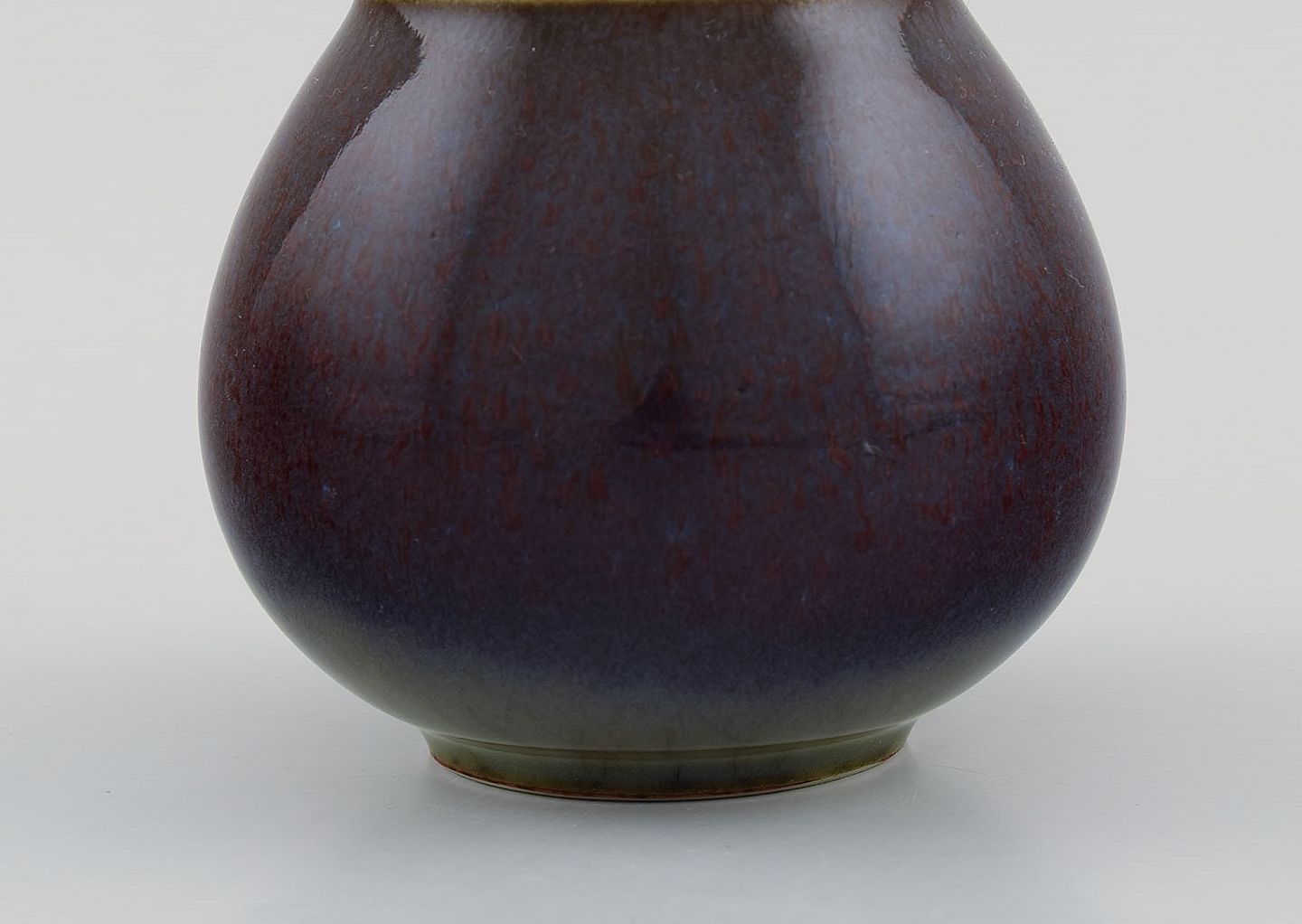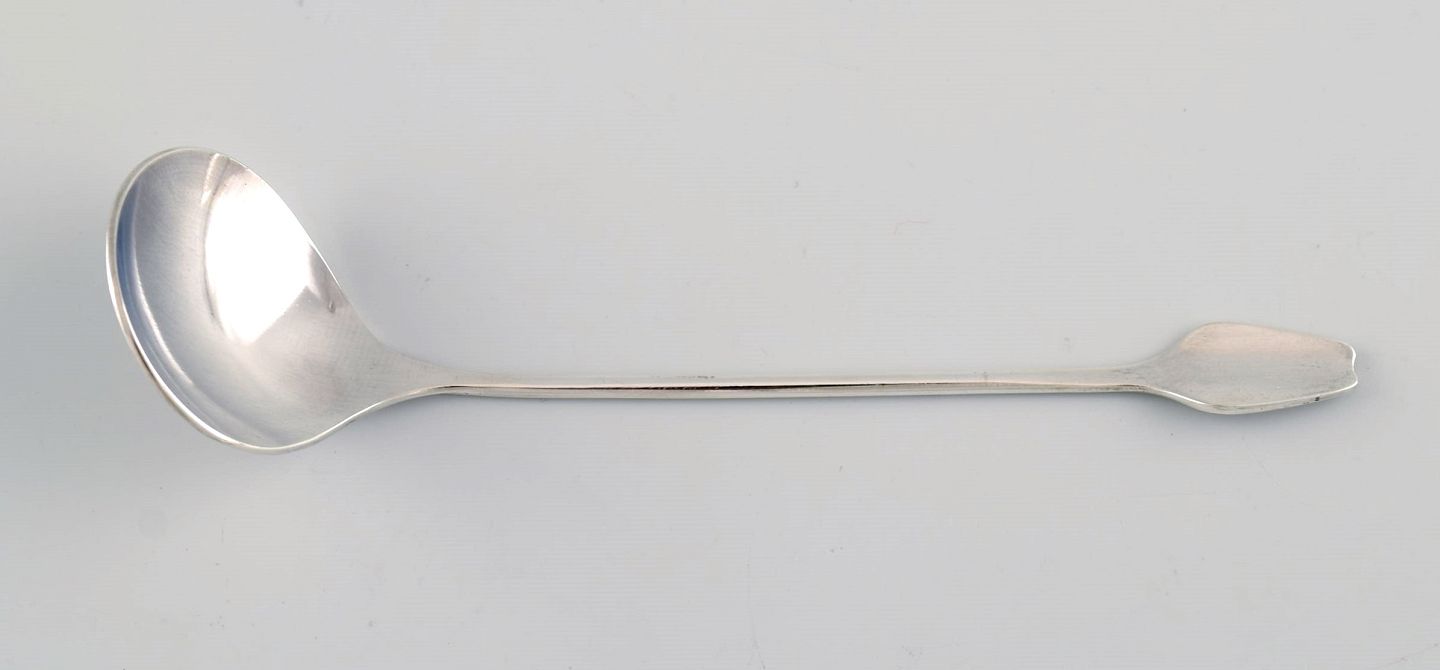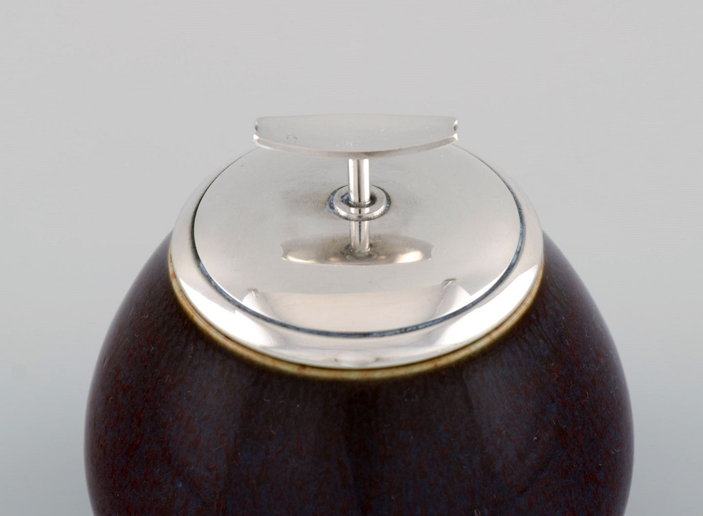 Royal Copenhagen og Franz Hingelberg. Lågkrukke i glaseret stentøj med modernistisk låg og ske i sterlingsølv. Midt 1900-tallet.