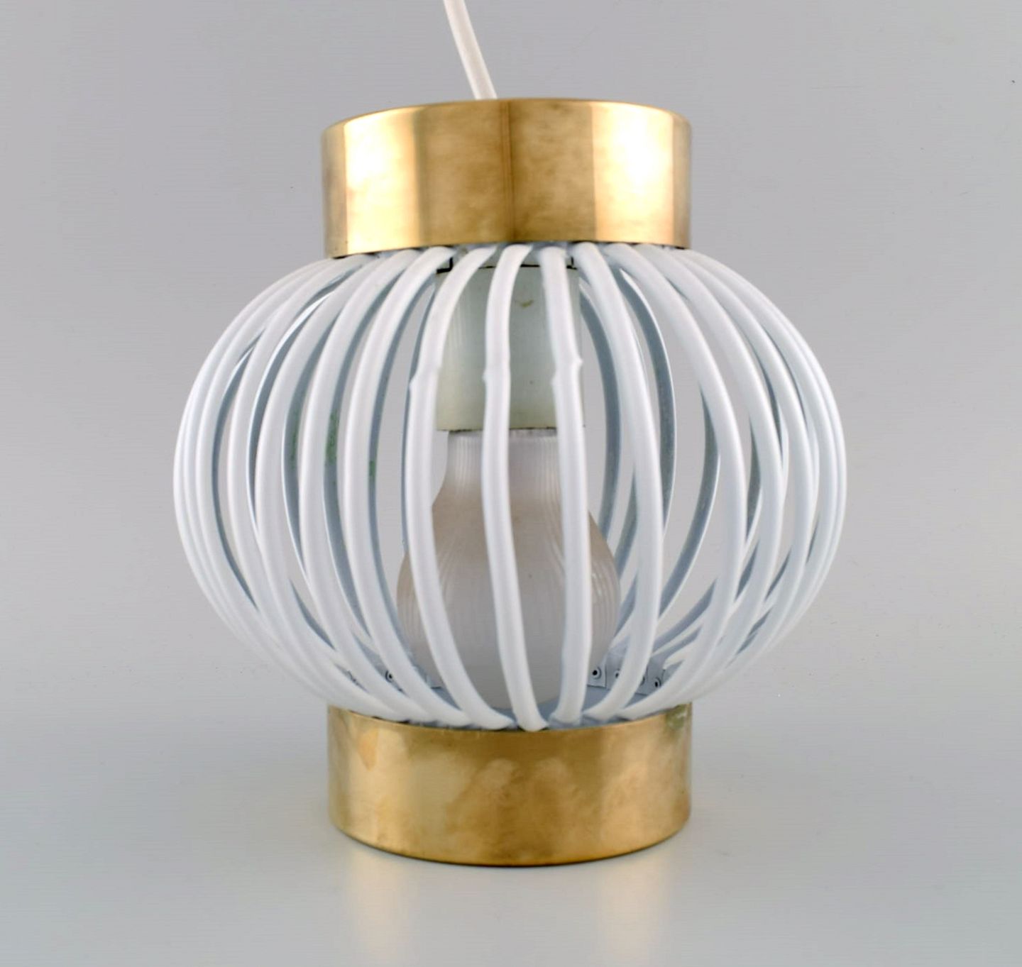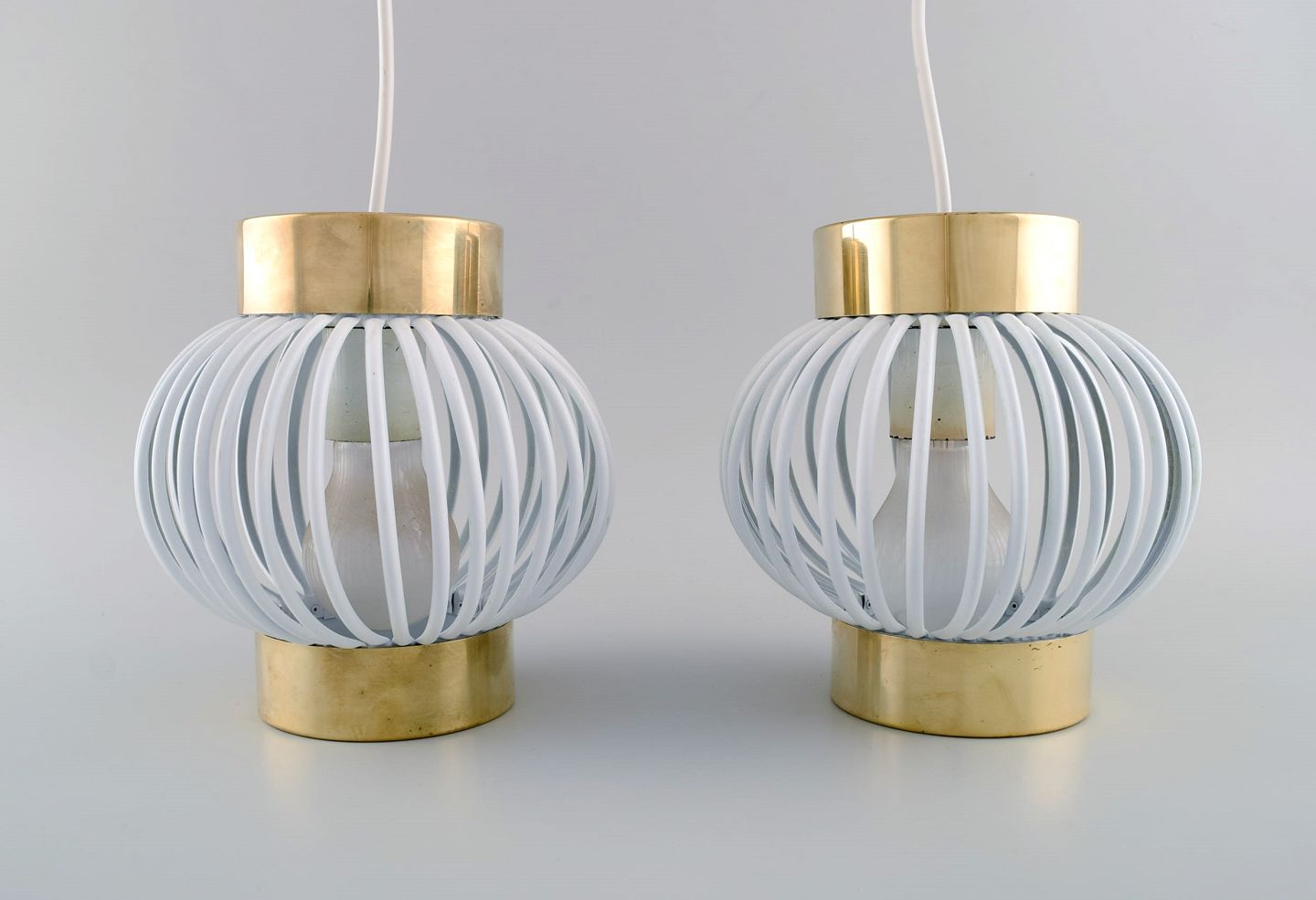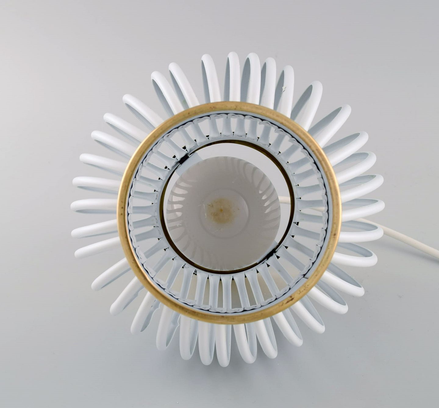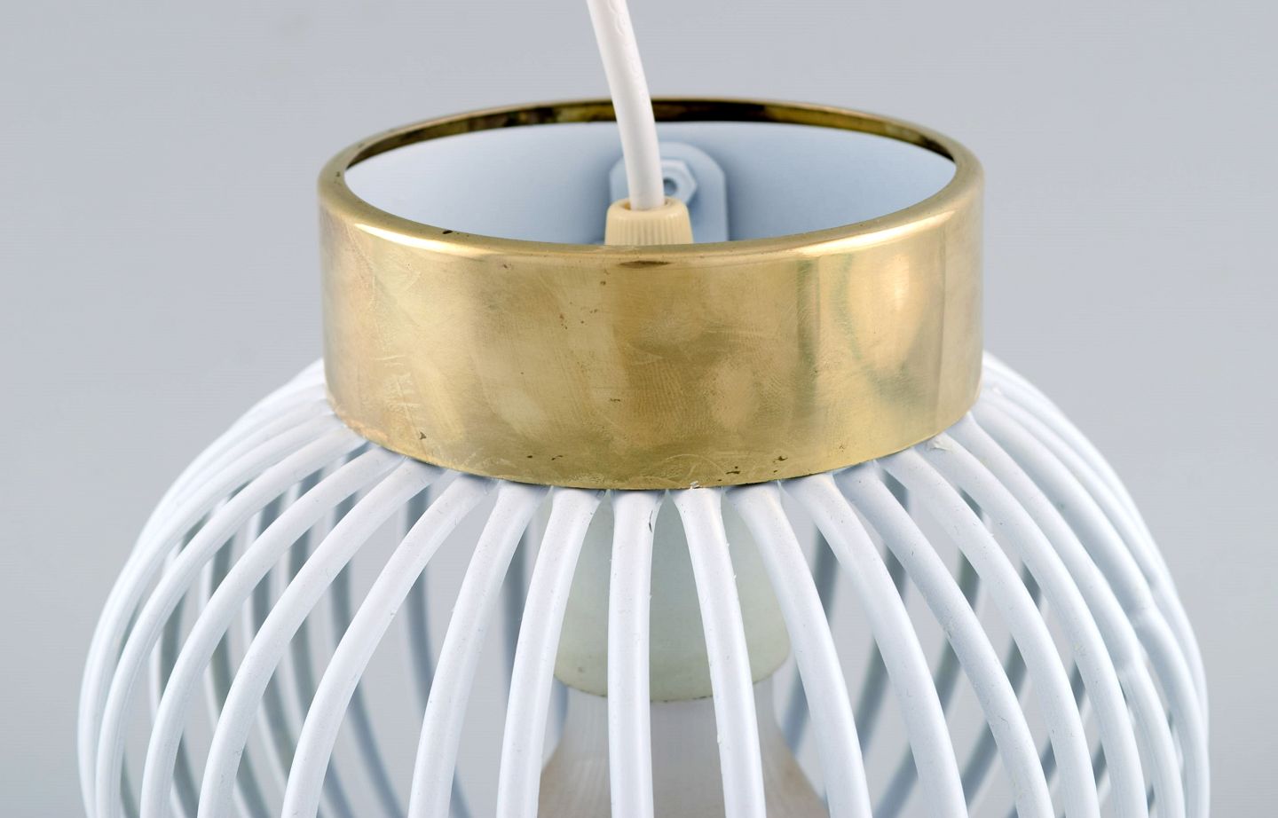To designer loftslamper i messing og hvid plast. 1960/70'erne. Måler: 18 x 18 cm. I flot stand.