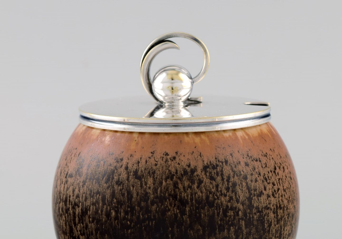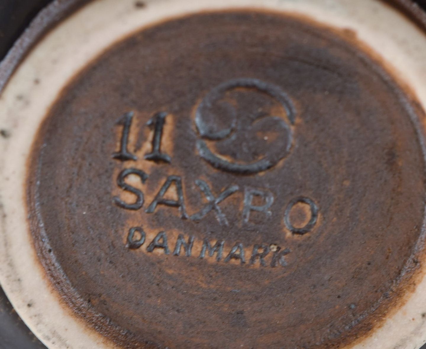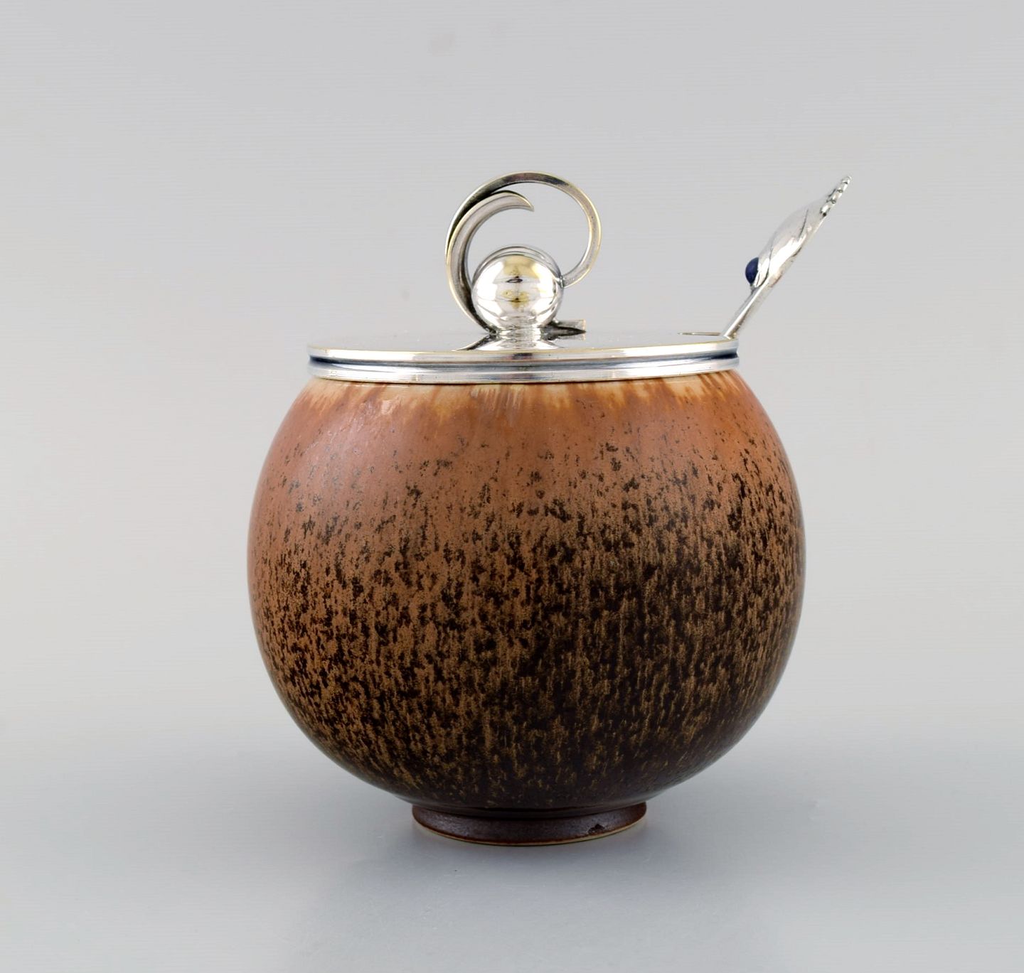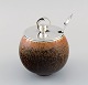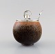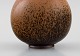 Saxbo lågkrukke i glaseret stentøj. Smuk spættet glasur i lyse brune nuancer. 1940'erne.