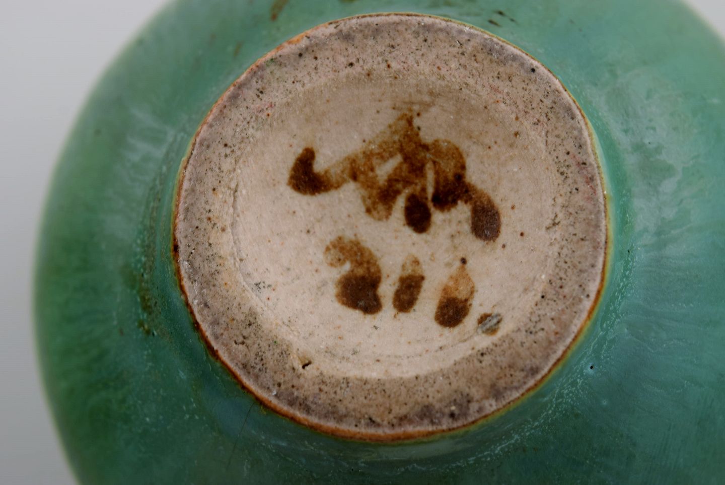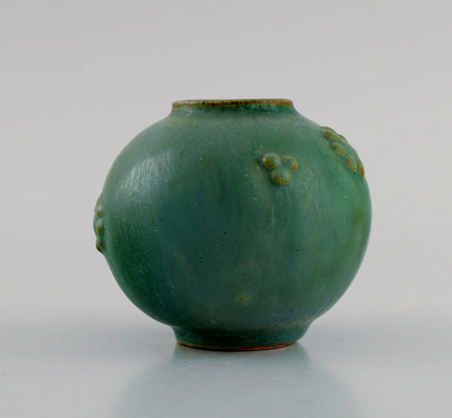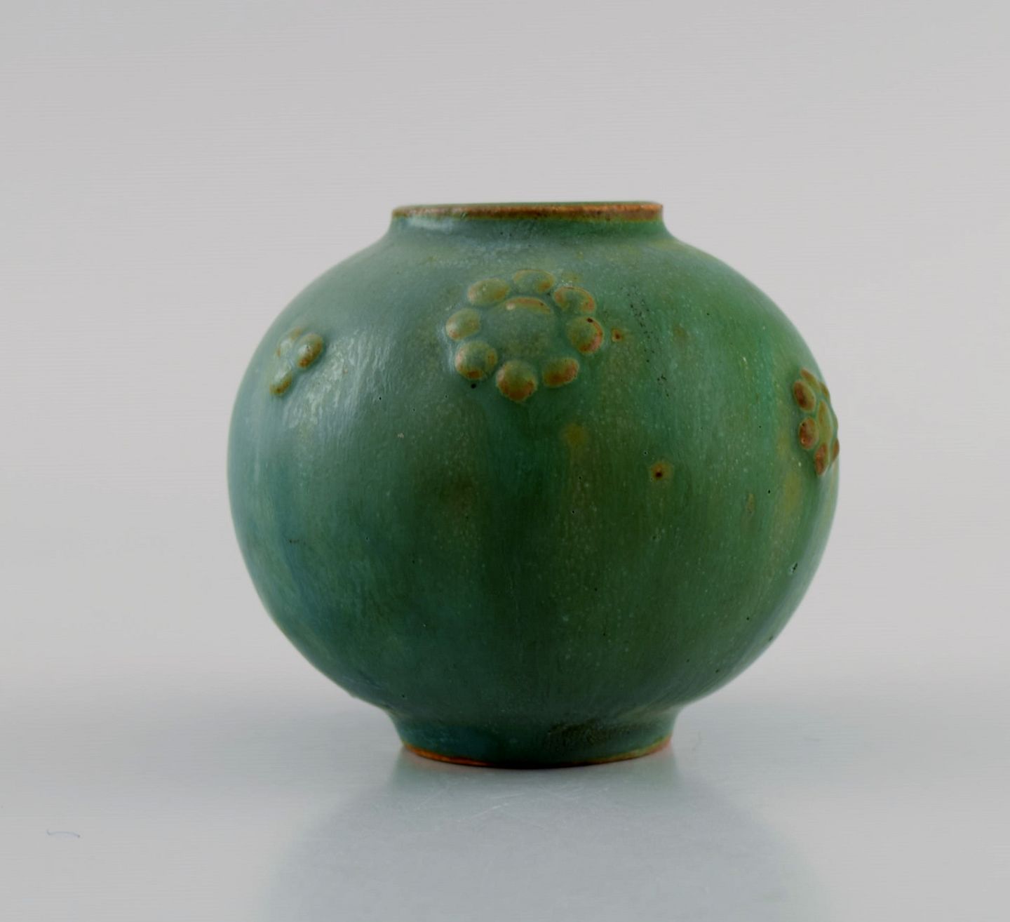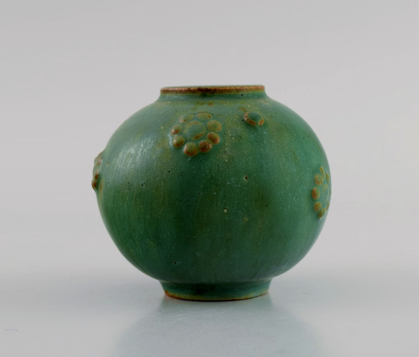 Arne Bang (1901-1983), Denmark. Round vase in glazed ceramics. Beautiful glaze in shades of green. Mid-20th century. Measures: 8 x 7 cm. In excellent condition. Signed in monogram.