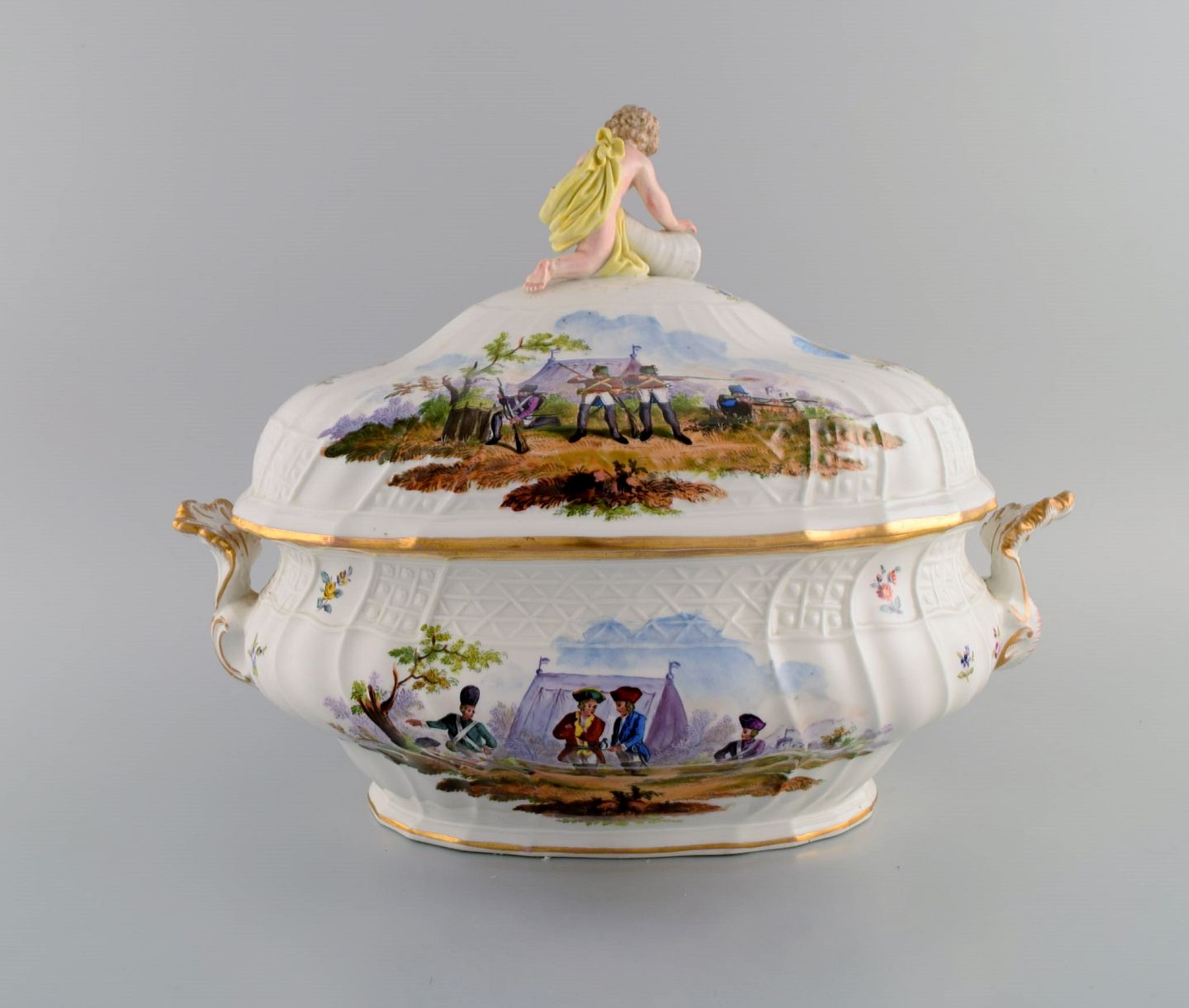 Stor antik Meissen lågterrin i håndmalet porcelæn. Militærscener og putti med overflødighedshorn. Museumskvalitet, midt 1800-tallet. Måler: 37 x 23 cm. Højde: 28 cm. I flot stand. Stemplet. 1. Sortering.
