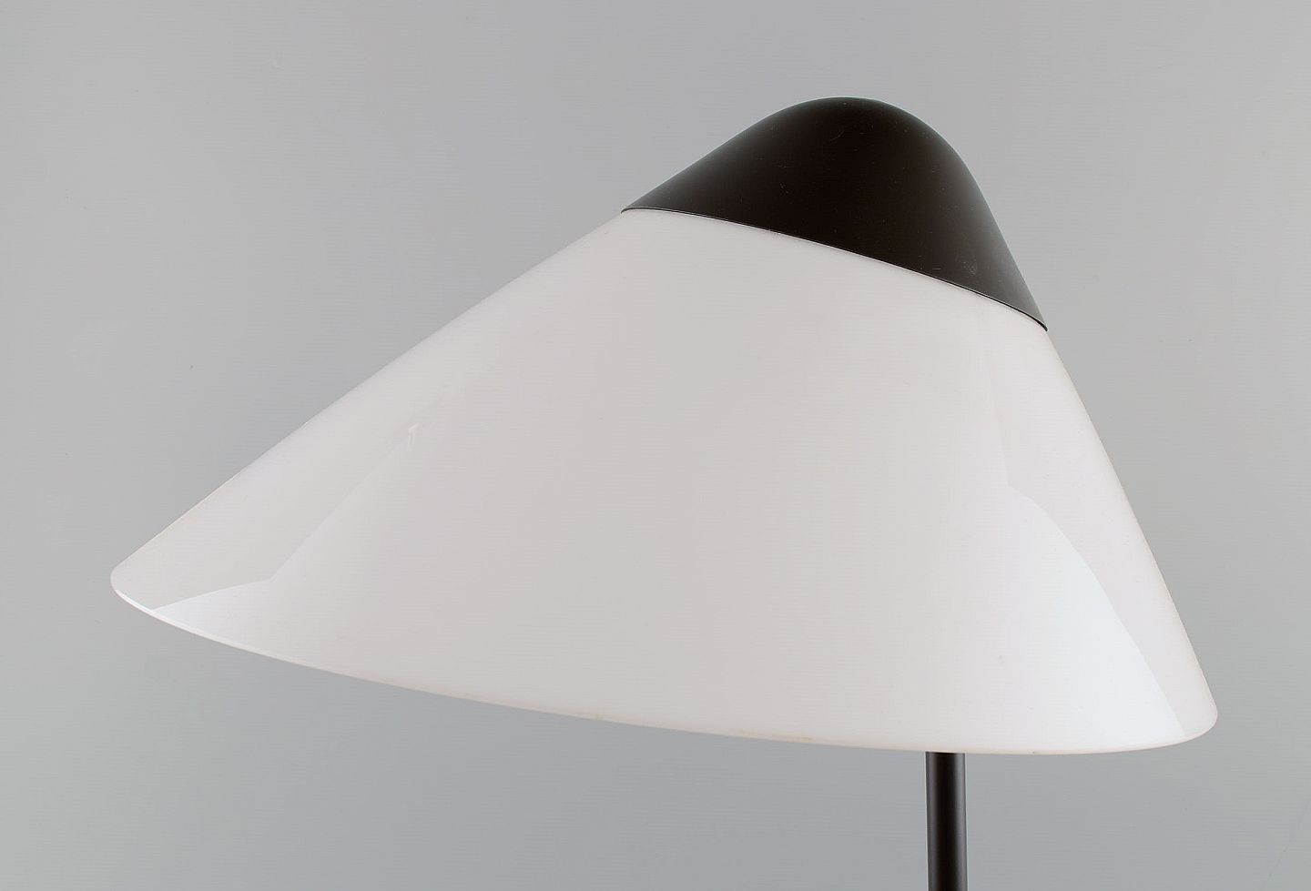 Hans J. Wegner. Opala bordlampe i lakeret aluminium og opalglas. Stor model. Sent 1900-tallet. Højde: 58 cm. Skærm diameter: 41,5 cm. Fod diameter: 21 cm. I flot stand.