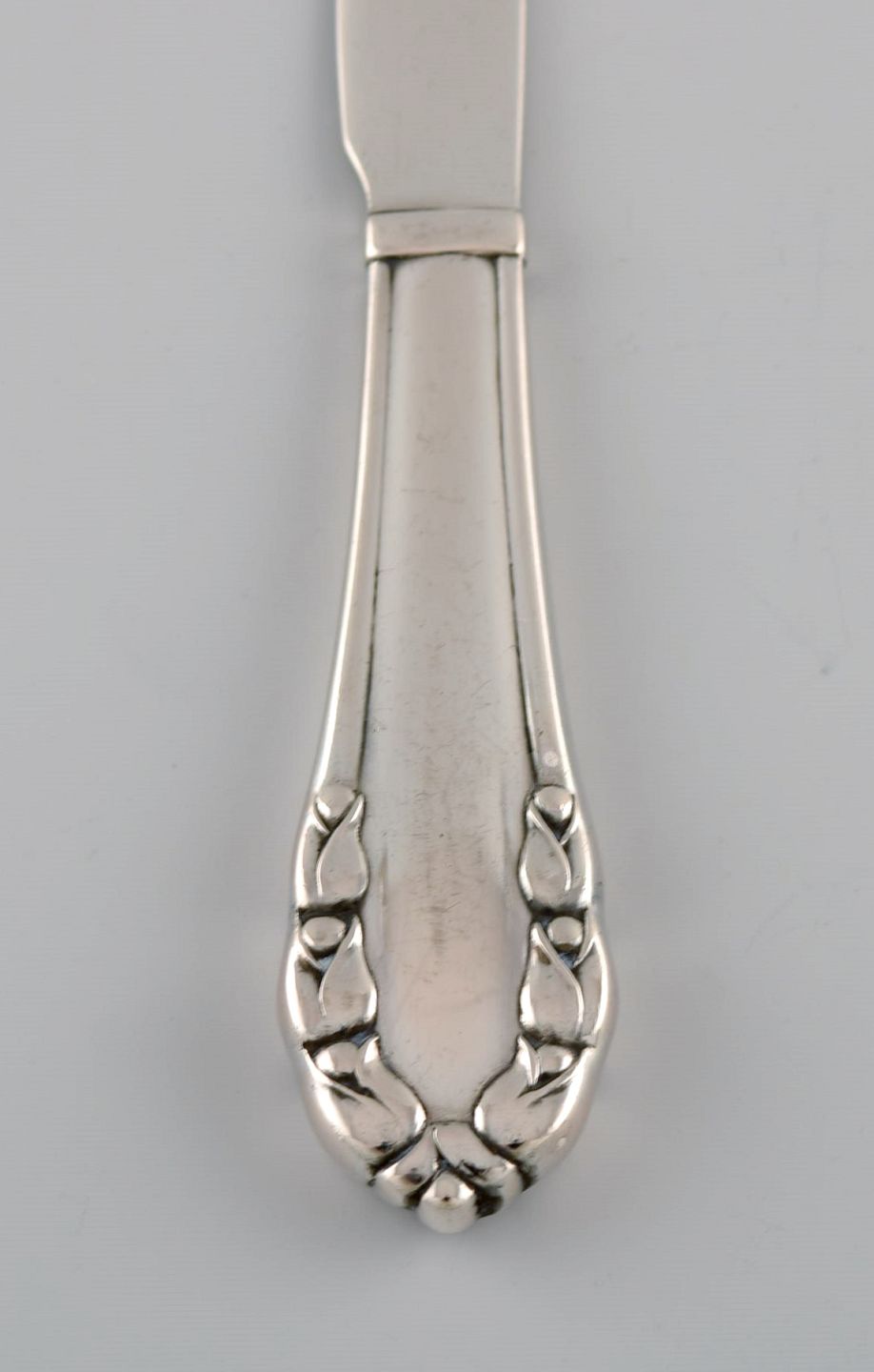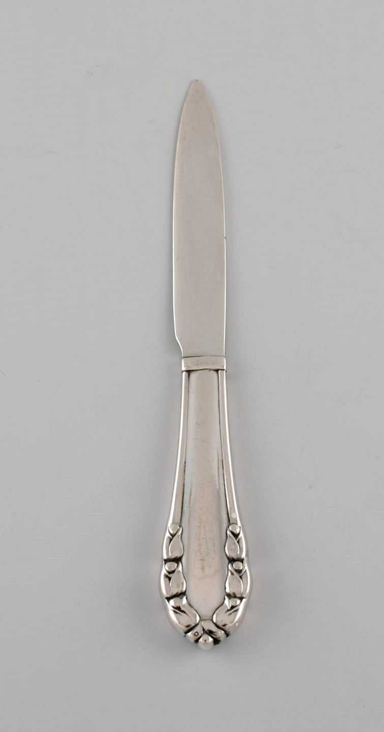 Otte tidlige Georg Jensen Liljekonval frugt / smørknive i helsølv (830). Dateret 1915-1930.