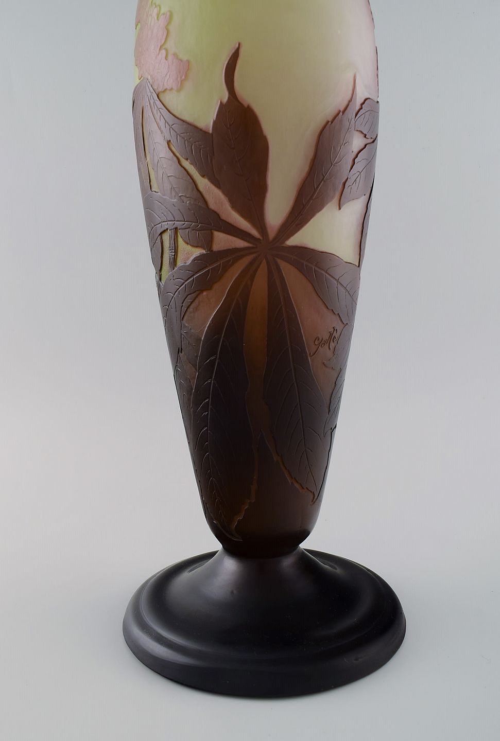 Kolossal antik Emile Gallé "Ricin" vase i matteret kunstglas med lysebrunt og sart pink overfang udskåret i form af blomster og bladværk. Sjælden model. Tidligt 1900-tallet.