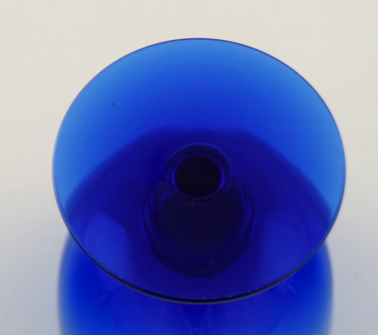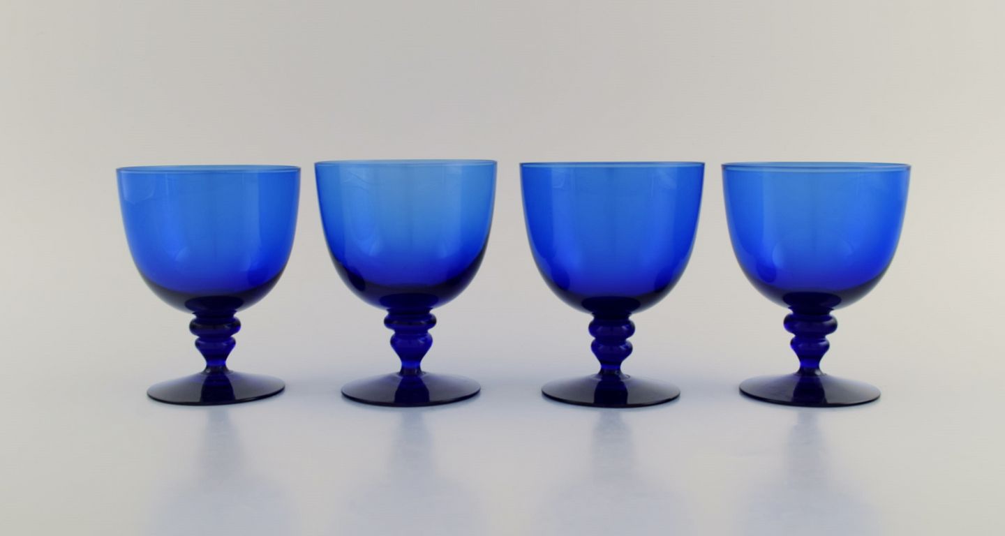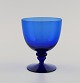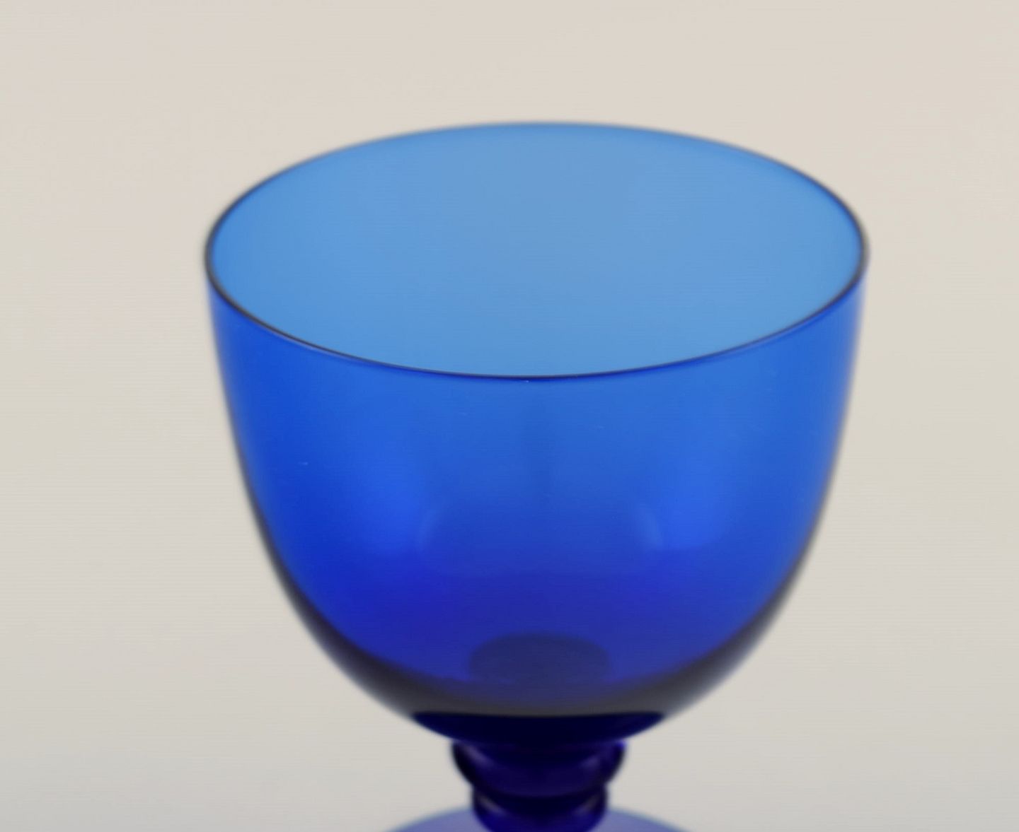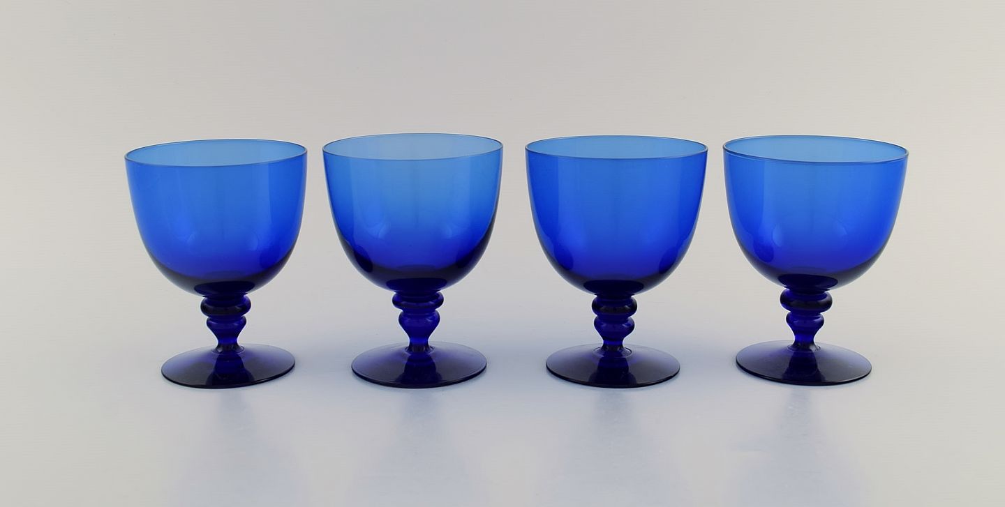 Monica Bratt for Reijmyre. Four wine glasses in blue mouth blown art glass. Swedish design, mid 20th century. Measures: 11 x 8.7 cm. In excellent condition.