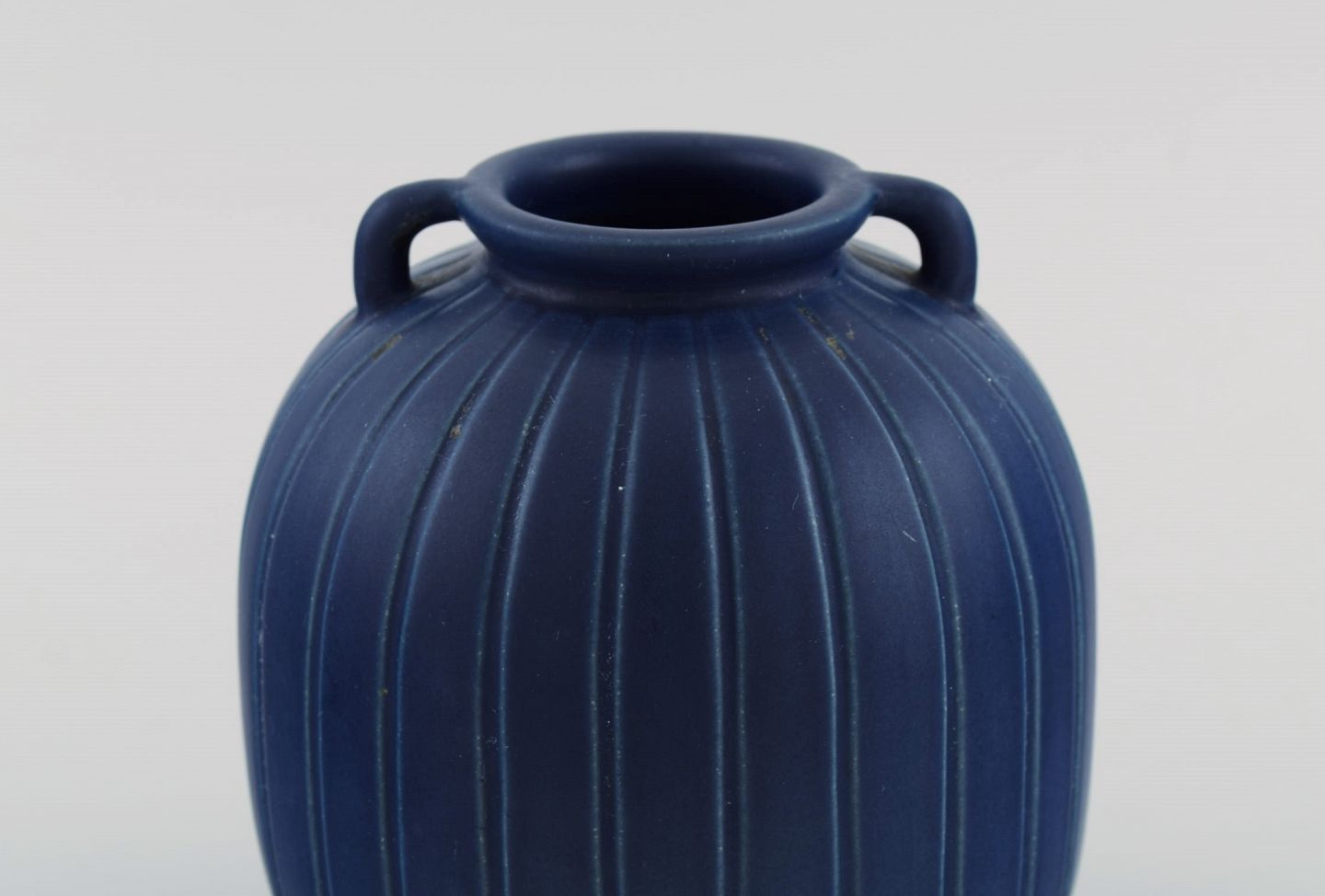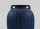 Ipsens enke, Danmark. Vase i glaseret keramik med rillet korpus og hanke. Smuk glasur i blå nuancer. 1920/30'erne. Modelnummer 14.
