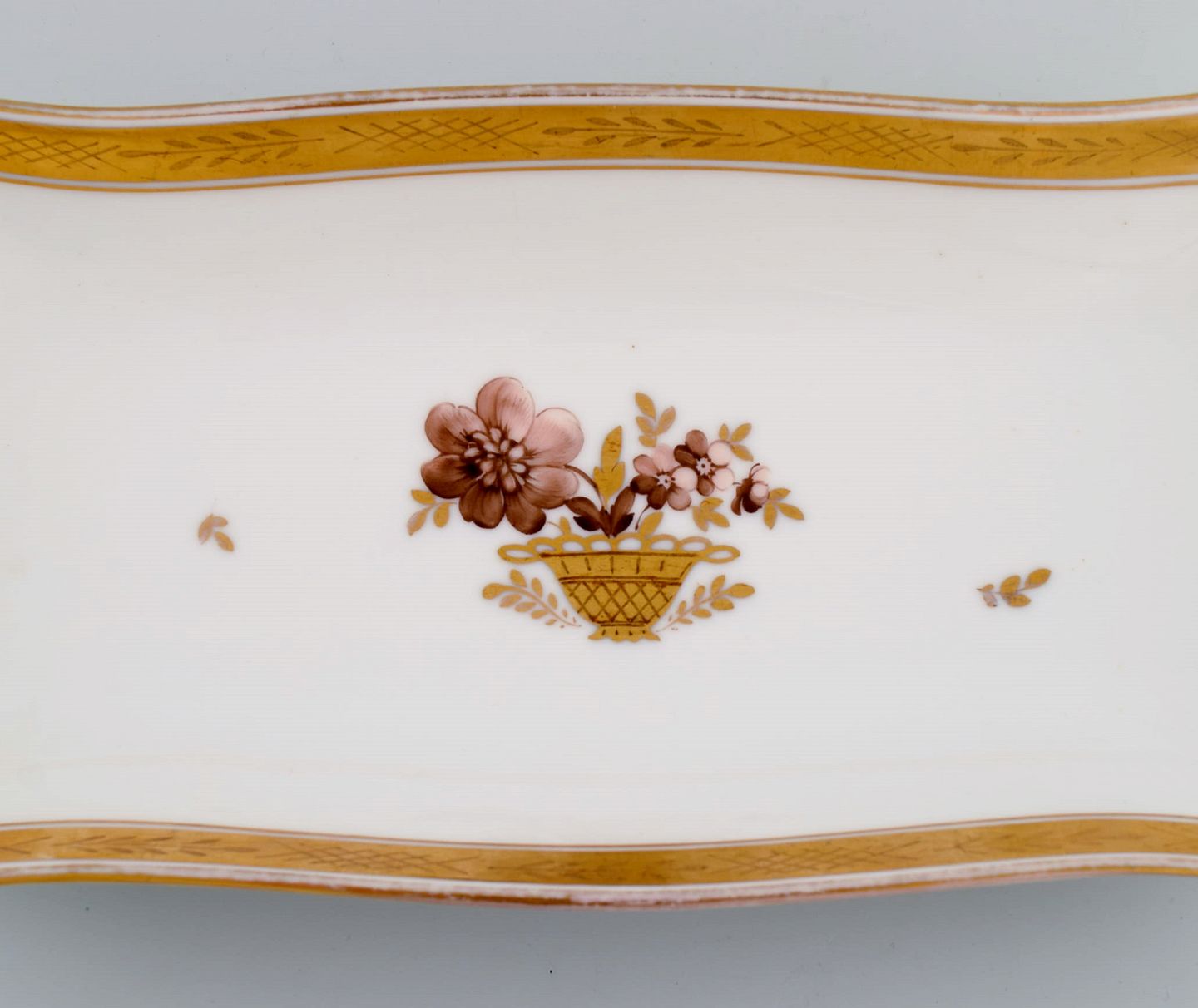 Aflangt Royal Copenhagen Guldkurv serveringsfad i porcelæn med blomster og gulddekoration. Modelnummer 595/9442. Tidligt 1900-tallet.