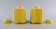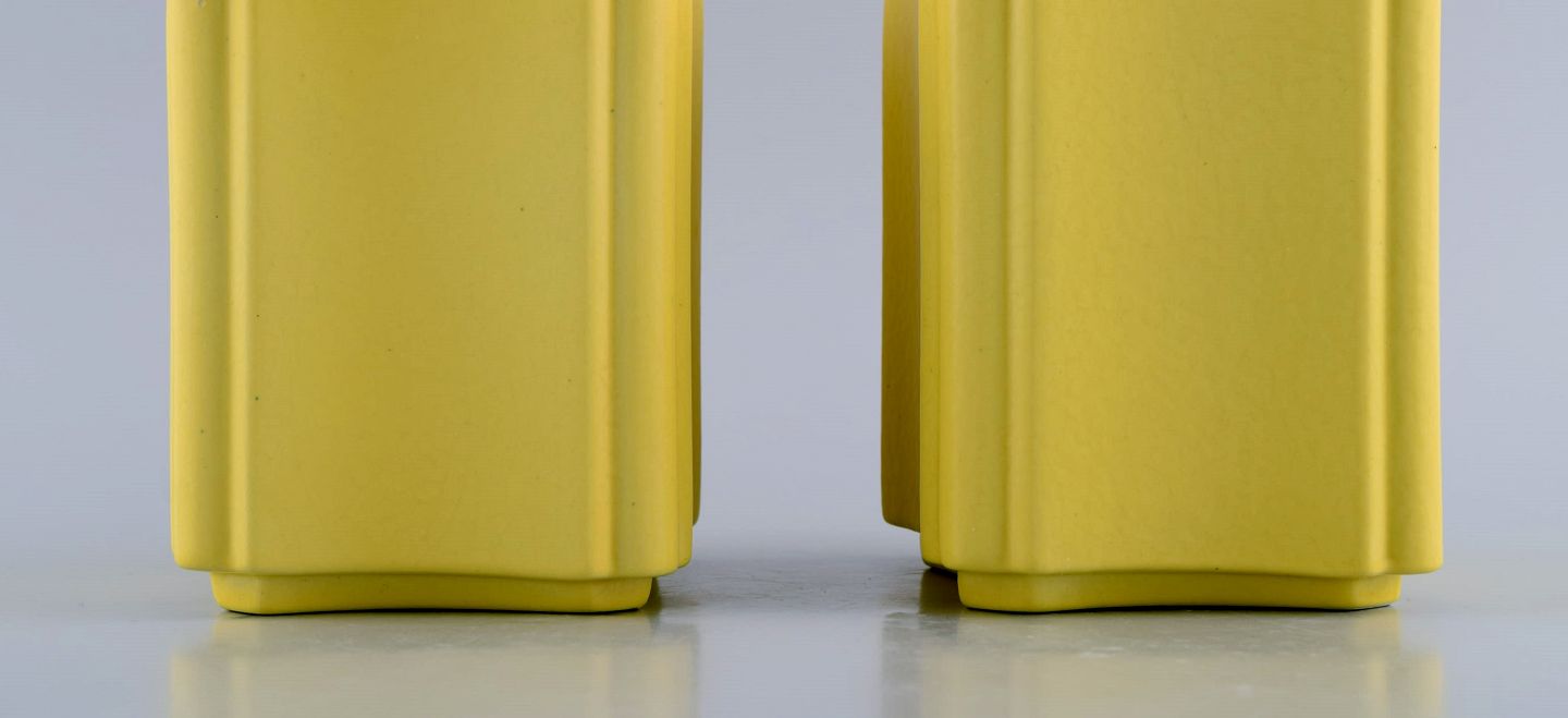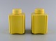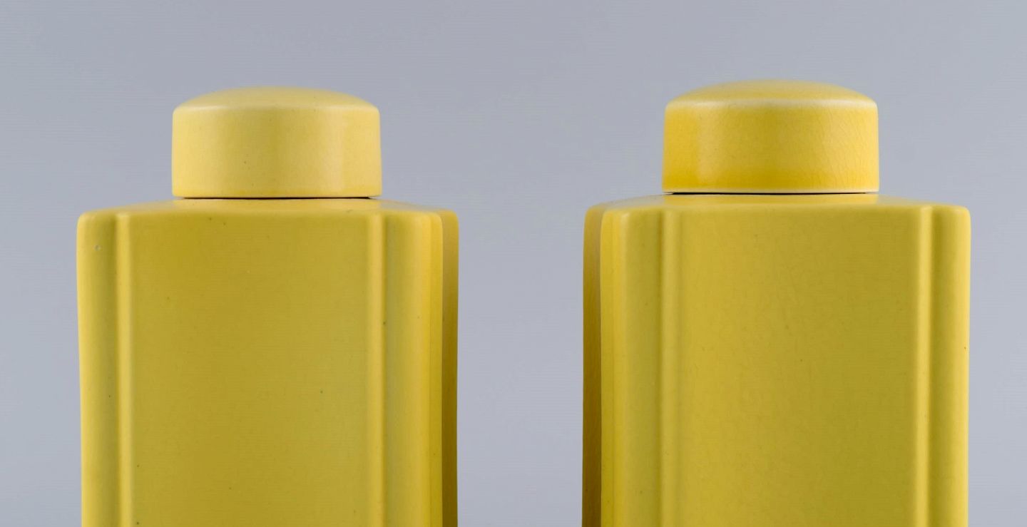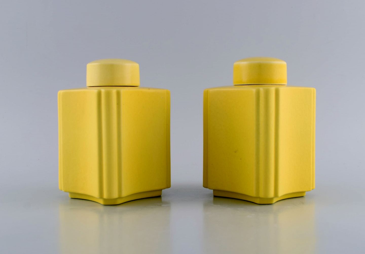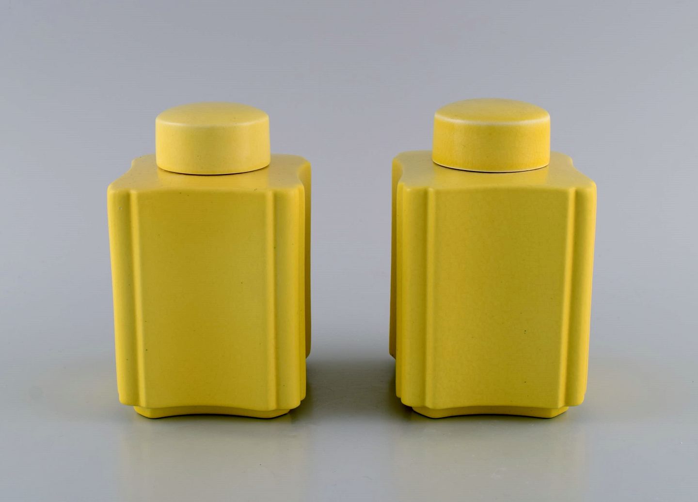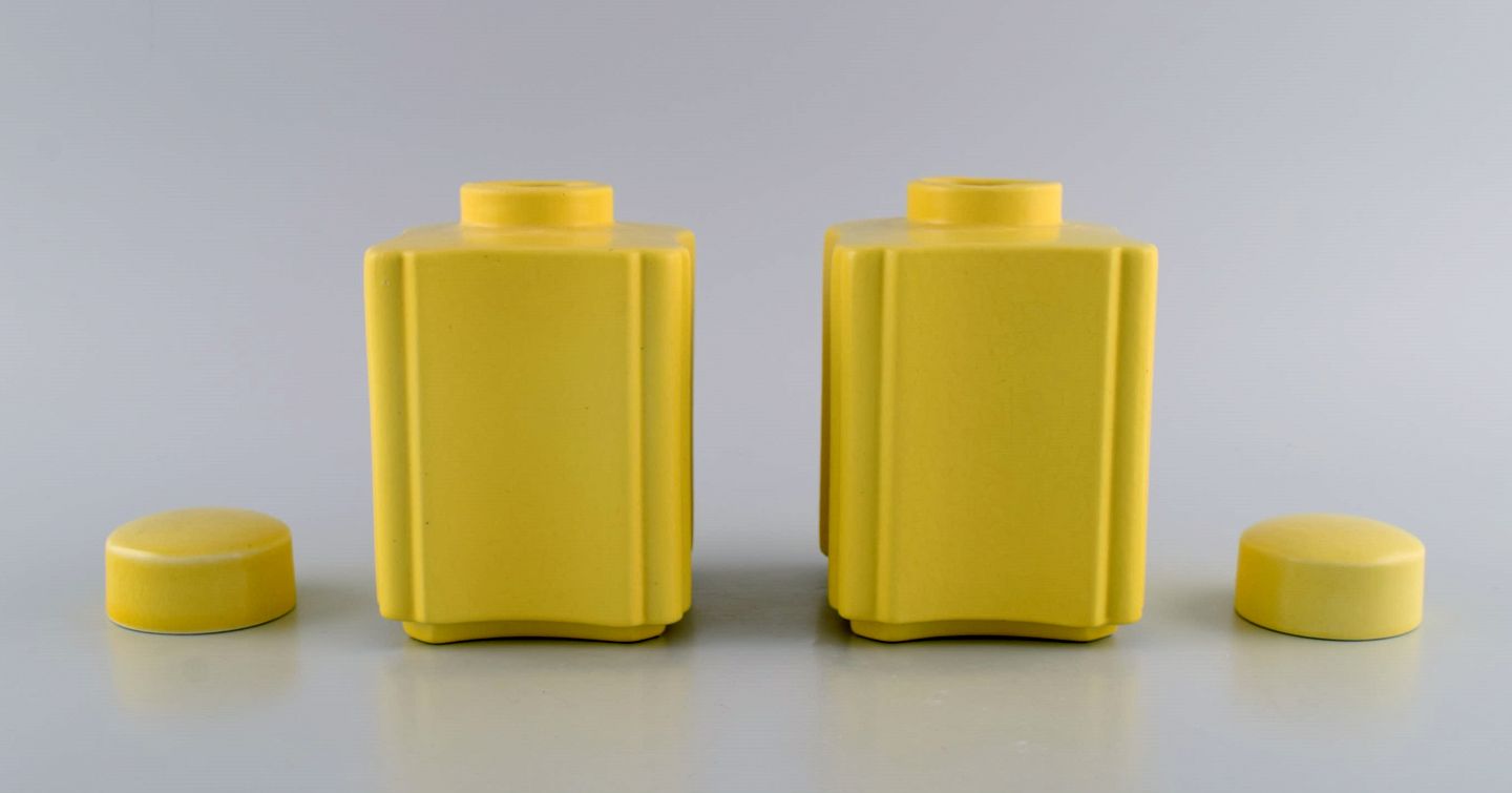 Wilhelm Kåge (1889-1960) for Gustavsberg. Et par sjældne art deco tedåser i gulglaseret stentøj. 1920/30'erne. Måler: 14 x 9 cm. I flot stand. Stemplet.