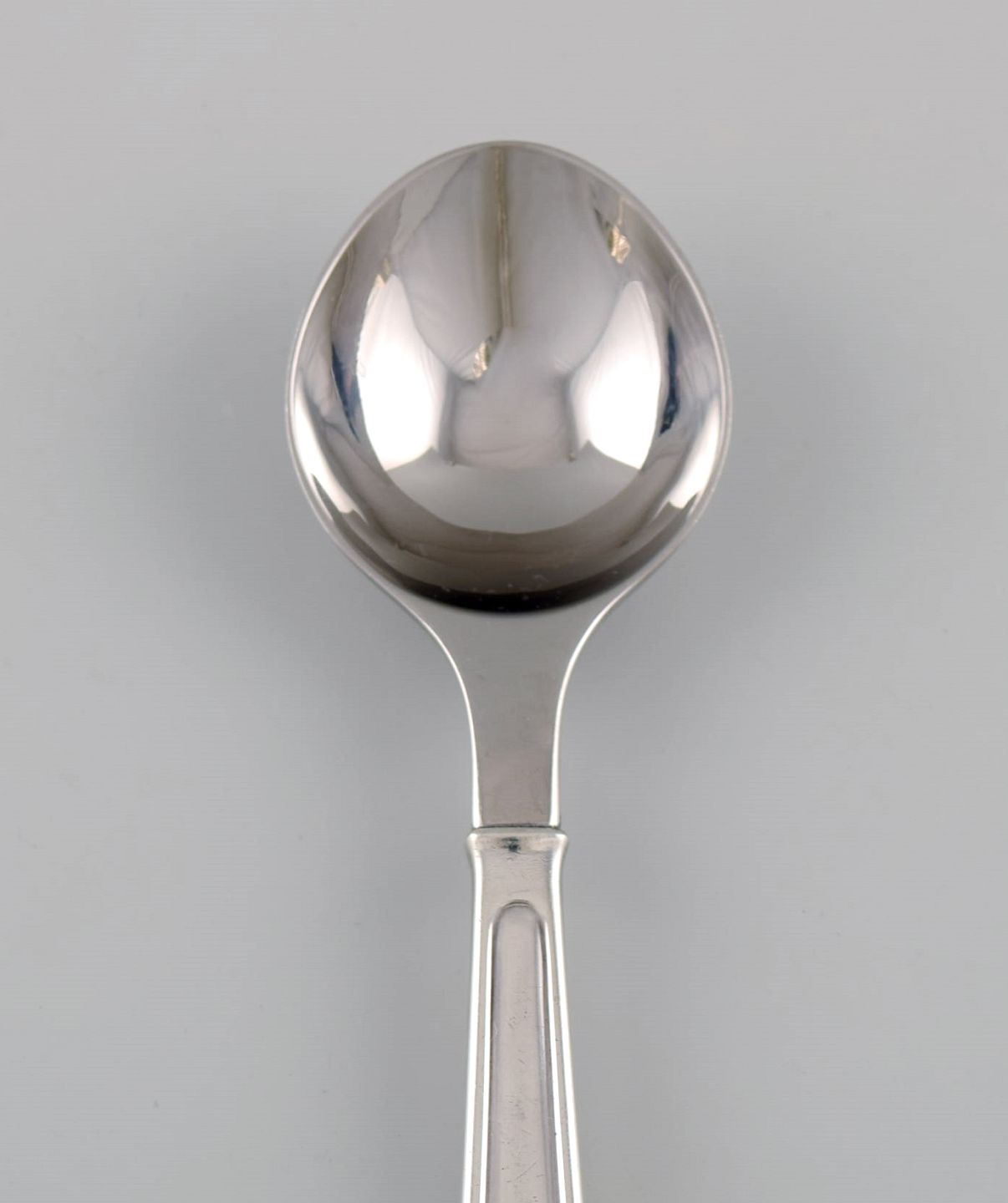 Rare Georg Jensen Koppel cutlery. Dessert spoon in sterling silver and stainless steel. Five pieces in stock.