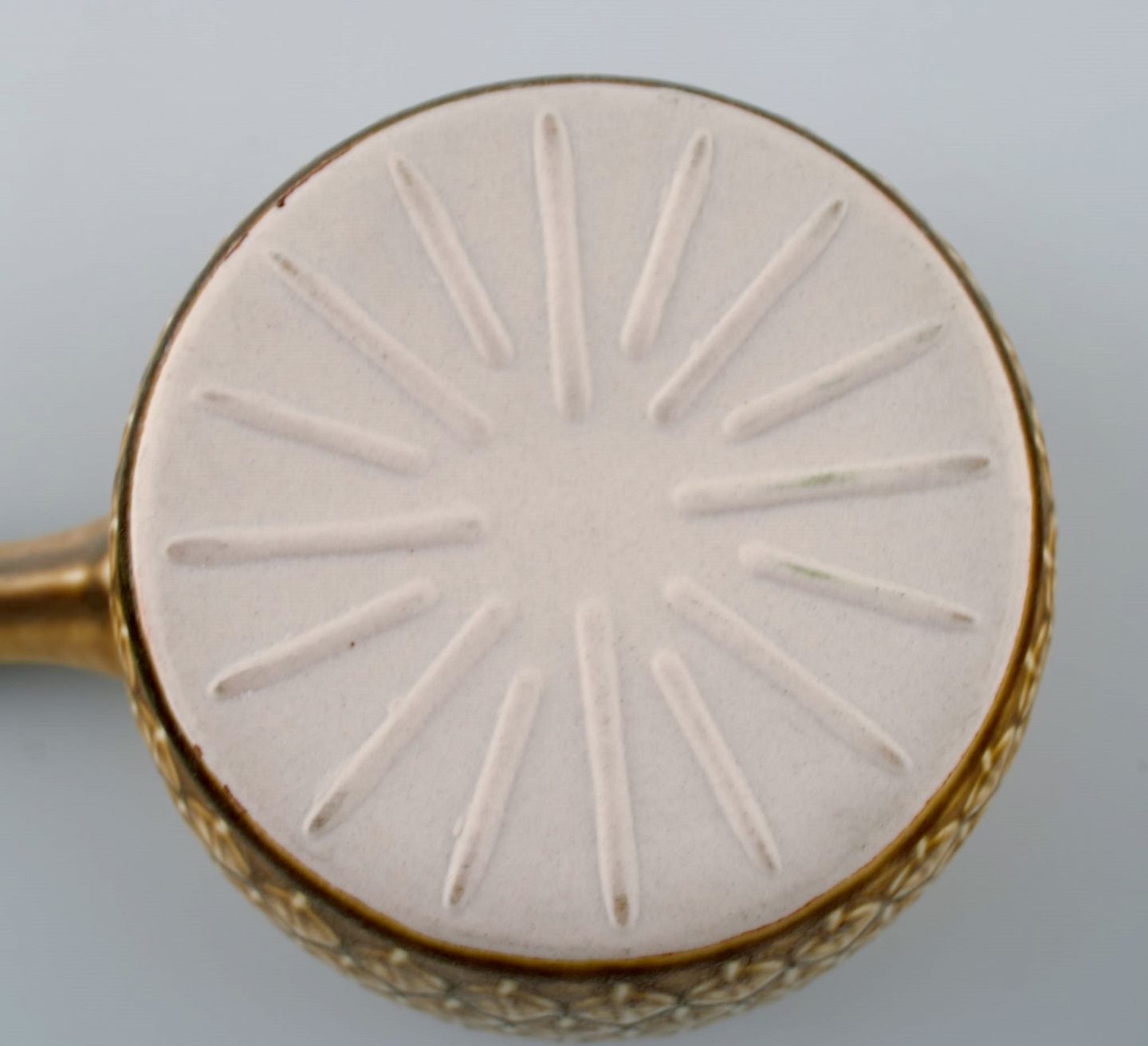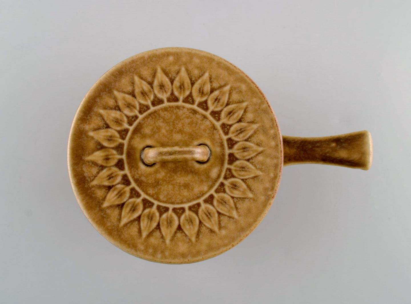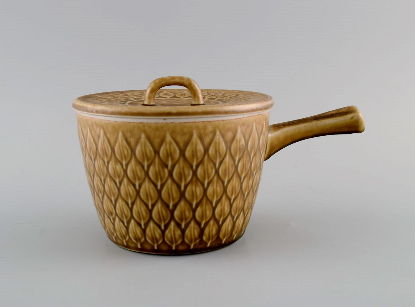 Jens H. Quistgaard (1919-2008) for Bing & Grøndahl / Nissen Kronjyden. Relief gryde med hank i glaseret stentøj. Smuk glasur i sennepsgule nuancer. 1960'erne.