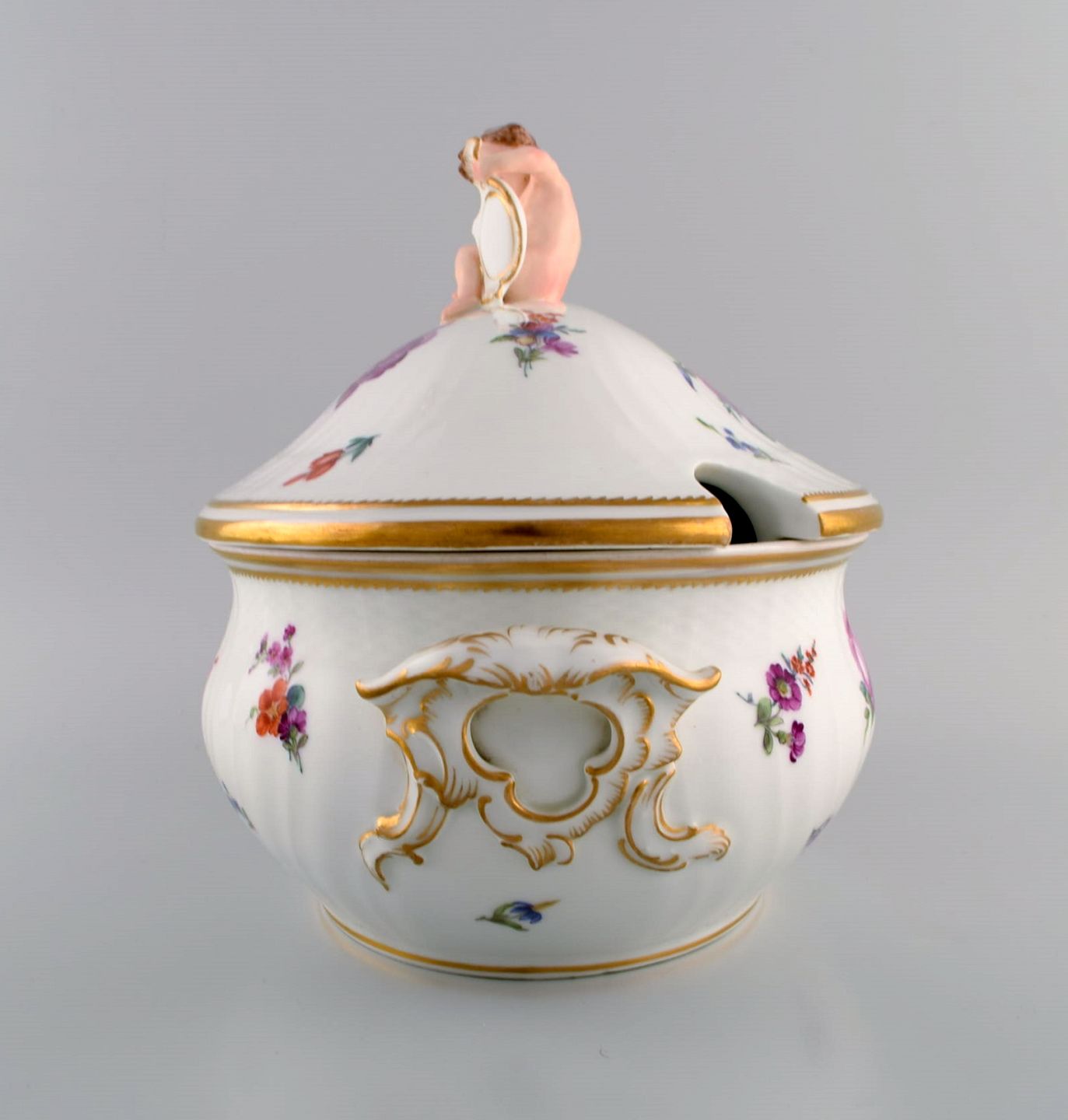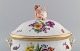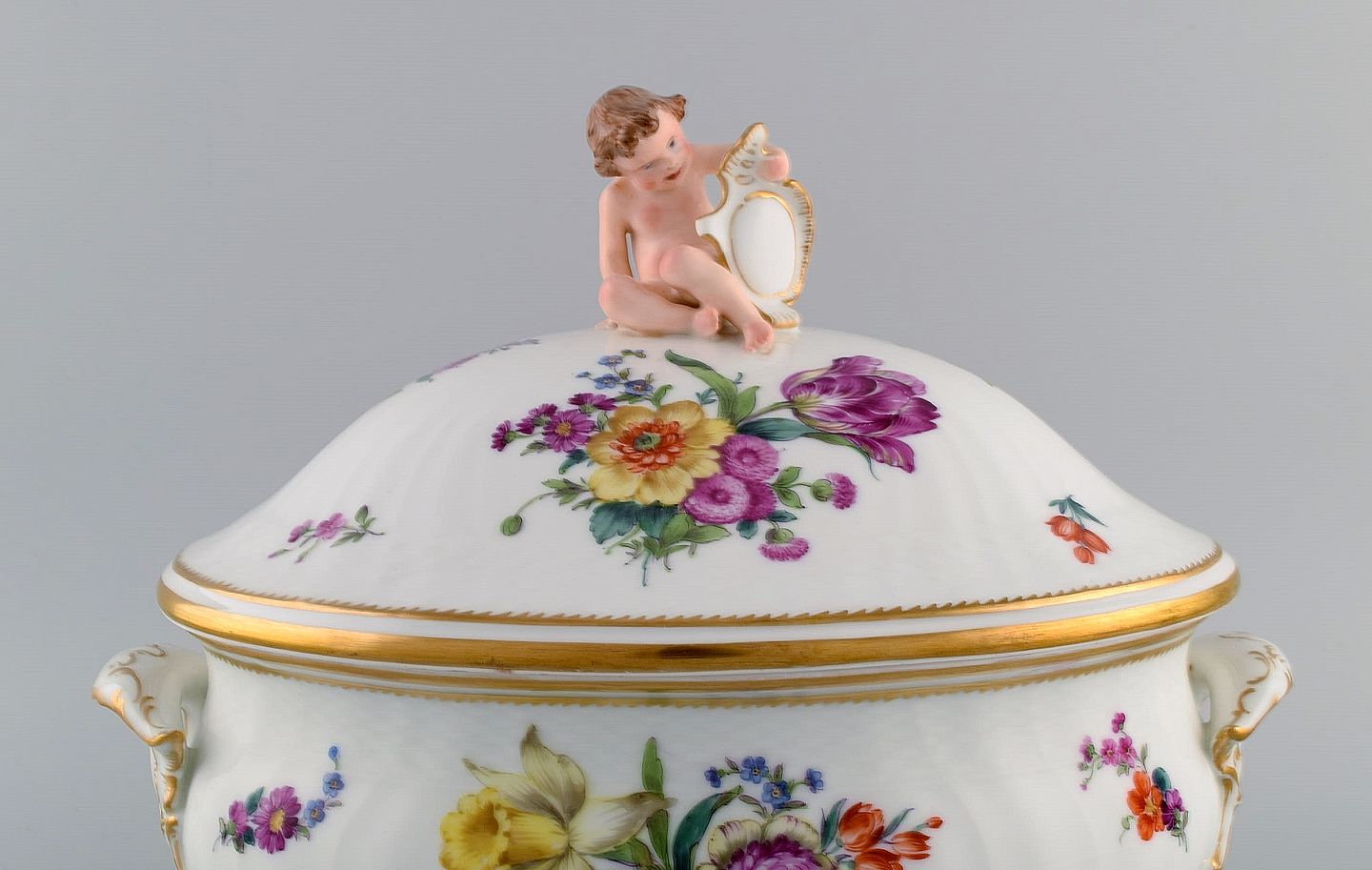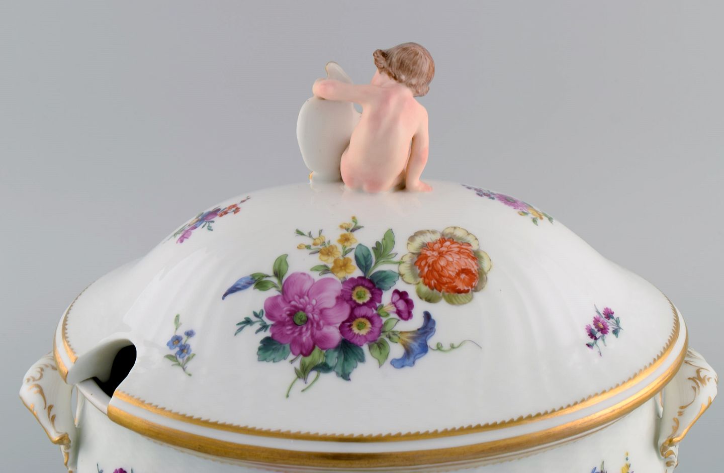 Royal Copenhagen Saksisk Blomst. Stor suppeterrin i håndmalet porcelæn med blomster og gulddekoration. Modeleret med putti på toppen. Modelnummer 4/1669. Tidligt 1900-tallet.