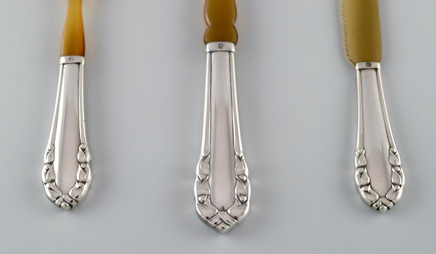 Tre tidlige dele Georg Jensen Liljekonval i sølv (830) og horn. Dateret 1915-1930. Spade længde: 20,5 cm. I flot stand. Stemplet.