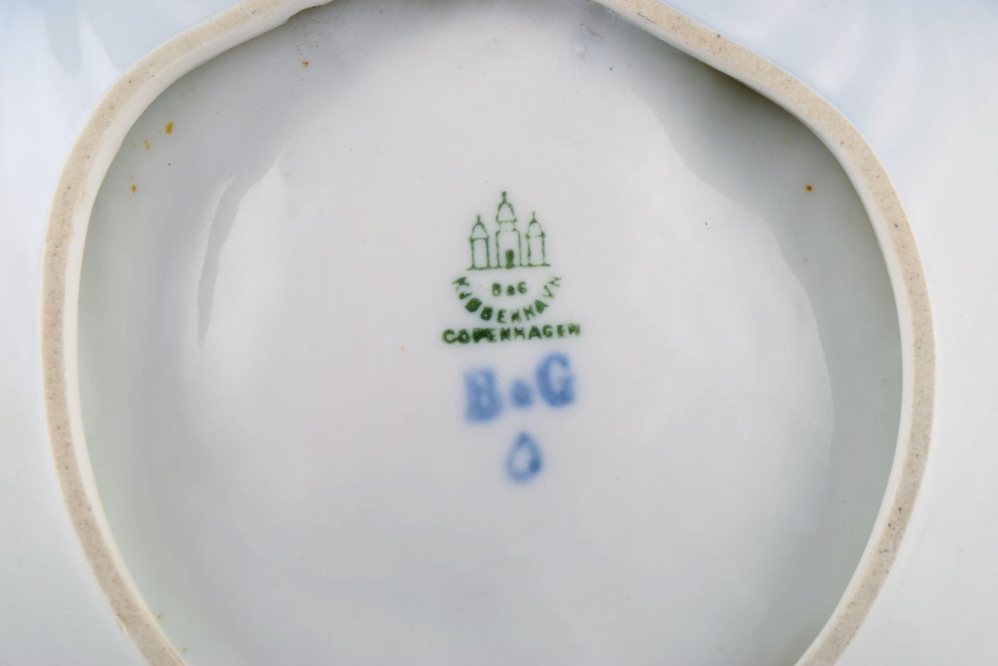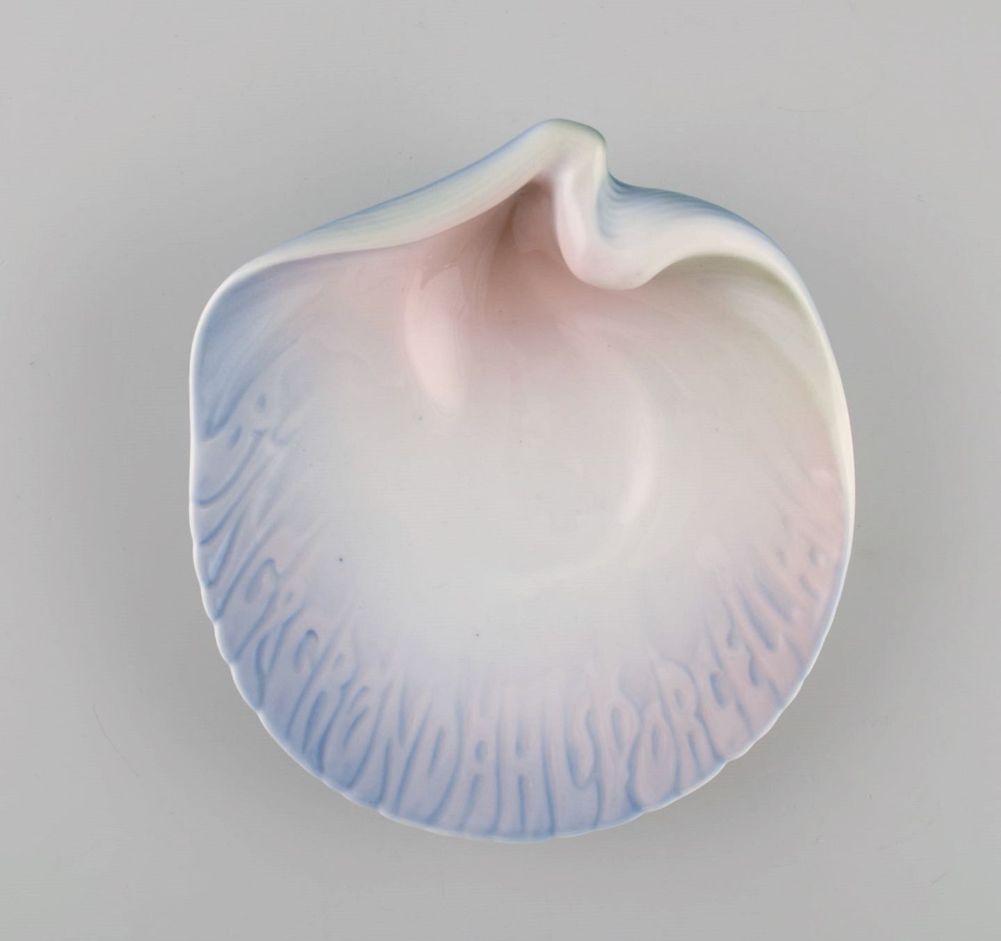 Bing & Grøndahl art nouveau asiet formet som muslingeskal. Tekst modelleret i relief "Bing & Grøndal's porcelæn". Dateret 1914-1915. Måler: 16,5 x 16 cm. I flot stand. Stemplet.