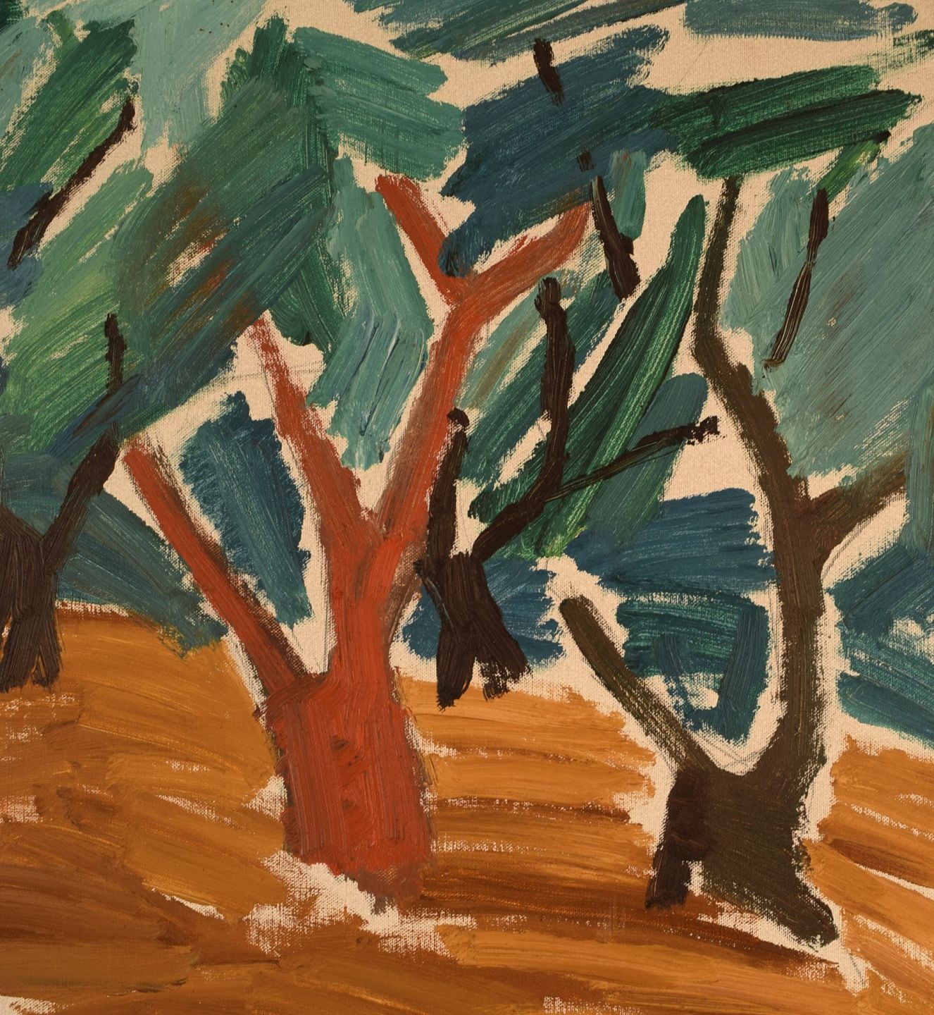 B. Stålfors, svensk kunstner. Olie på lærred. Modernistisk skovlandskab. Dateret 1961.