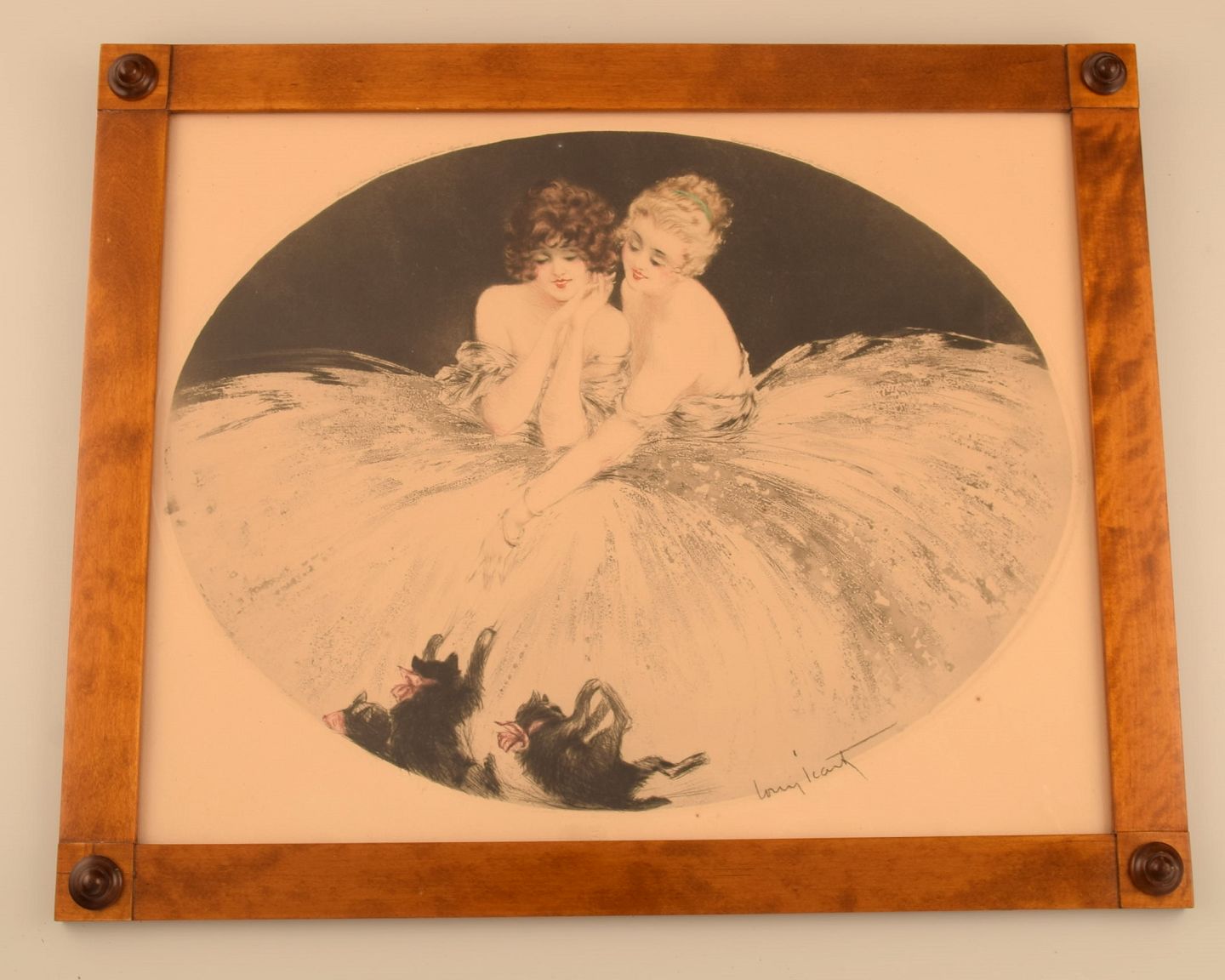 Louis Icart (1888-1950). Radering på papir. To unge kvinder leger med killinger. 1930'erne.