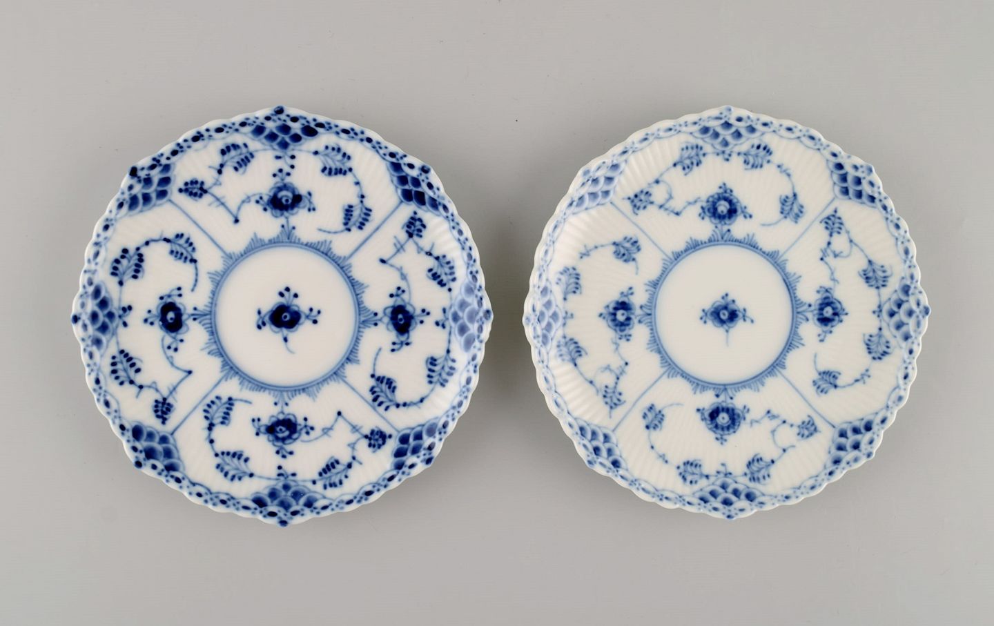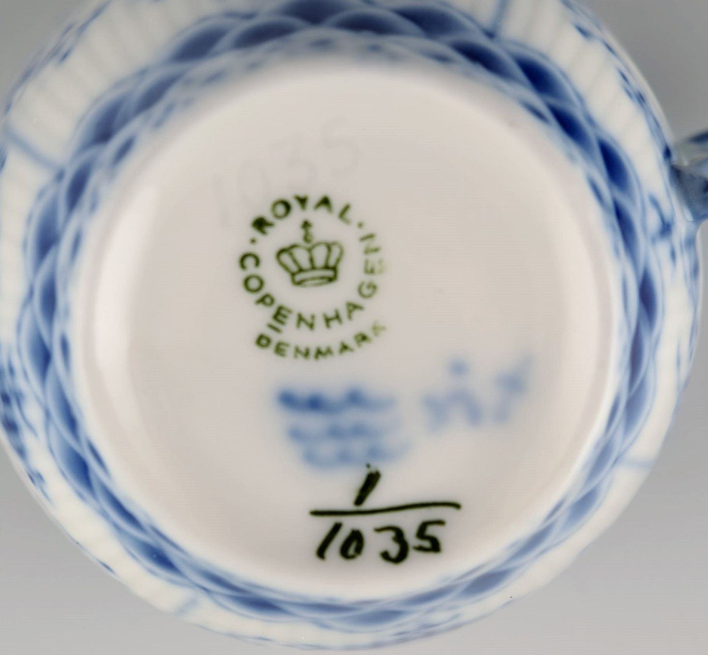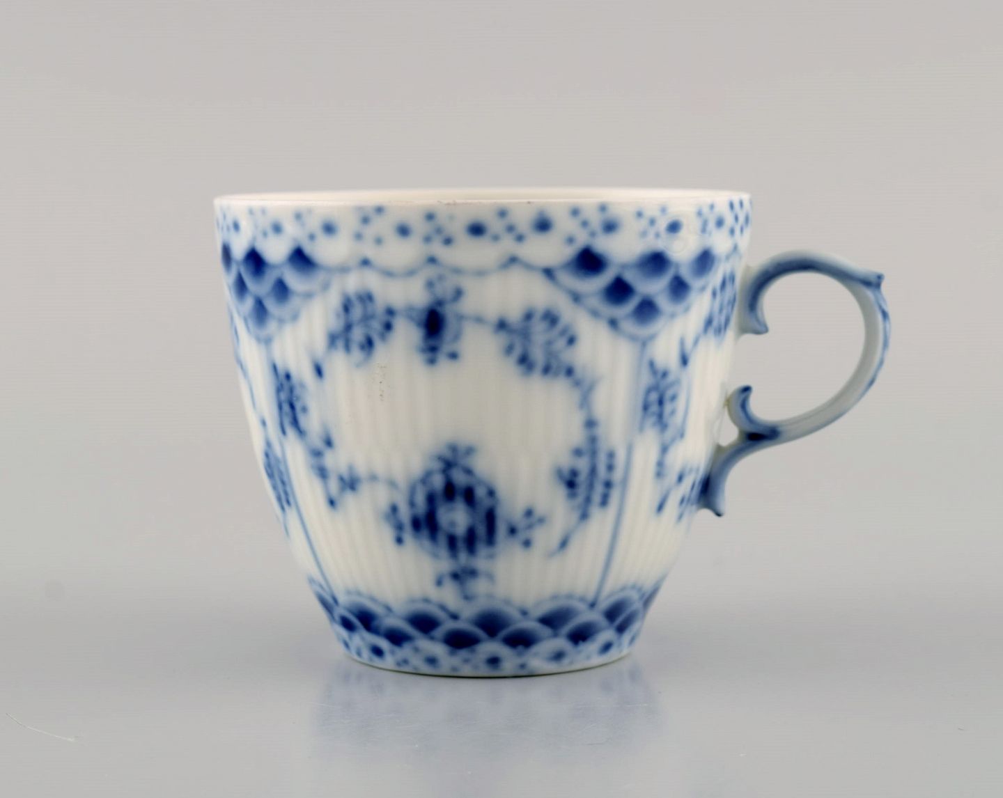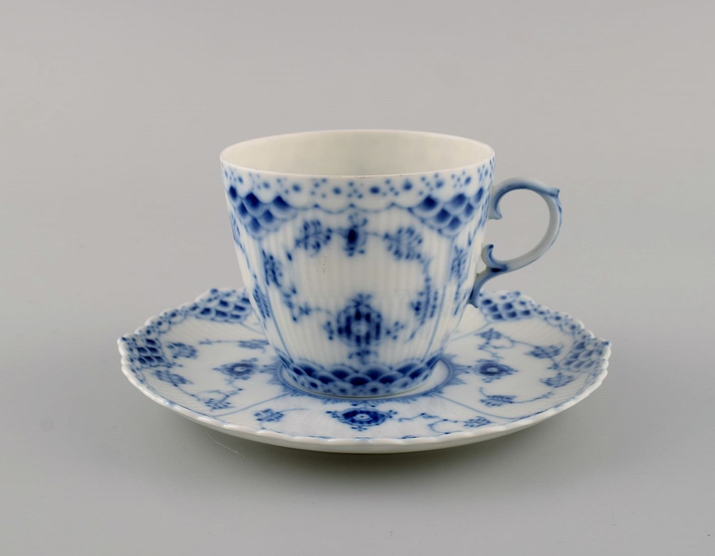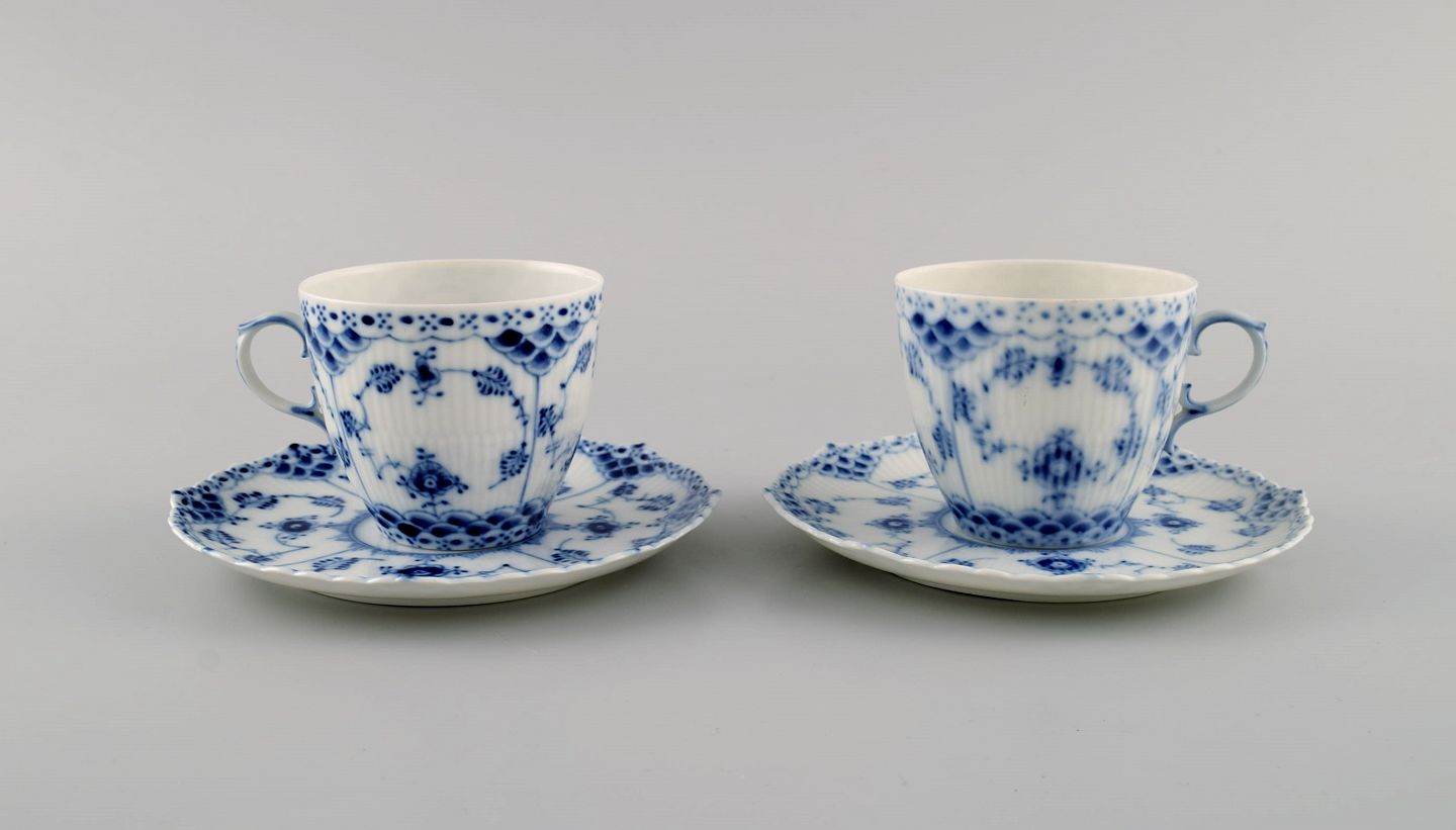To Royal Copenhagen Musselmalet Helblonde kaffekopper med underkopper. Modelnummer 1/1035. Koppen måler: 7,5 x 6,5 cm. Underkop diameter: 14 cm. I flot stand. Stemplet. 1. Sortering.