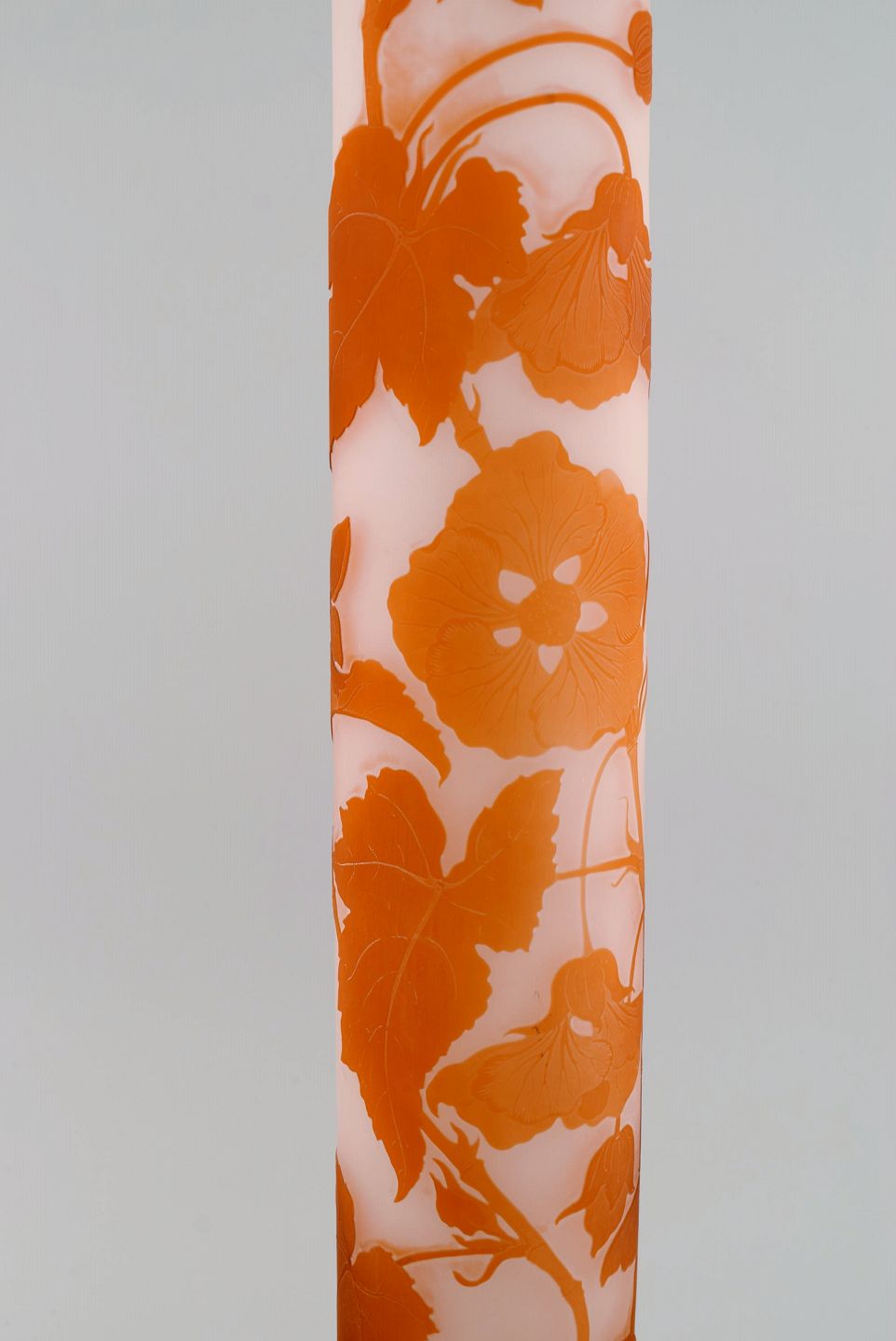 Kolossal antik Emile Gallé vase i matteret kunstglas med orange overfang udskåret i form af blomster og bladværk. Tidligt 1900-tallet. Museumskvalitet. Måler: 61 x 19 cm. I flot stand. Signeret.
