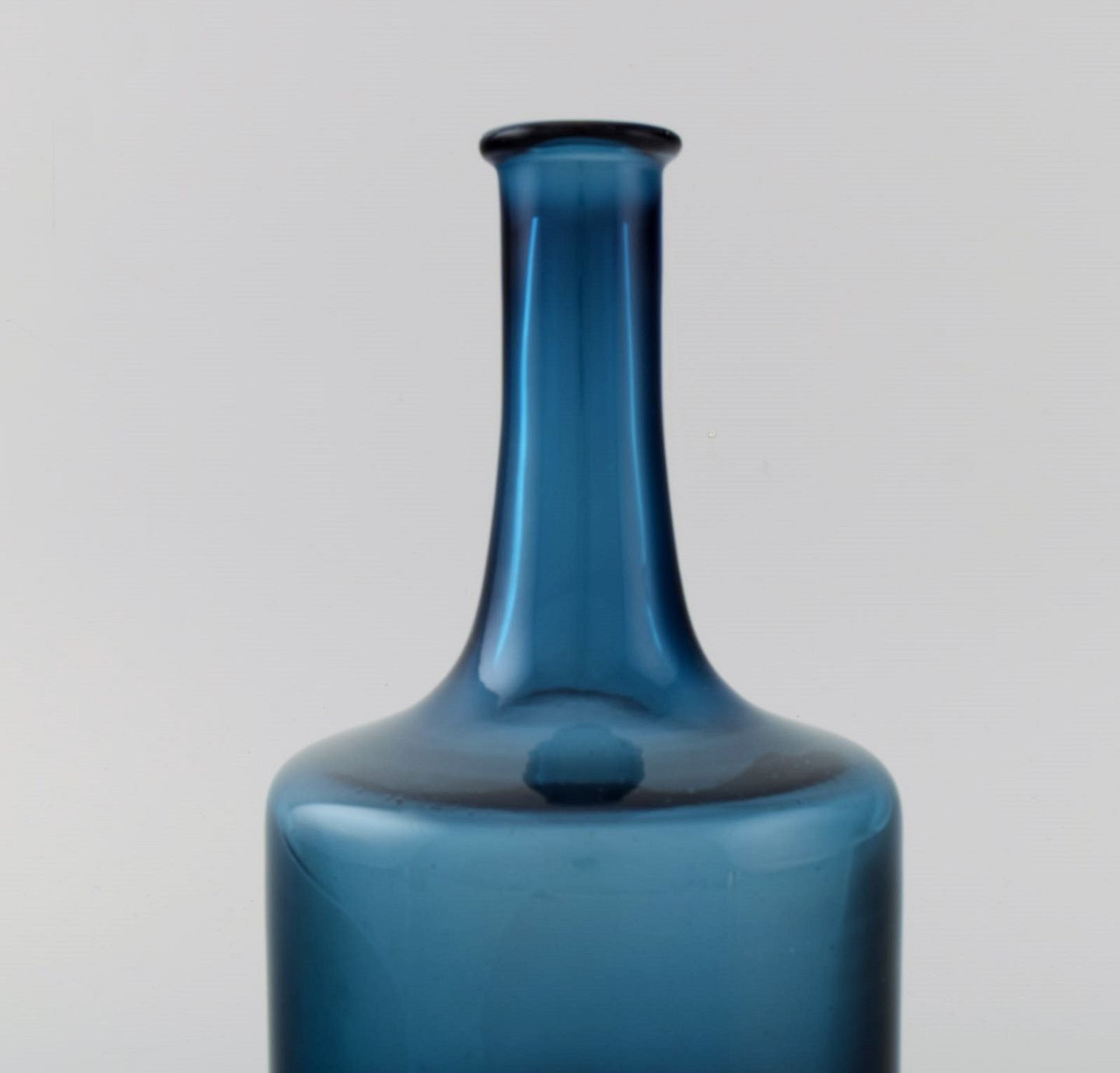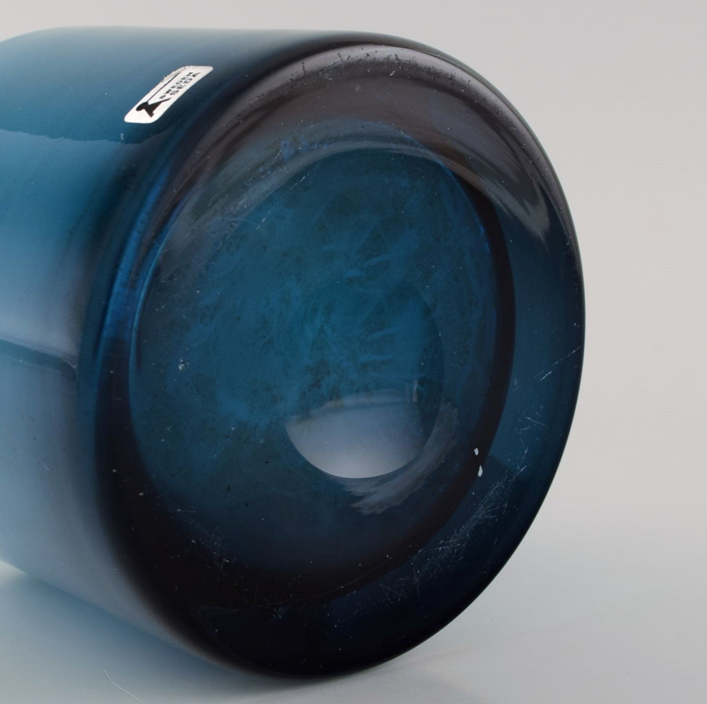 Åseda Glasbruk, Sverige. Smalhalset vase i blåt mundblæst kunstglas. 1970'erne.