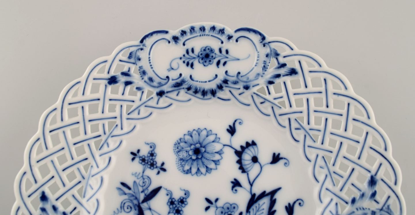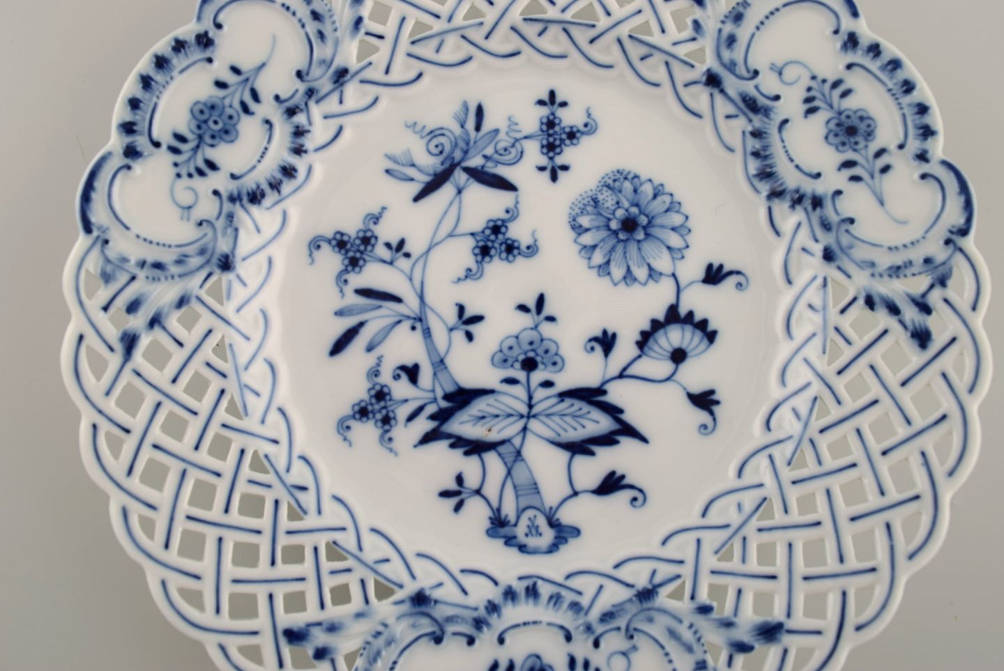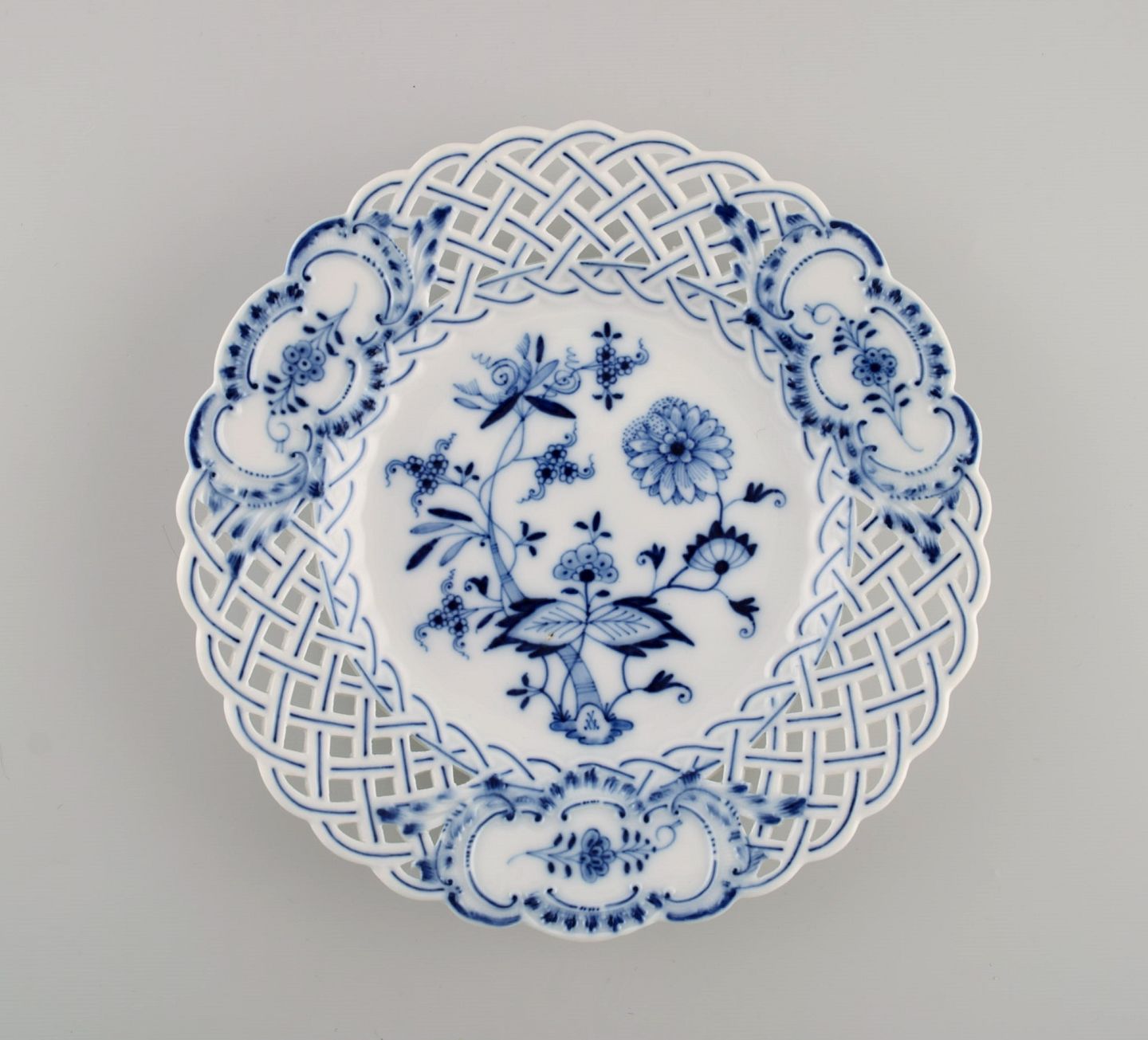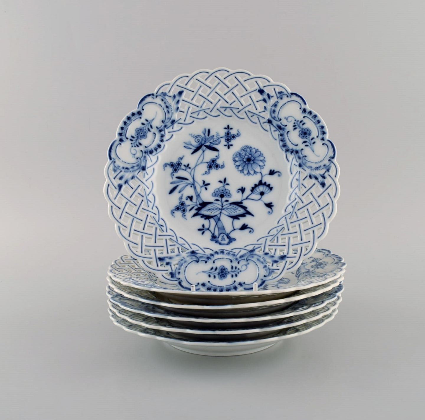 Seks Meissen Løgmønstret tallerkener i gennembrudt porcelæn. Tidligt 1900-tallet. Diameter: 20,5 cm. I flot stand. Stemplet. 1. Sortering.