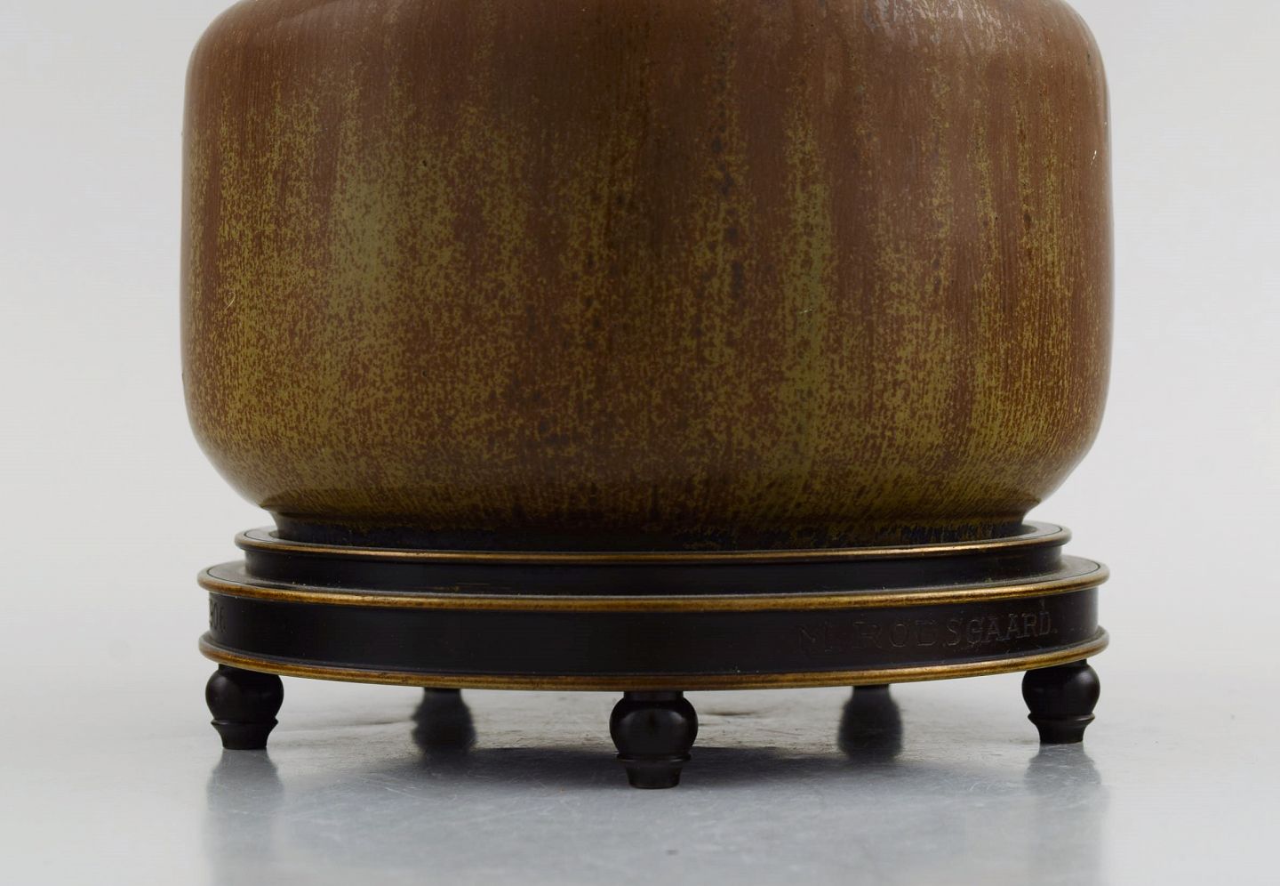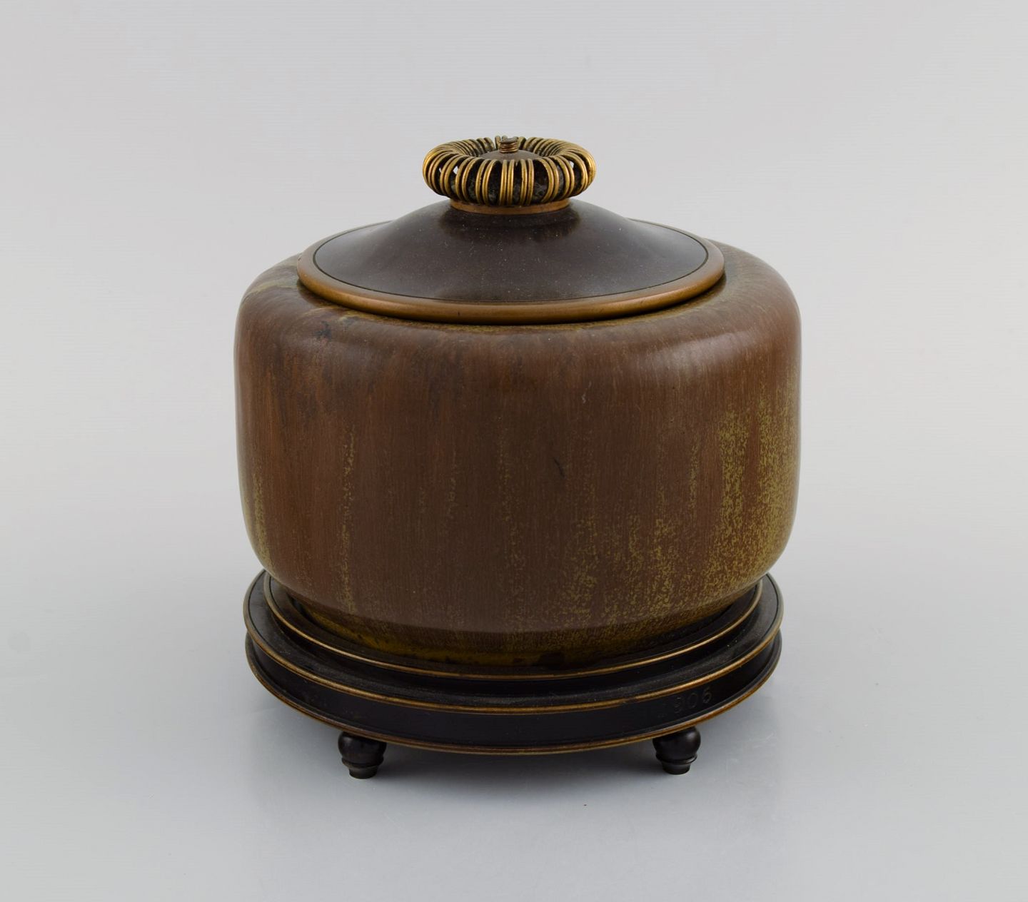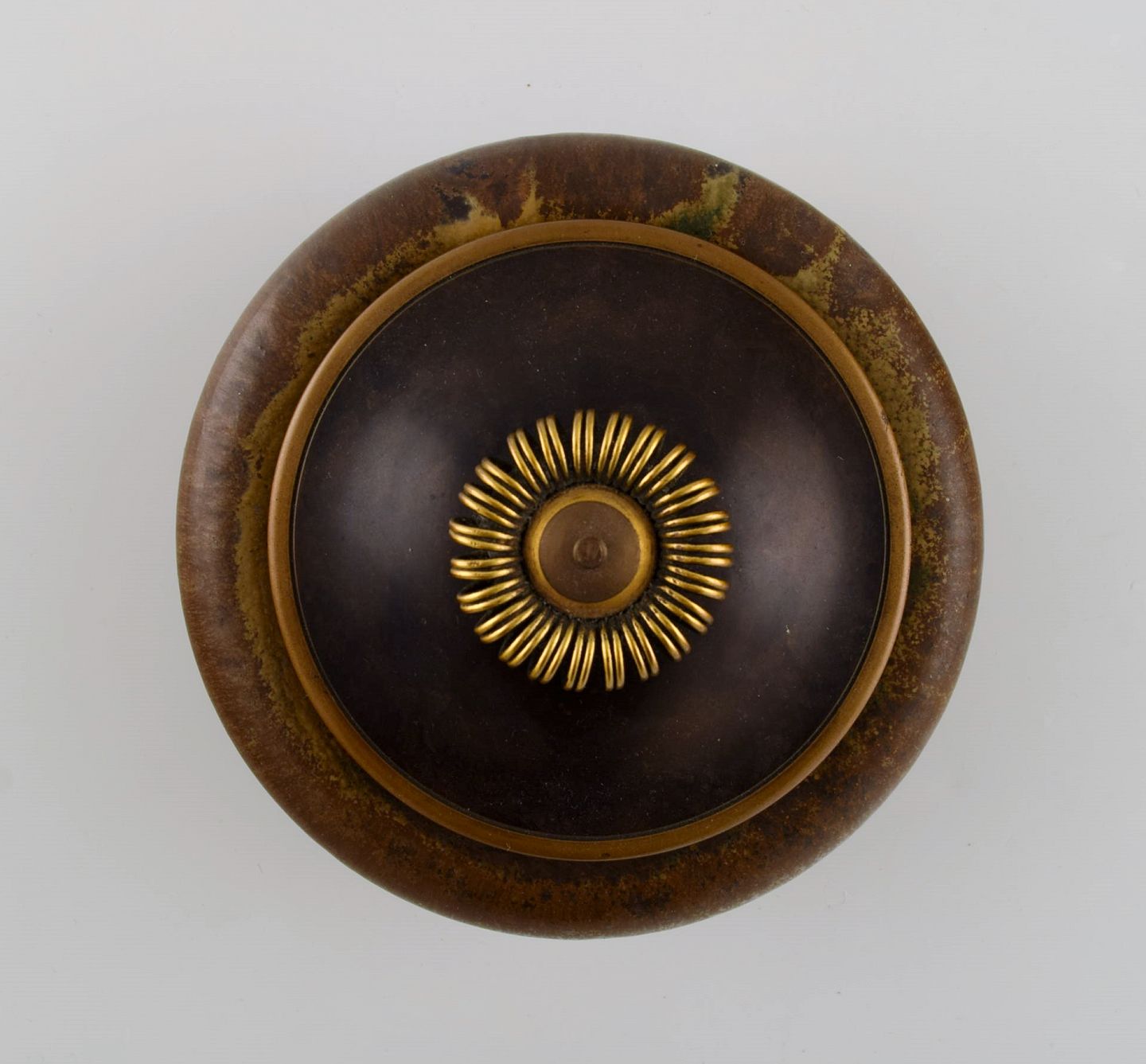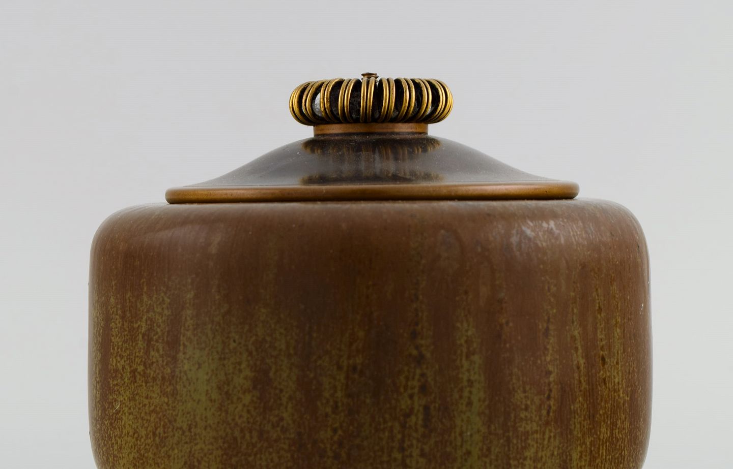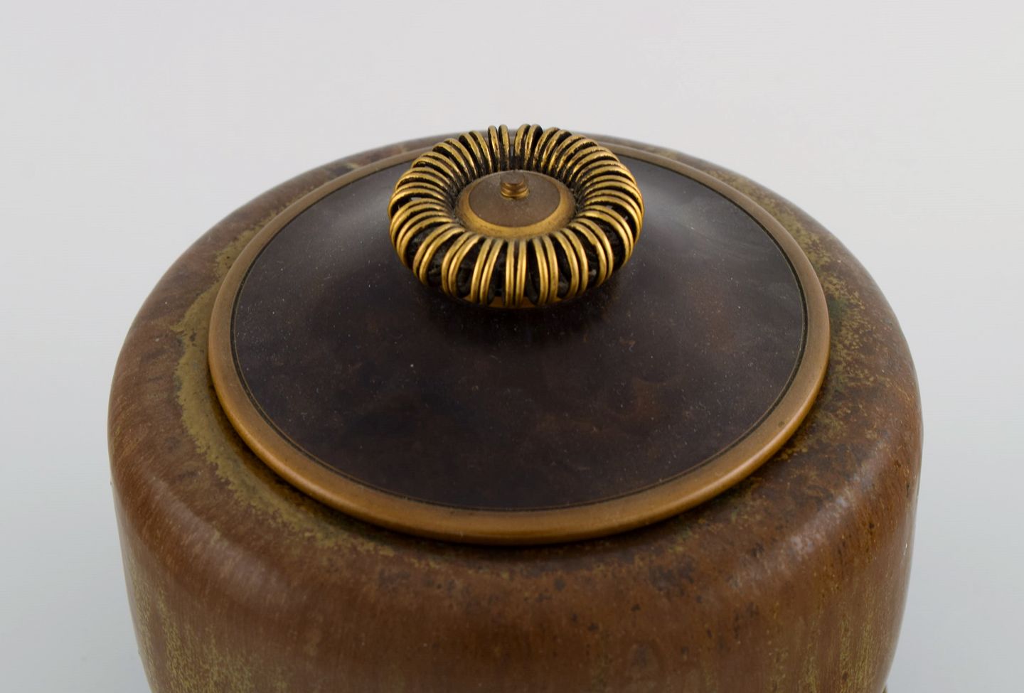 Arne Bang (1901-1983), Danmark. Vase i glaseret stentøj med bronzelåg og stand. Smuk glasur i lyse jord nuancer. Modelnummer 29. Midt 1900-tallet. Måler: 14,5 x 14,5 cm. I flot stand. Signeret i monogram.