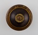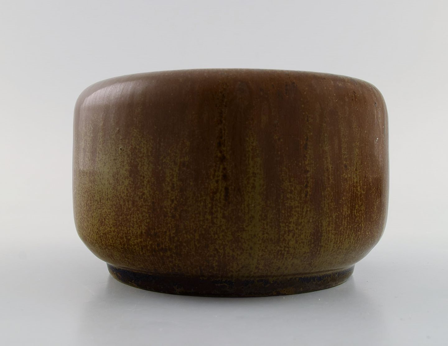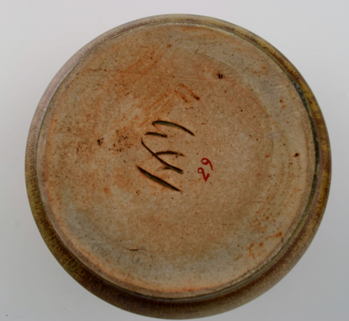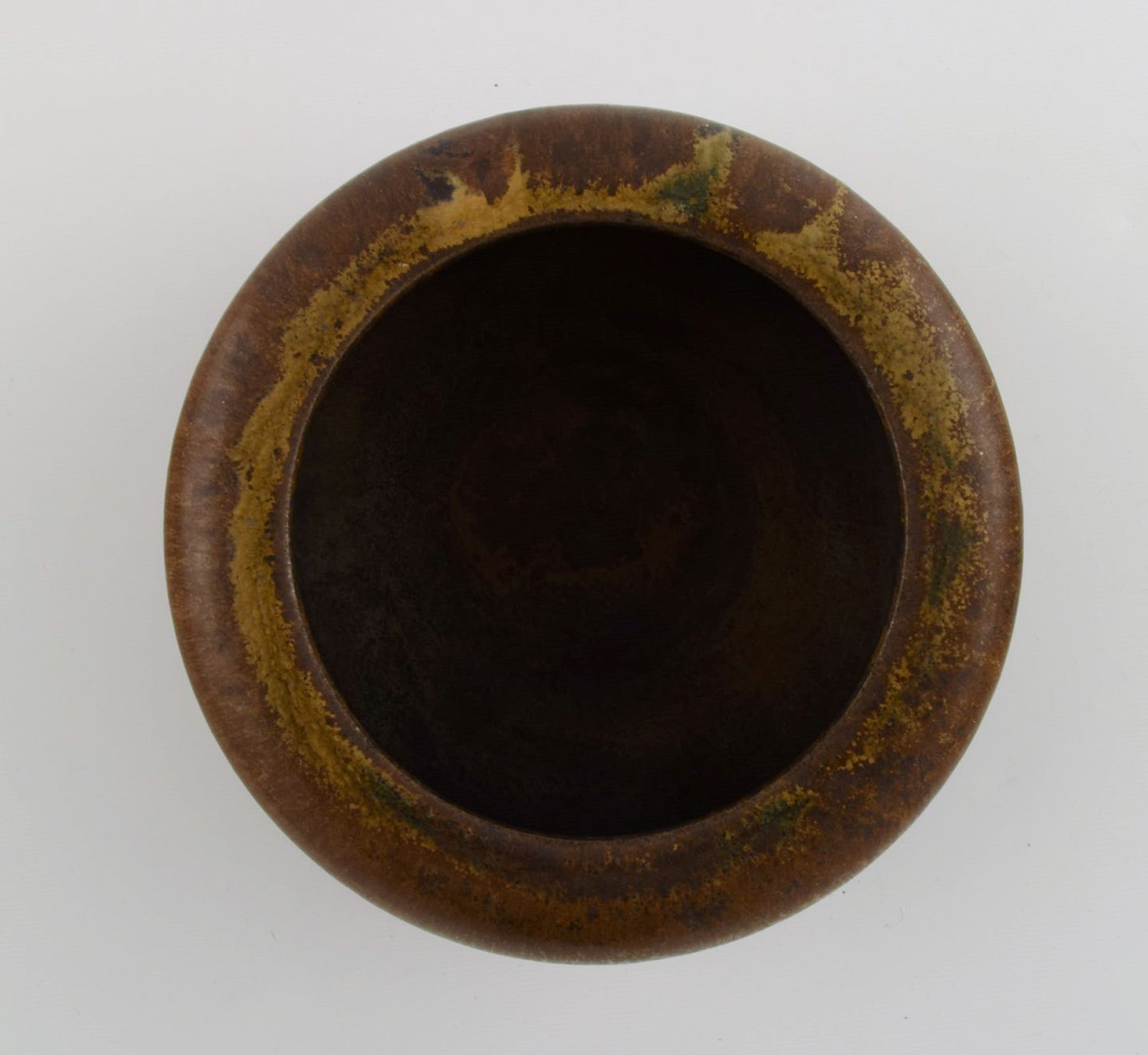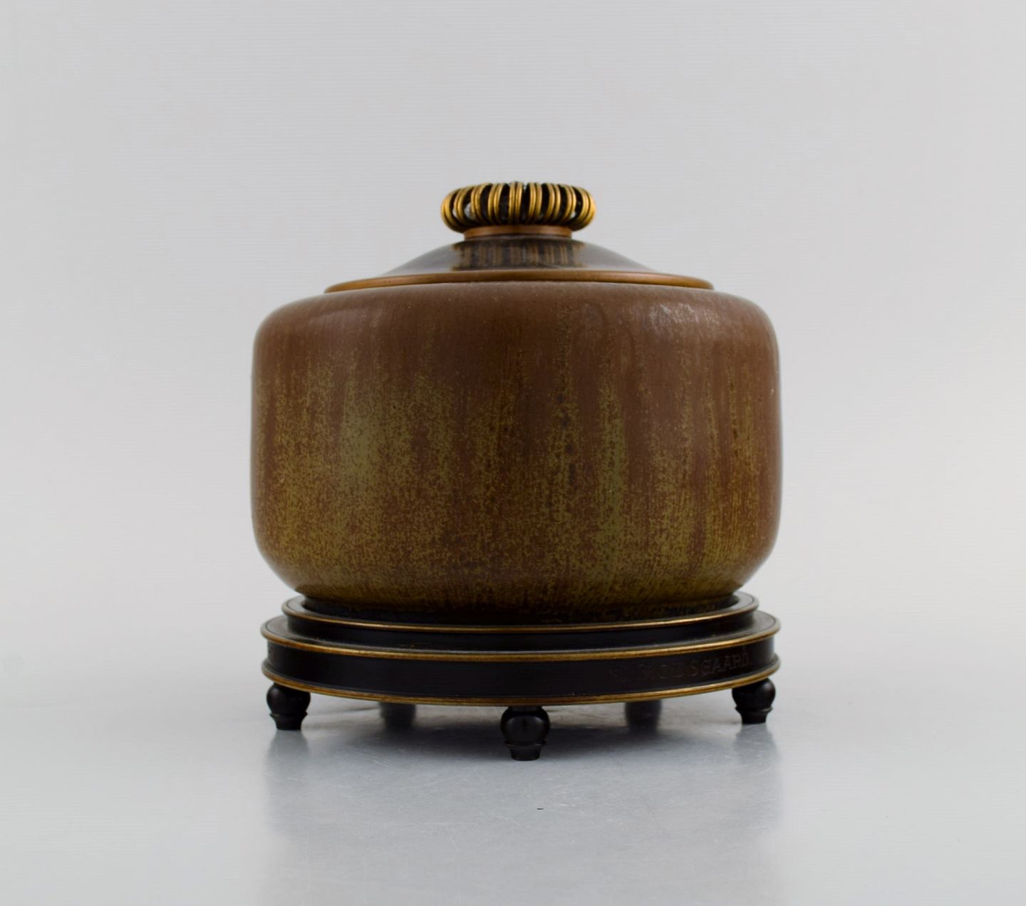 Arne Bang (1901-1983), Danmark. Vase i glaseret stentøj med bronzelåg og stand. Smuk glasur i lyse jord nuancer. Modelnummer 29. Midt 1900-tallet. Måler: 14,5 x 14,5 cm. I flot stand. Signeret i monogram.
