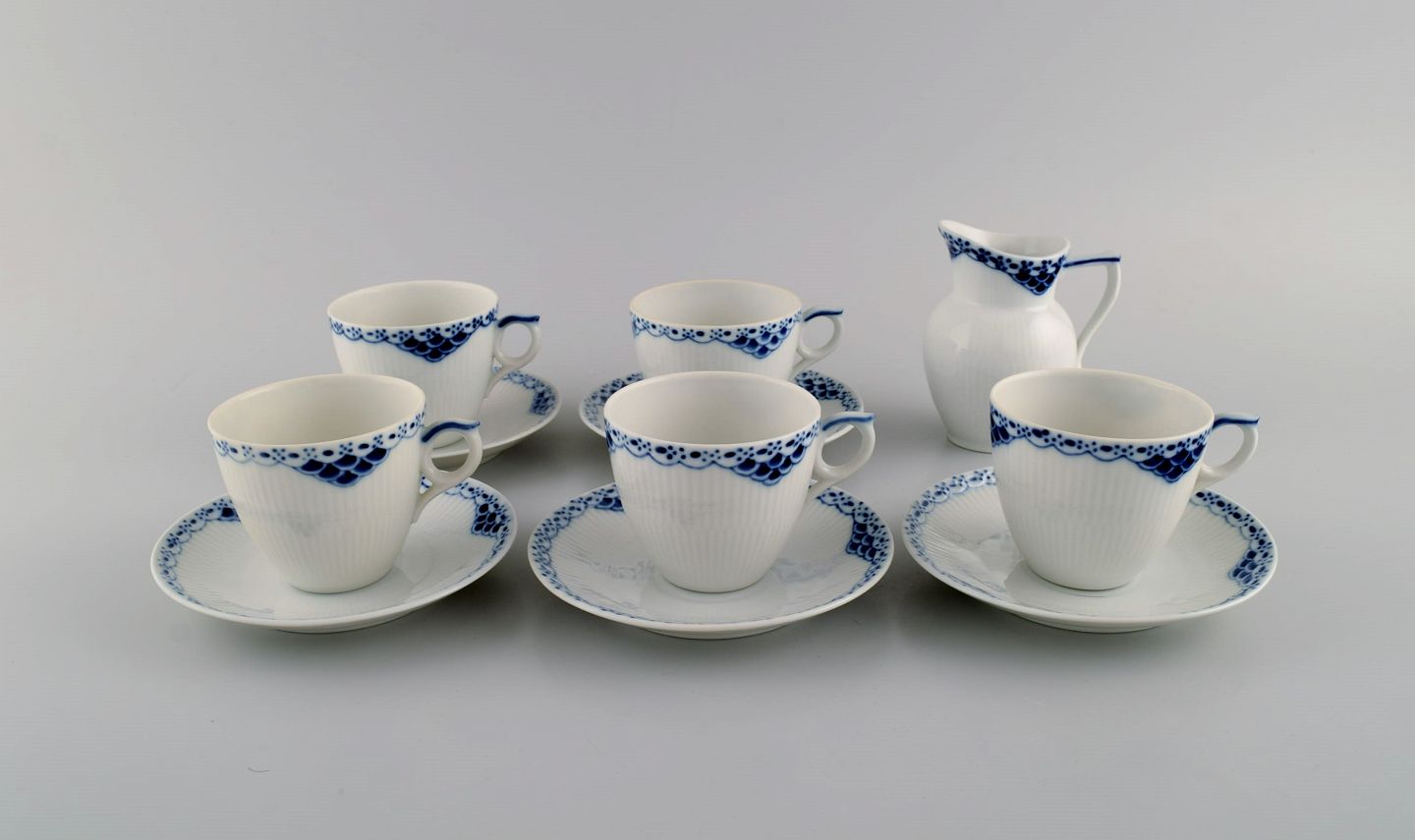 Royal Copenhagen blue painted Princess. Set of five coffee cups with saucers along with creamer in porcelain. Model Number 756.