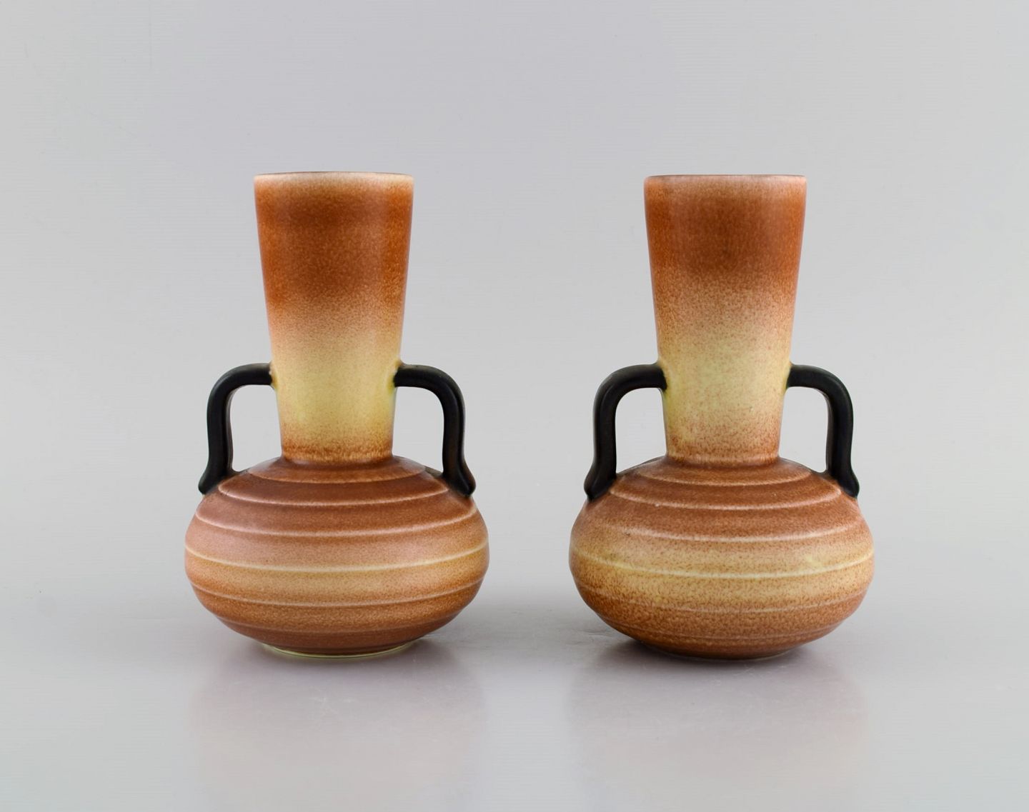 Gertrud Lönegren (1905–1970) for Rörstrand. To vaser med hanke i glaseret keramik. Smuk fersken glasur. 1930/40'erne. Måler: 15 x 10 cm. I flot stand. Stemplet.