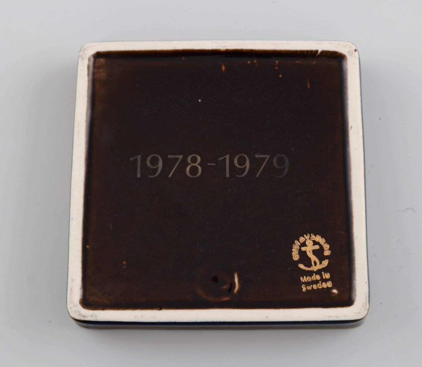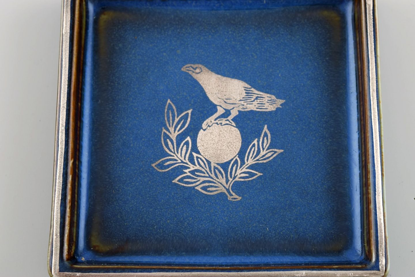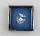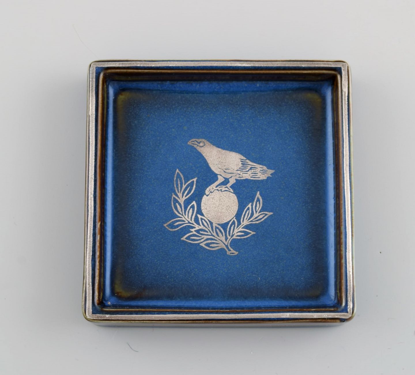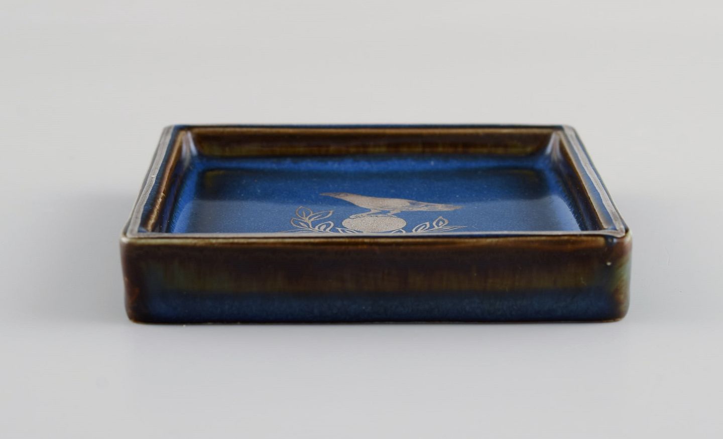 Sven Jonson (1919-1989) Gustavsberg. Tre små Lagun fade i glaseret stentøj med sølvindlæg. Smuk glasur i blå nuancer. 1970'erne.