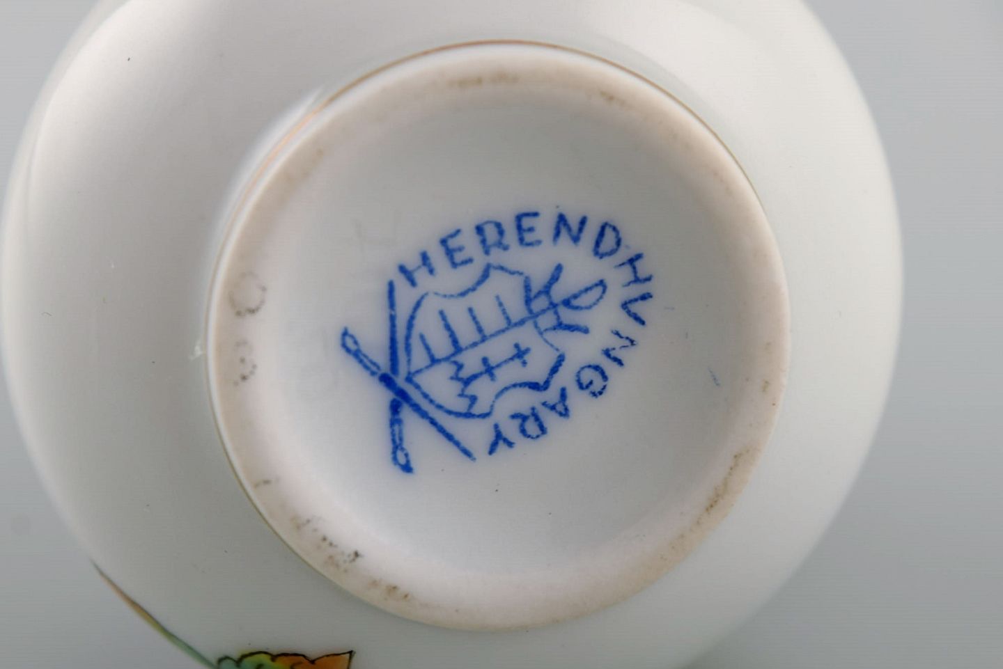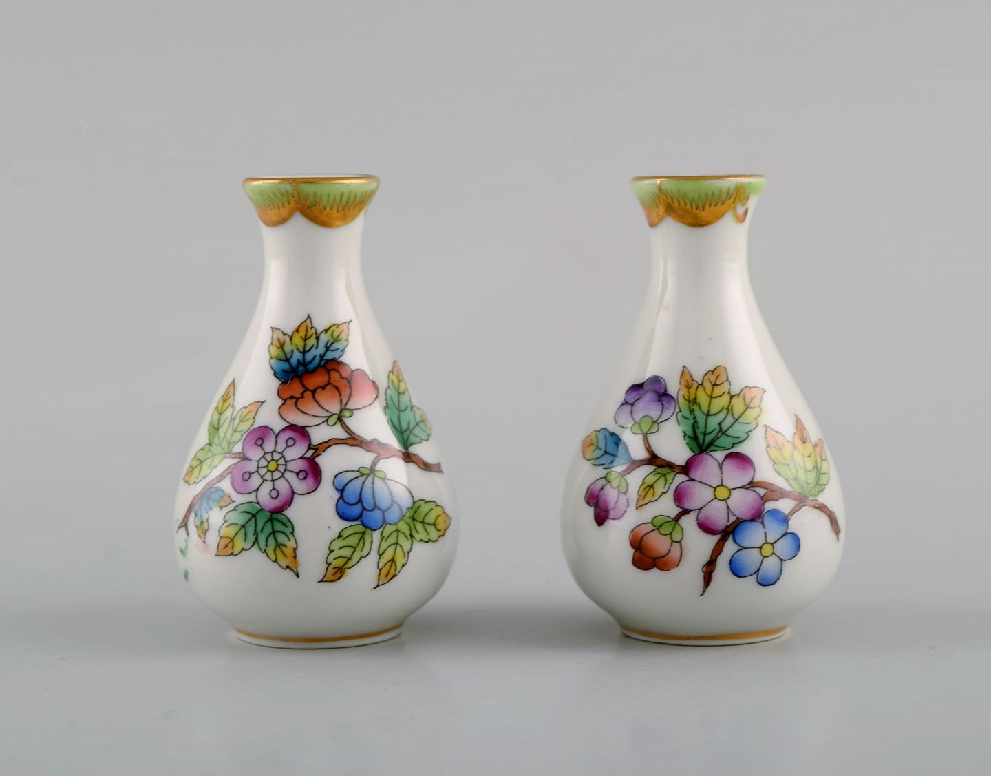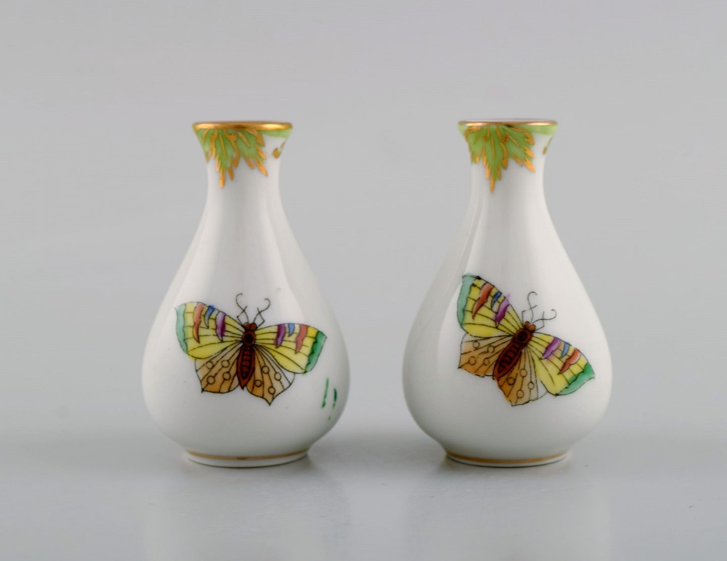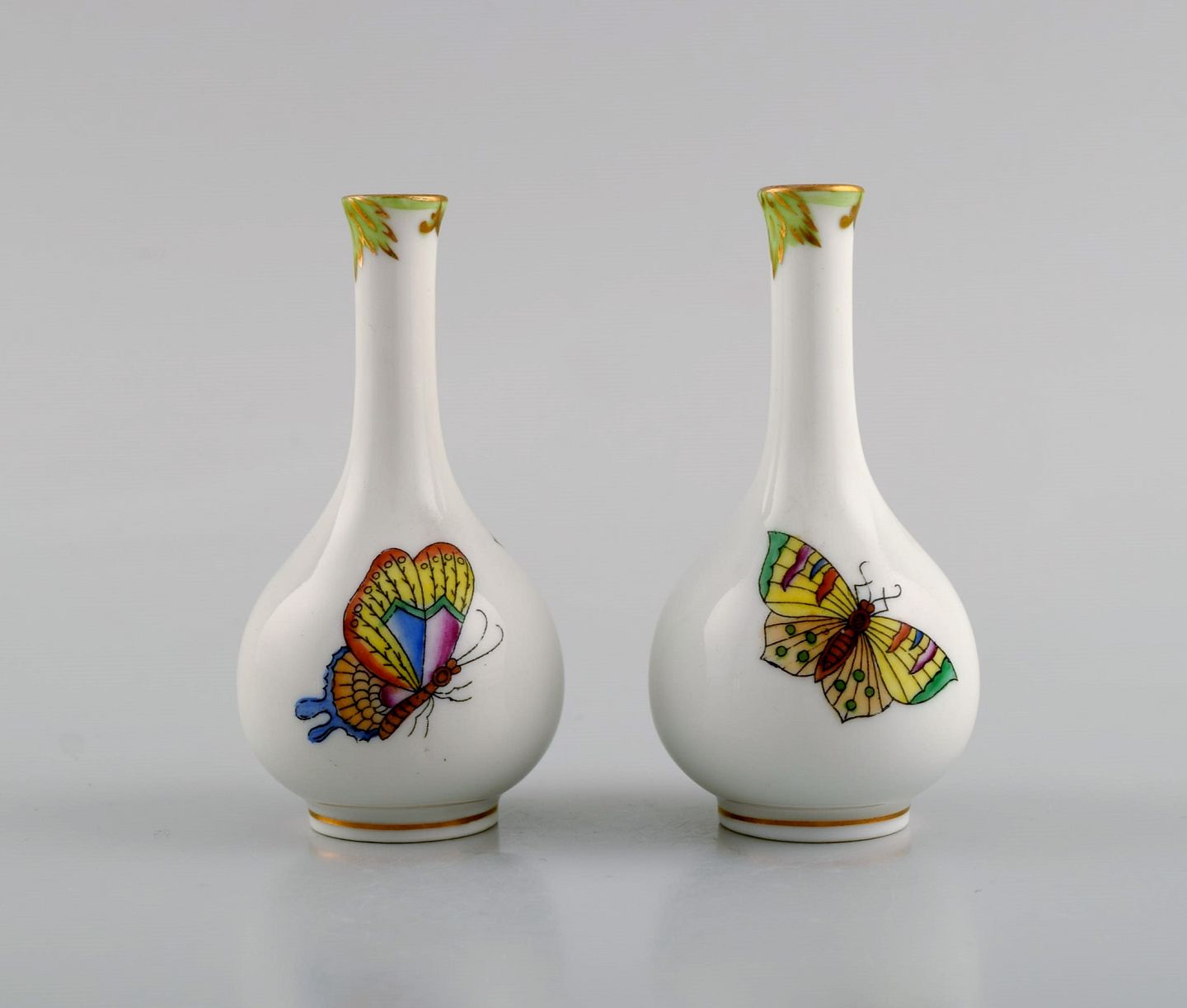 Fire Herend porcelænsvaser med håndmalede blomster og sommerfugle. Midt 1900-tallet. Største måler: 8,5 x 4,5 cm. I flot stand. Stemplet.