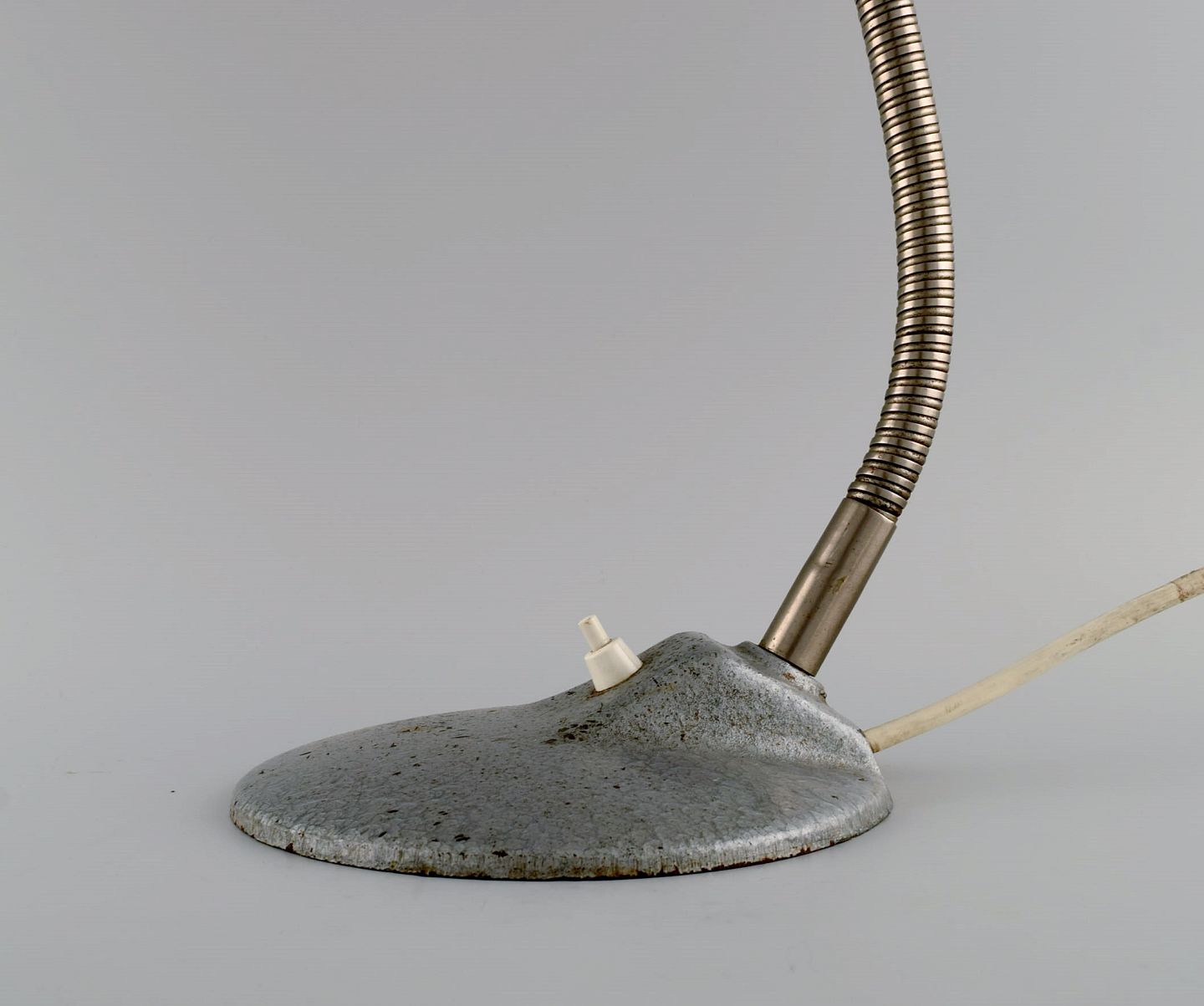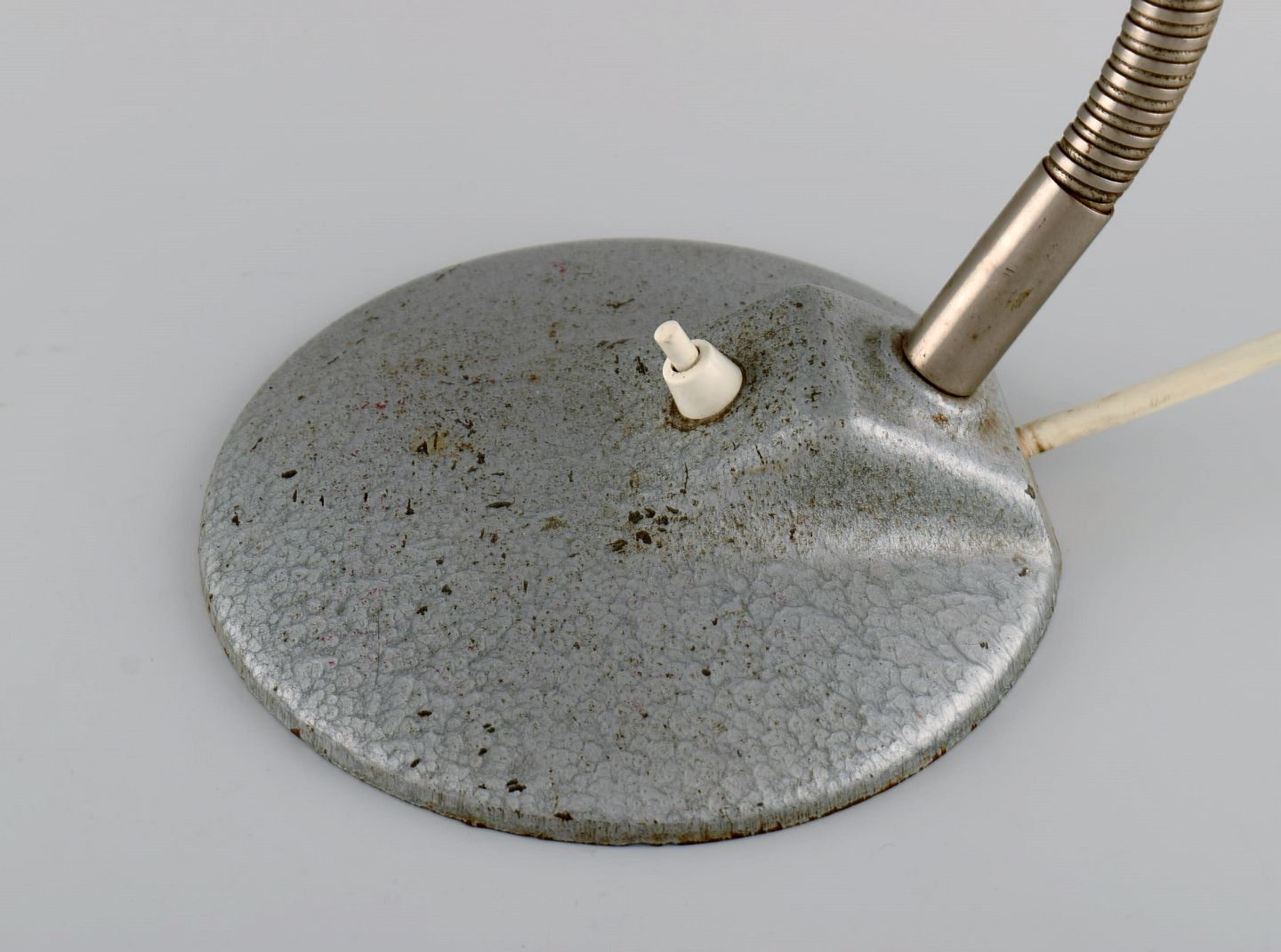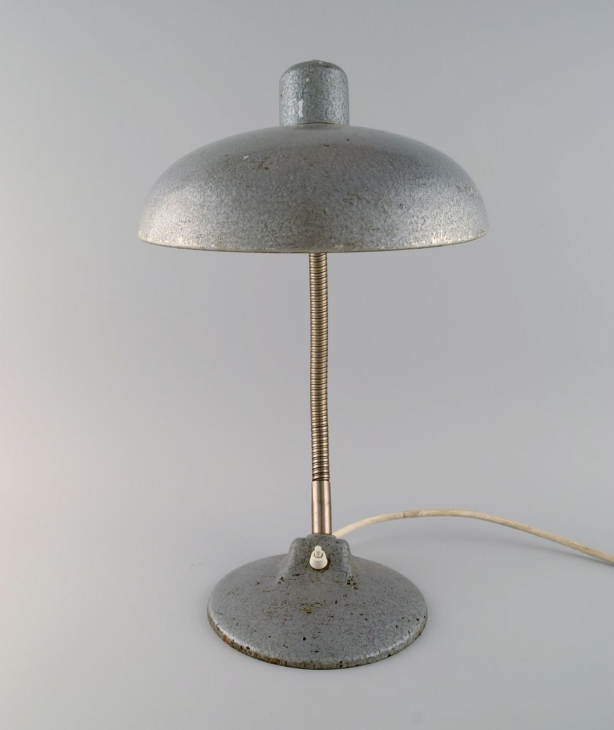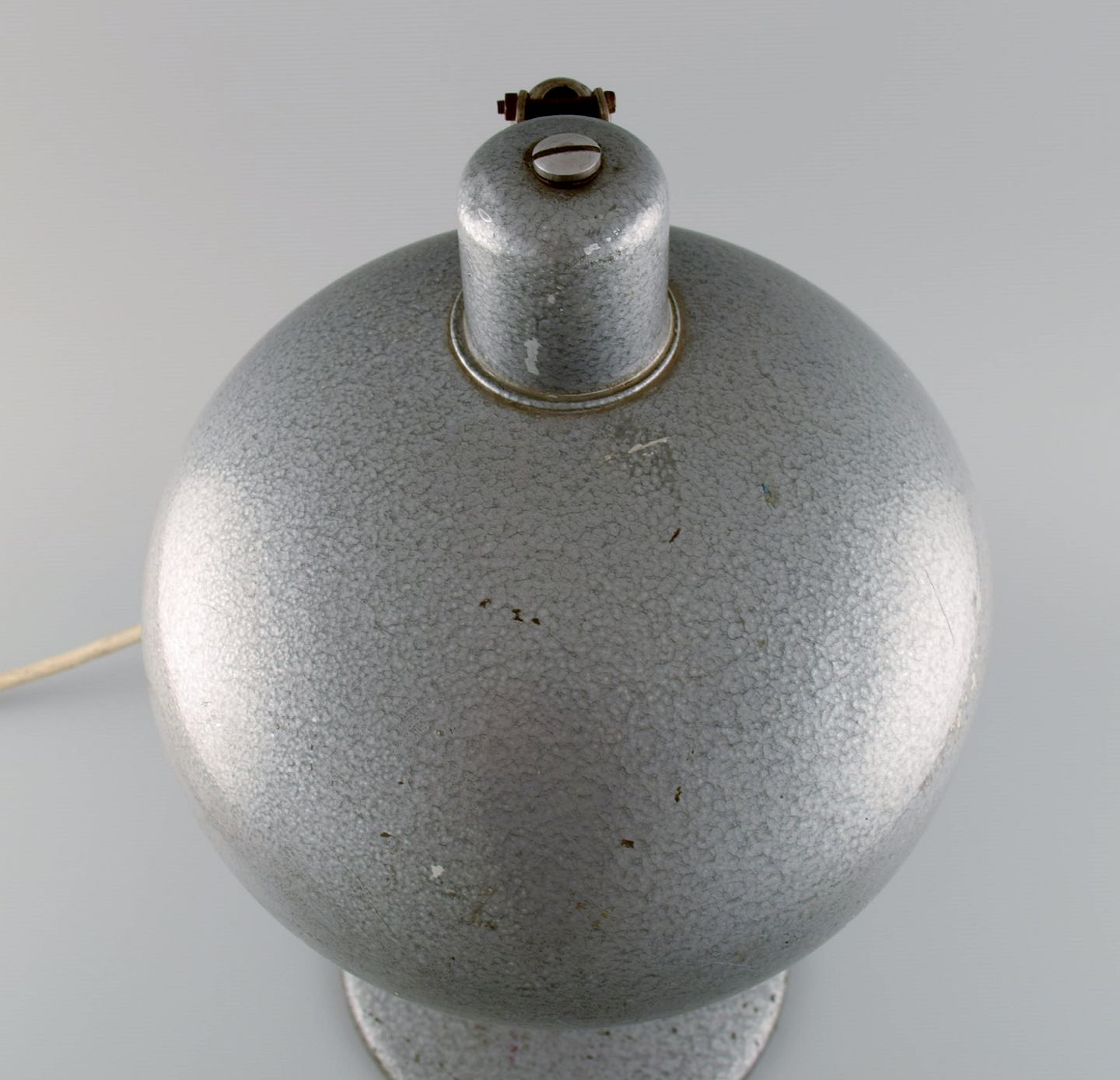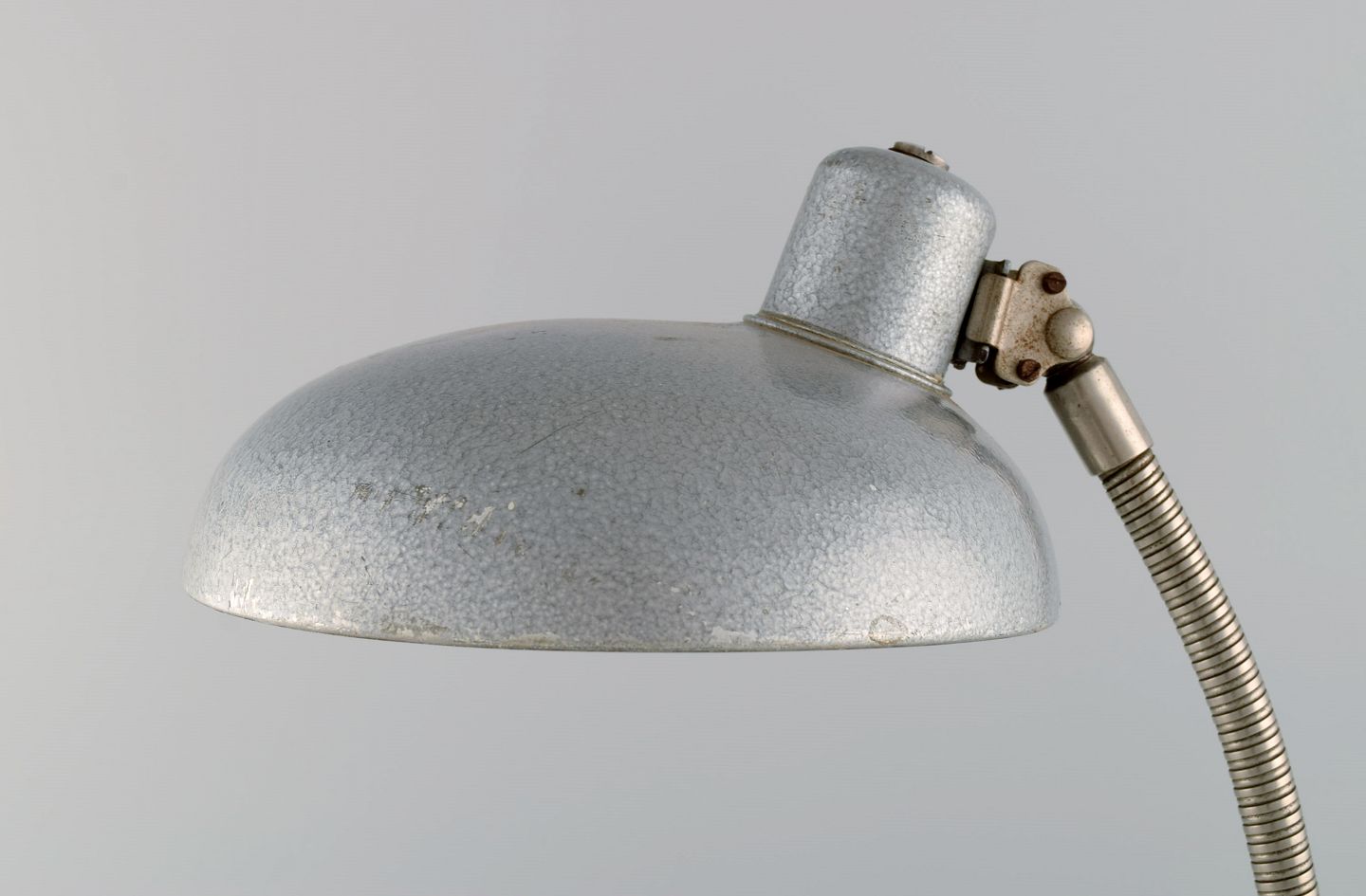 Adjustable desk lamp in original metallic lacquer. Industrial design, mid 20th century. Height: 43 cm. Foot diameter: 18 cm. Screen diameter: 23 cm. In excellent condition. Minor signs of use.