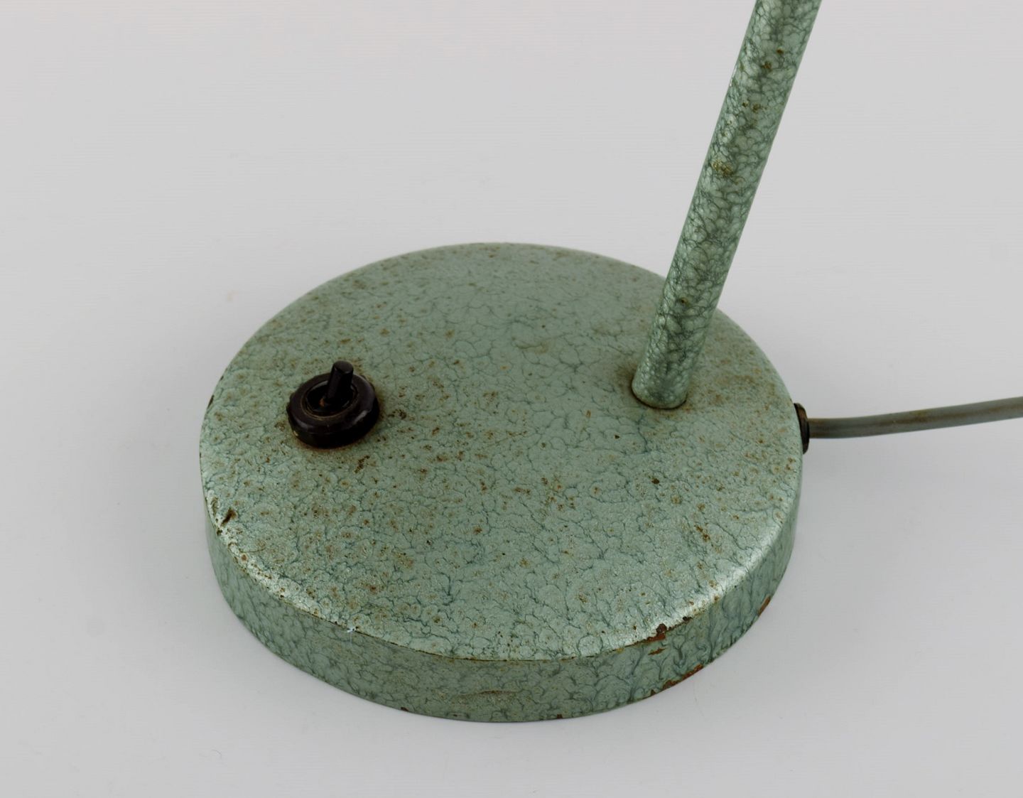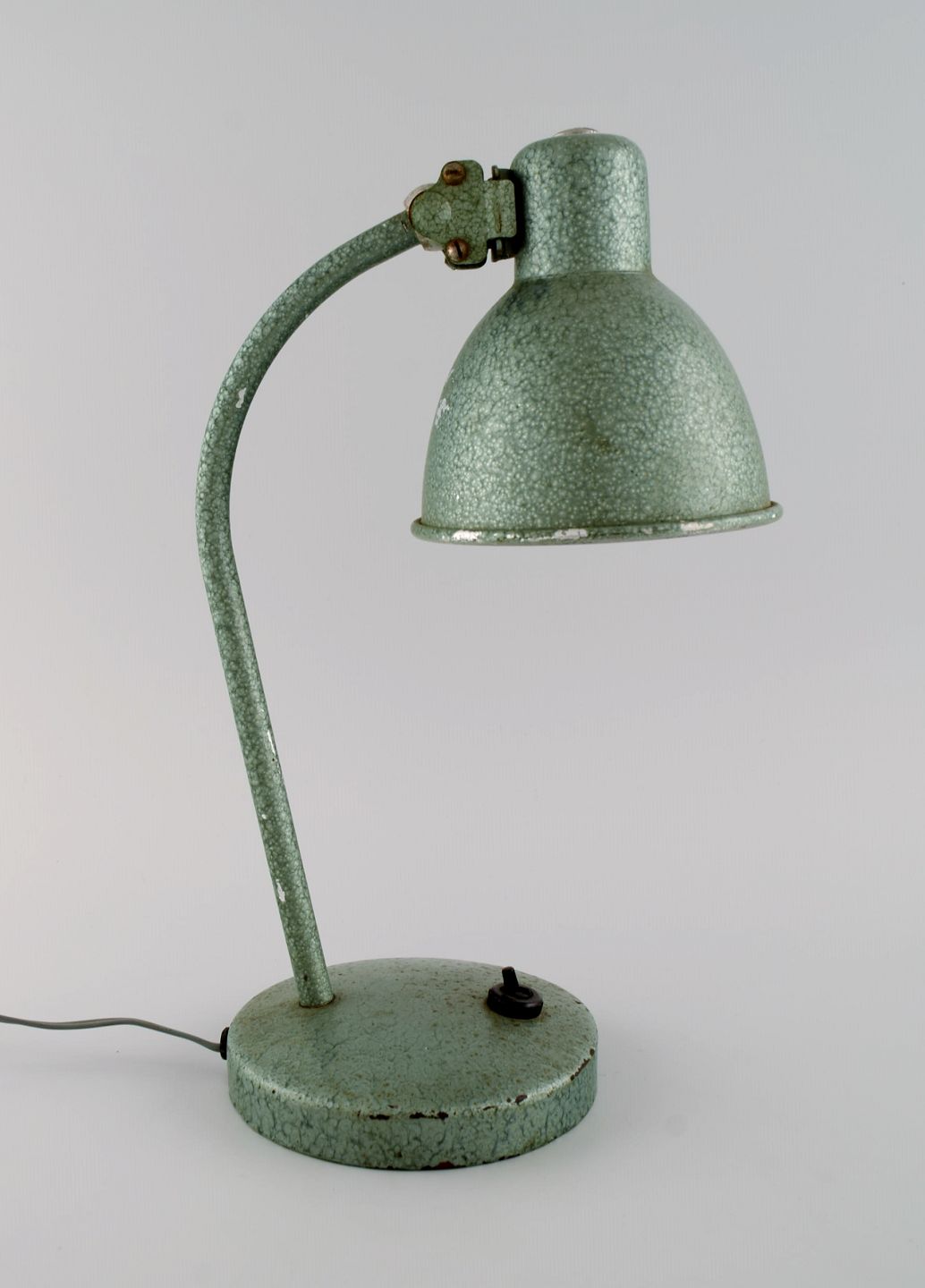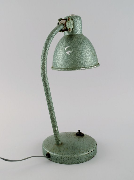 Adjustable desk lamp in original mint green lacquer. Industrial design, mid 20th century. Height: 33 cm. Foot diameter: 13.5 cm. Screen diameter: 12.5 cm. In excellent condition. Minor signs of use.