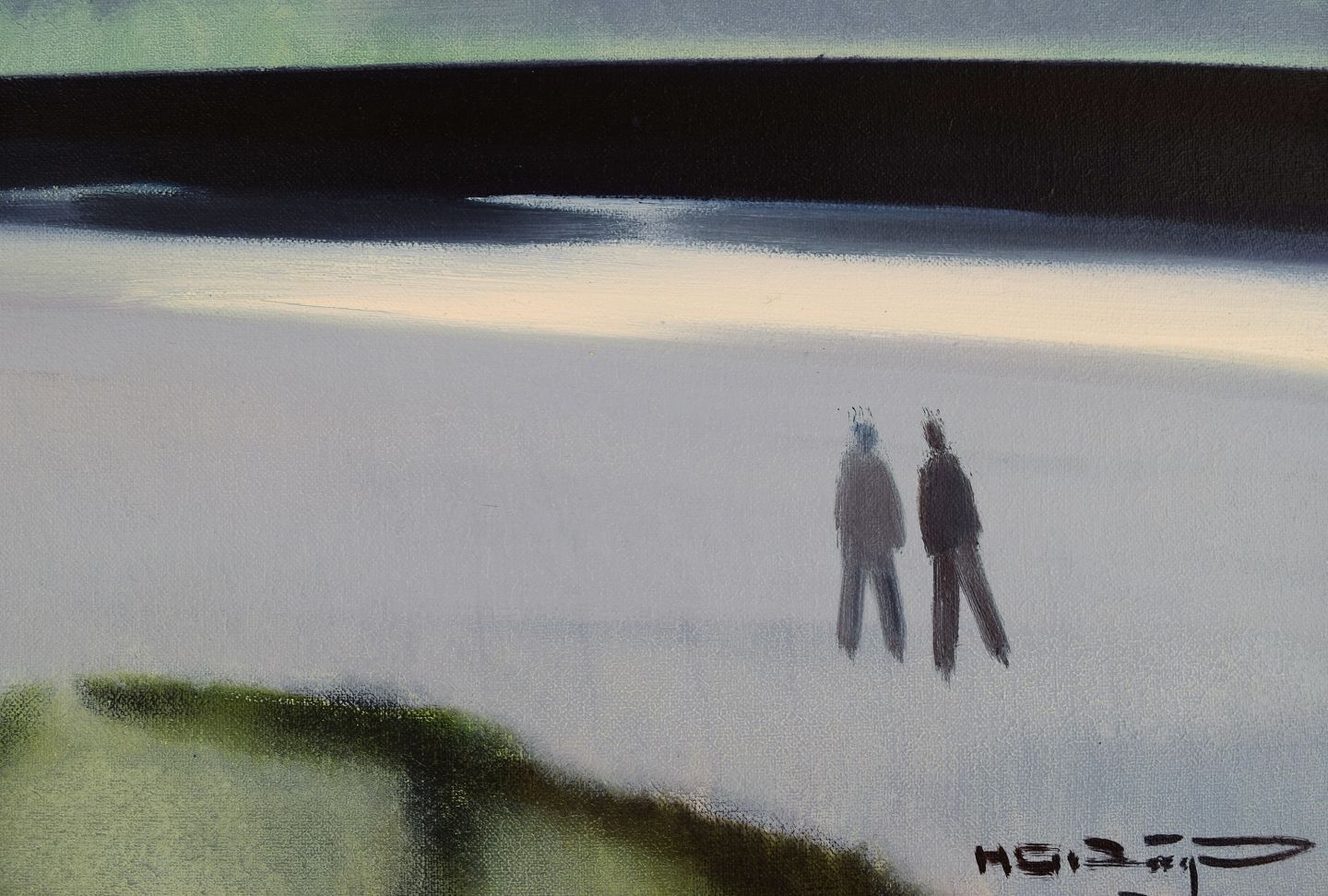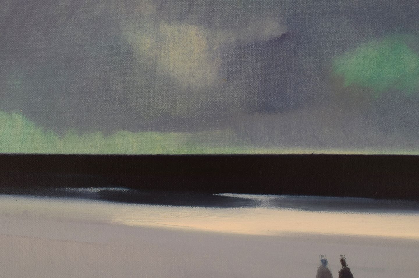Knud Horup (1926-1973), Danmark. Olie på lærred. Modernistisk strandlandskab med personer. 1960'erne. Lærredet måler: 59 x 49 cm. Rammen måler: 9 cm. I flot stand. Signeret.