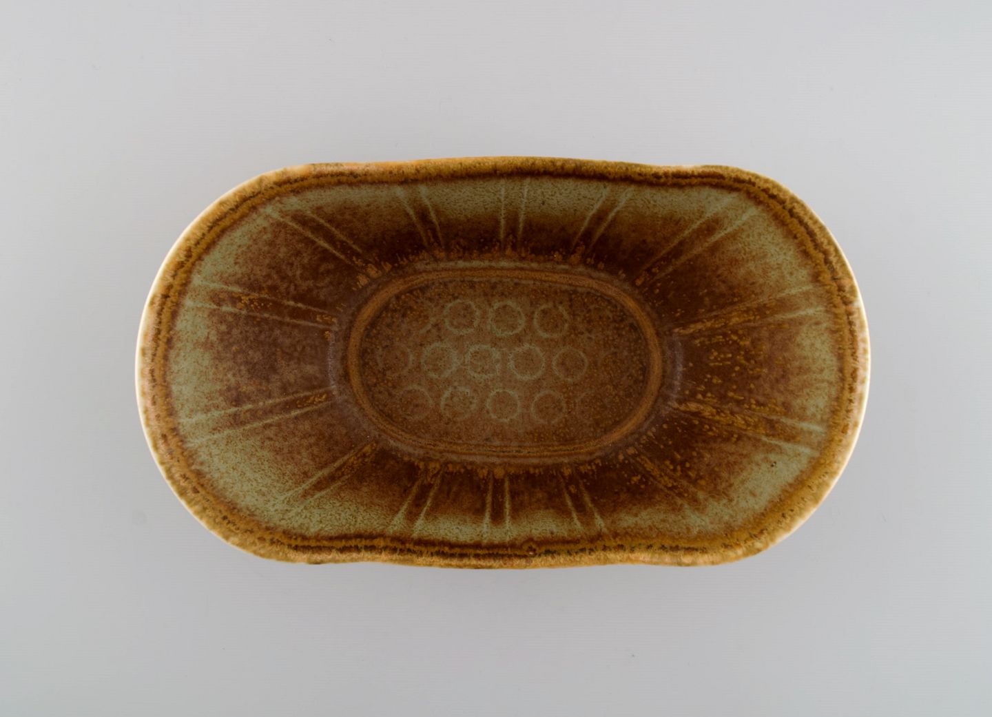 Gunnar Nylund (1904-1997) for Rörstrand. Bowl in glazed ceramics. Beautiful glaze in earth tones. Mid-20th century. Measures: 19 x 6.5 cm. In excellent condition. Signed. 1st factory quality.