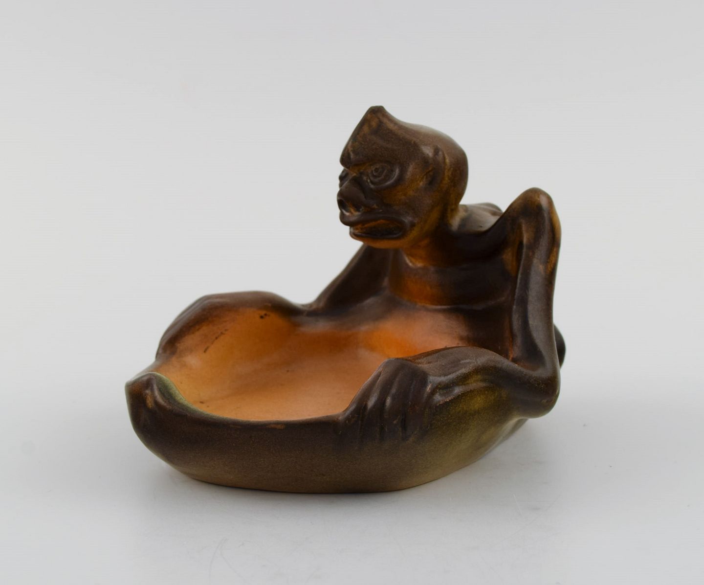 Ipsens enke, Danmark. Sjælden skål i håndmalet keramik modelleret med grotesk. 1920/30'erne. Modelnummer 137.