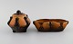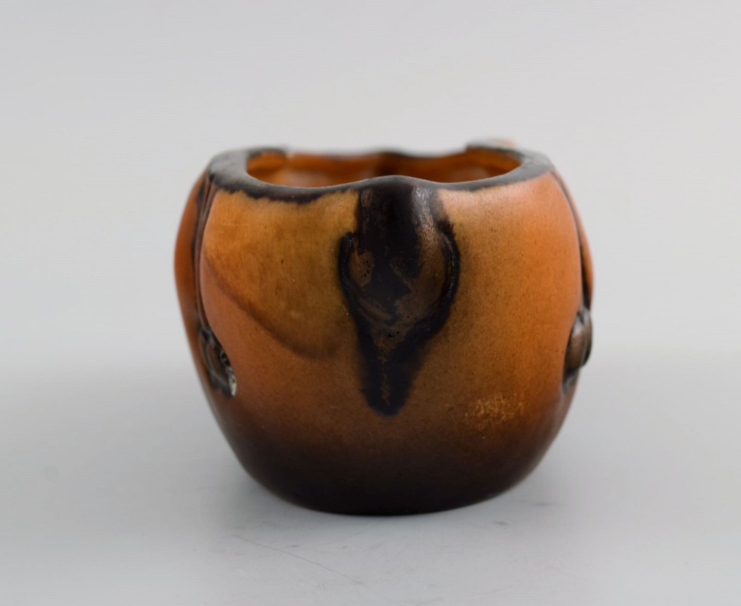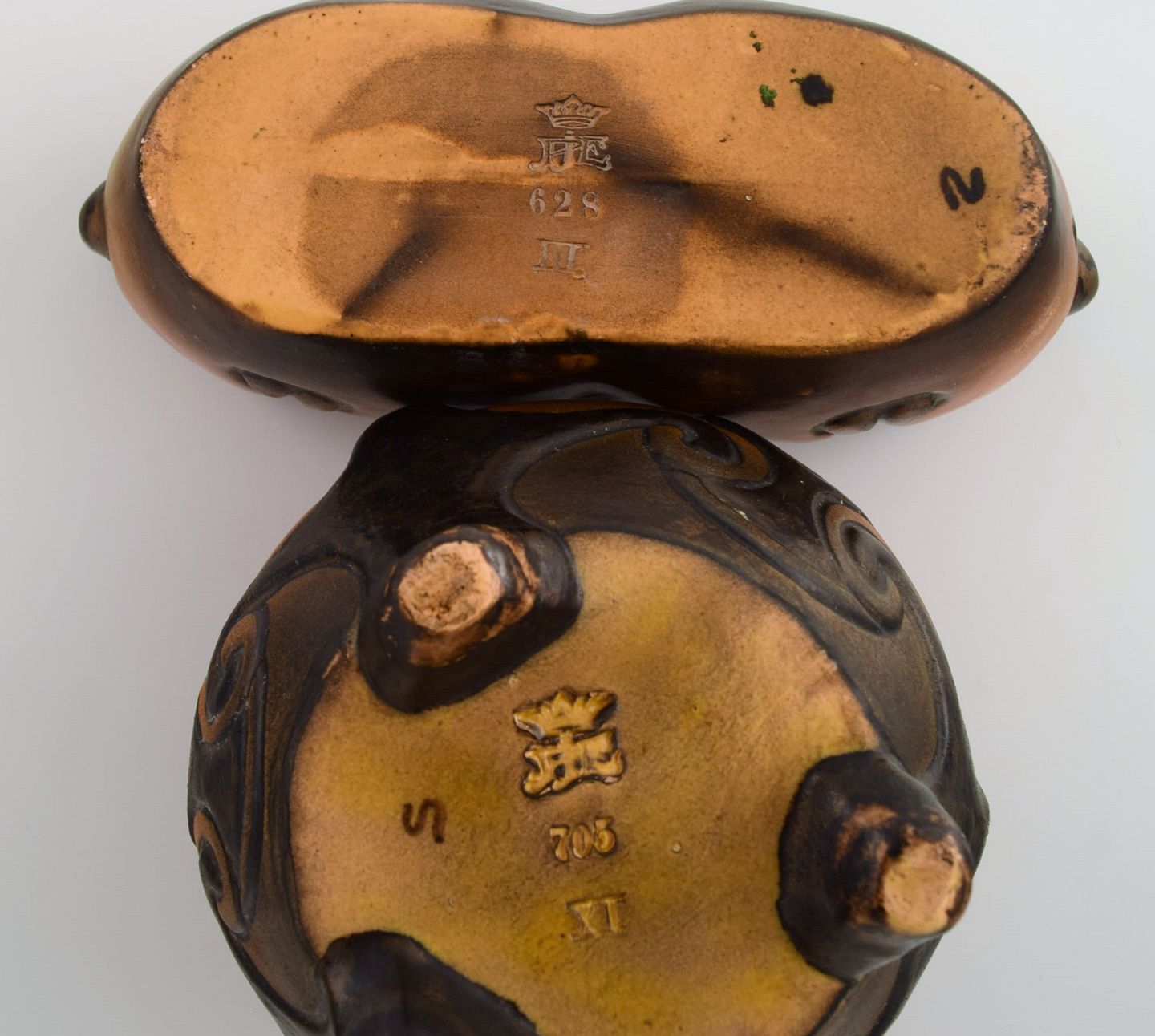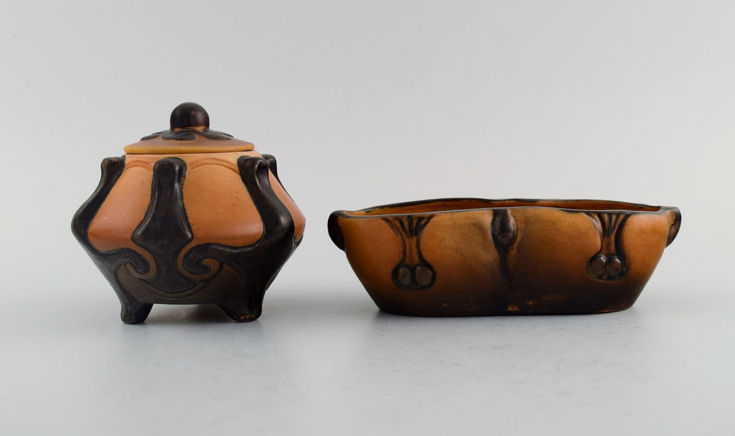 Ipsens enke, Danmark. Art nouveau lågkrukke og skål i håndmalet og glaseret keramik. 1920/30'erne.