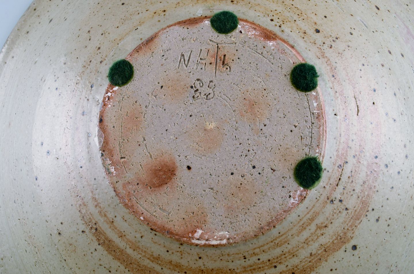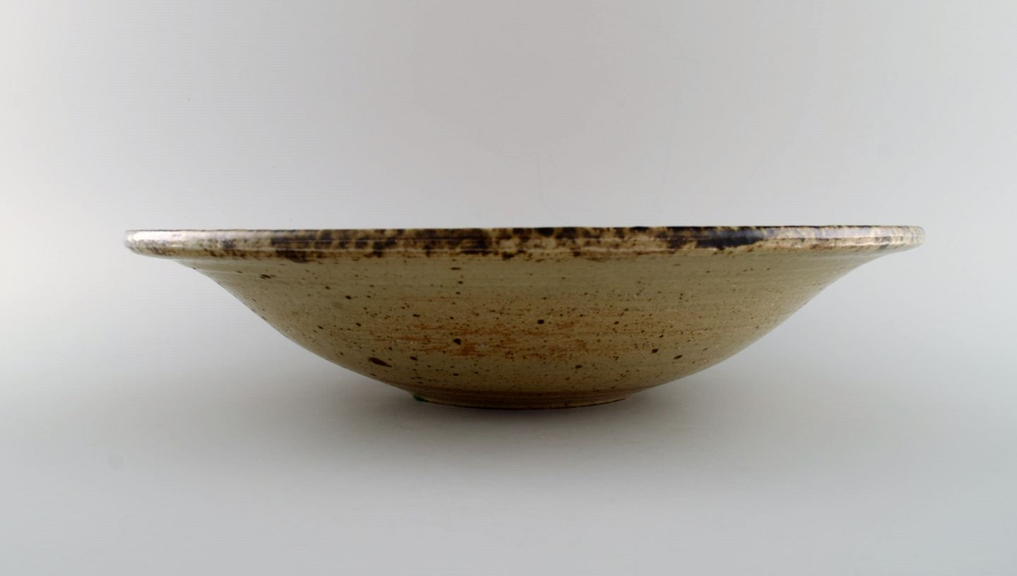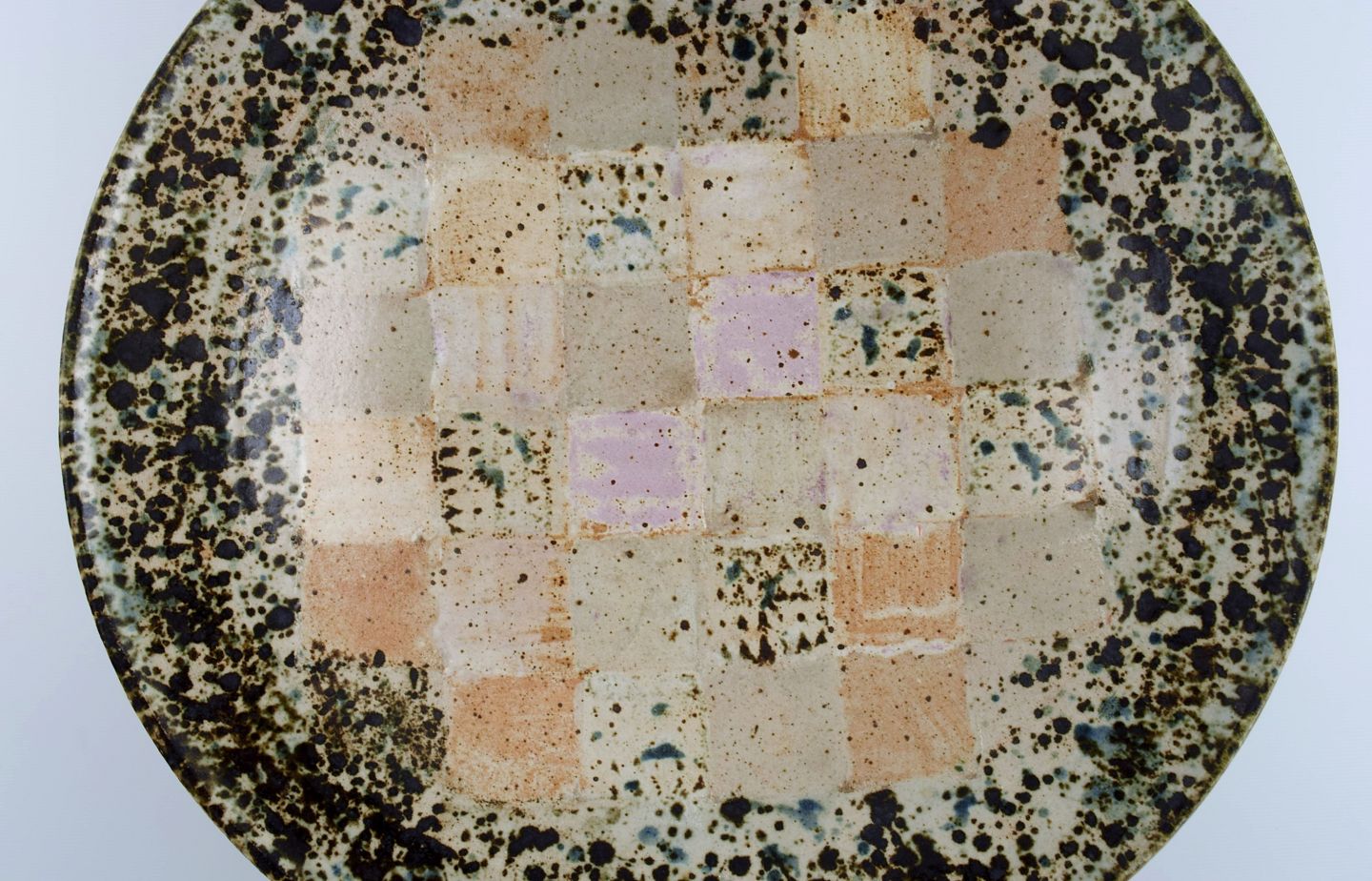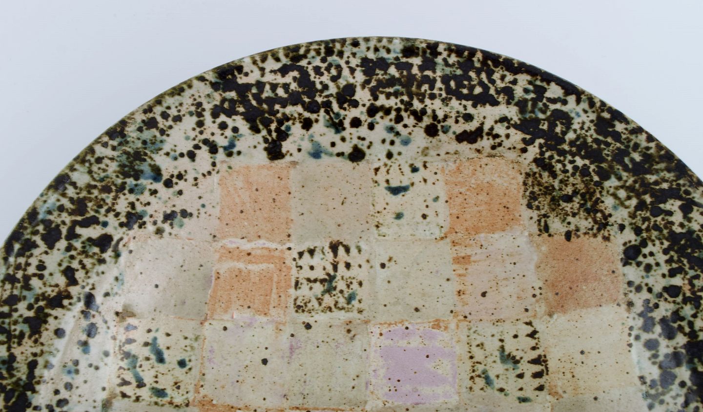 European studio ceramicist. Large unique bowl in glazed stoneware with checkered pattern. Dated 1988. Measures: 37.5 x 8 cm. In excellent condition. Signed.