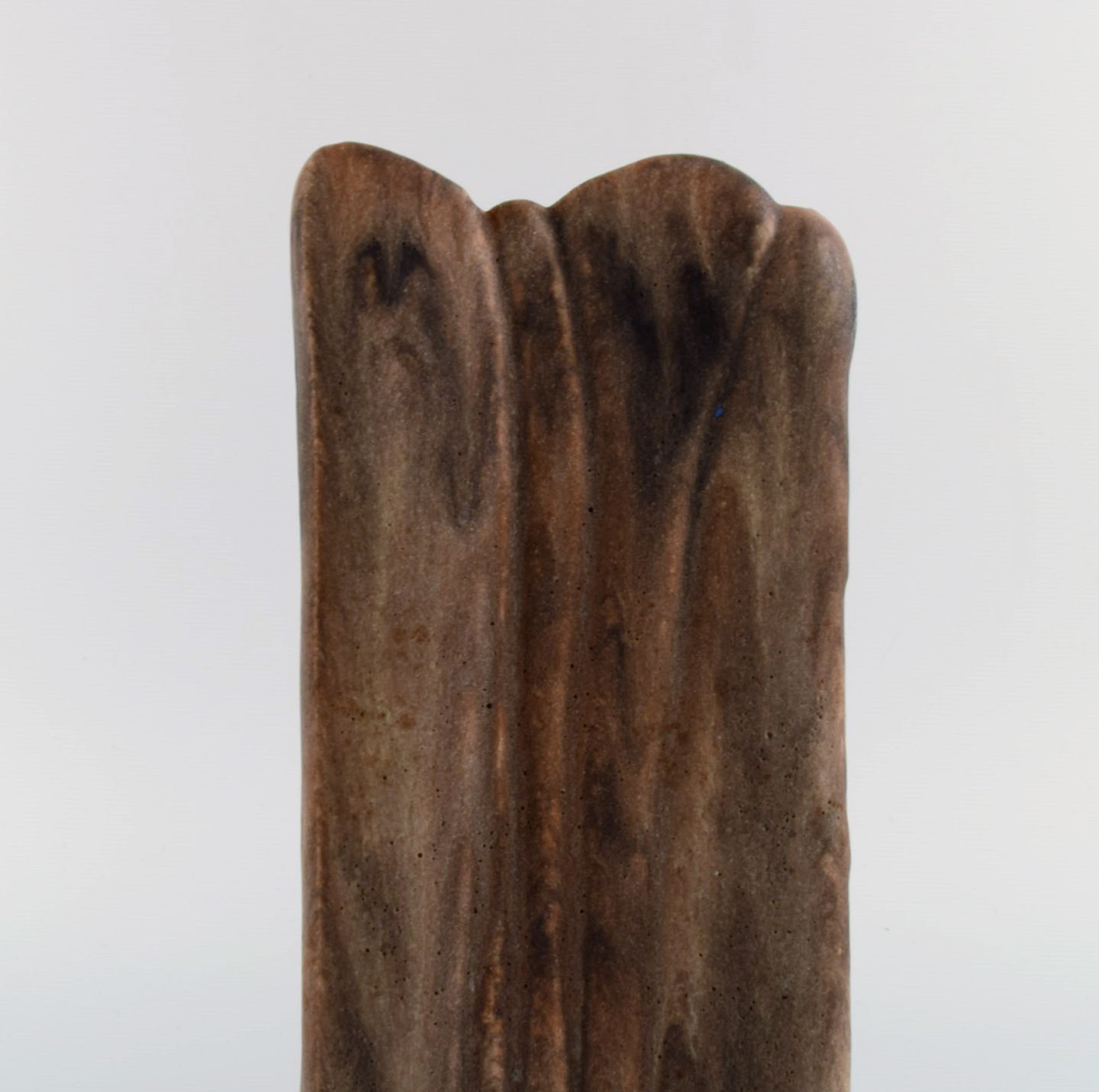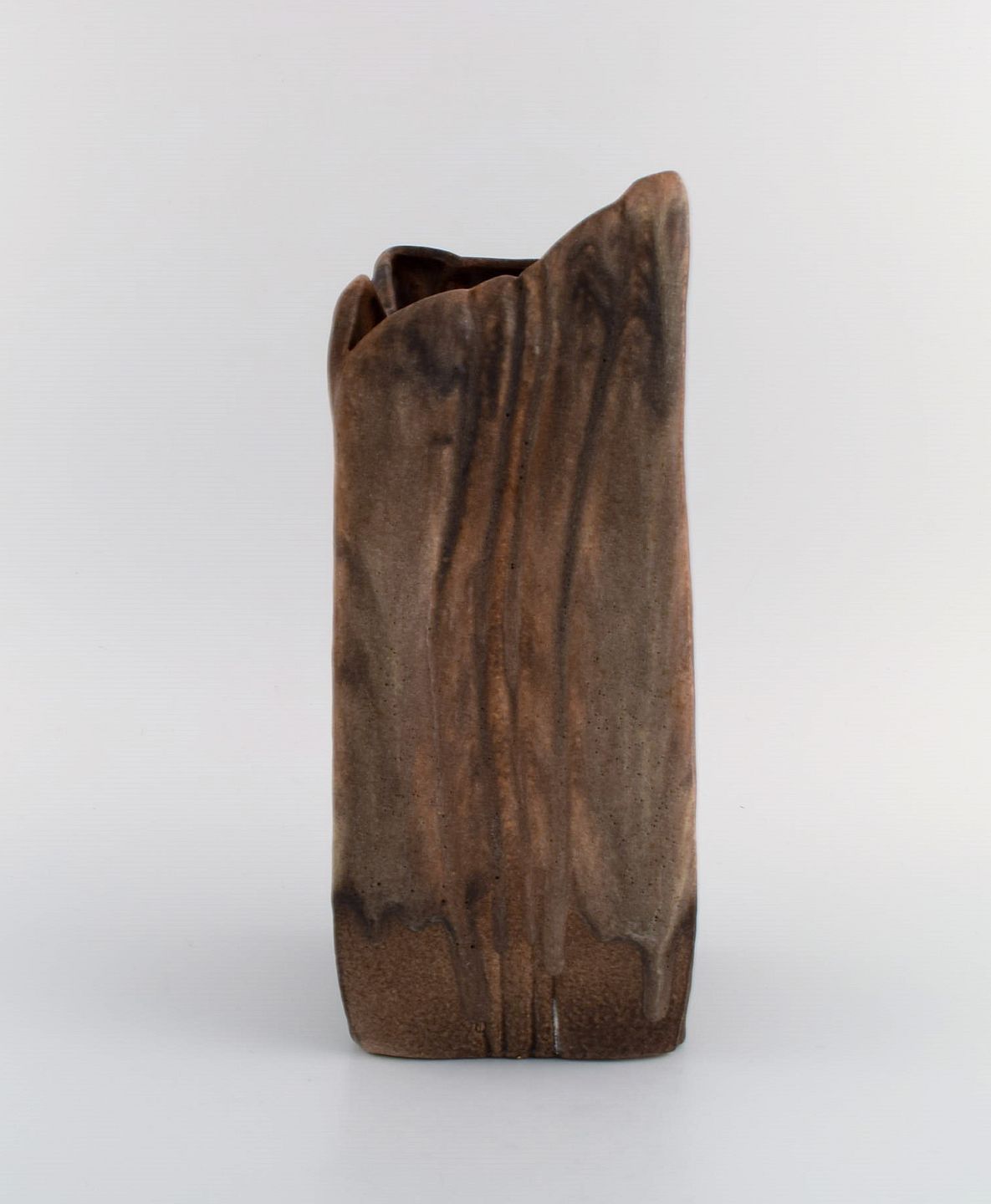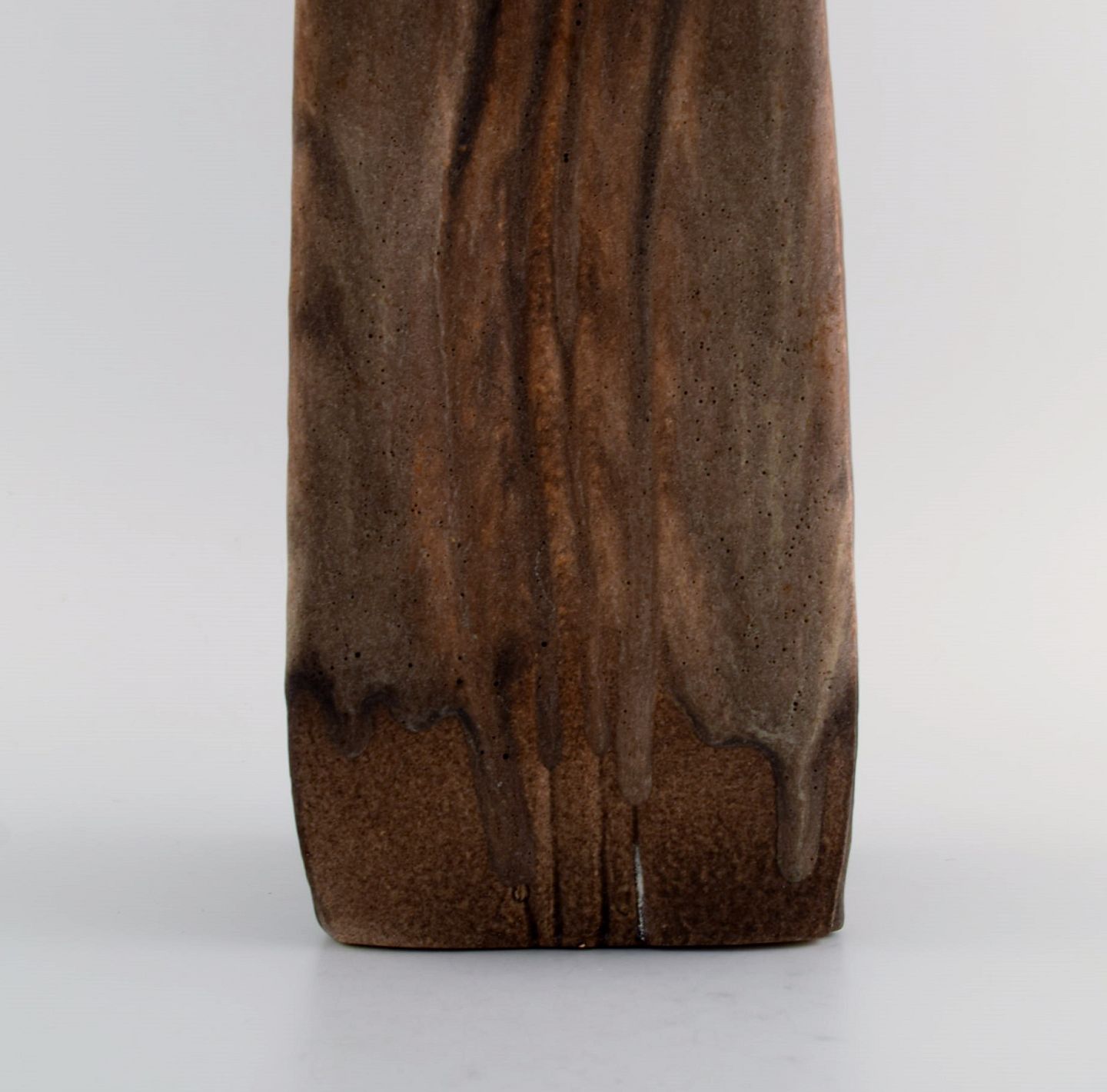 European studio ceramicist. Unique vase in glazed ceramics. Beautiful glaze in brown shades. Late 20th century. Measures: 29 x 11 cm. In excellent condition.