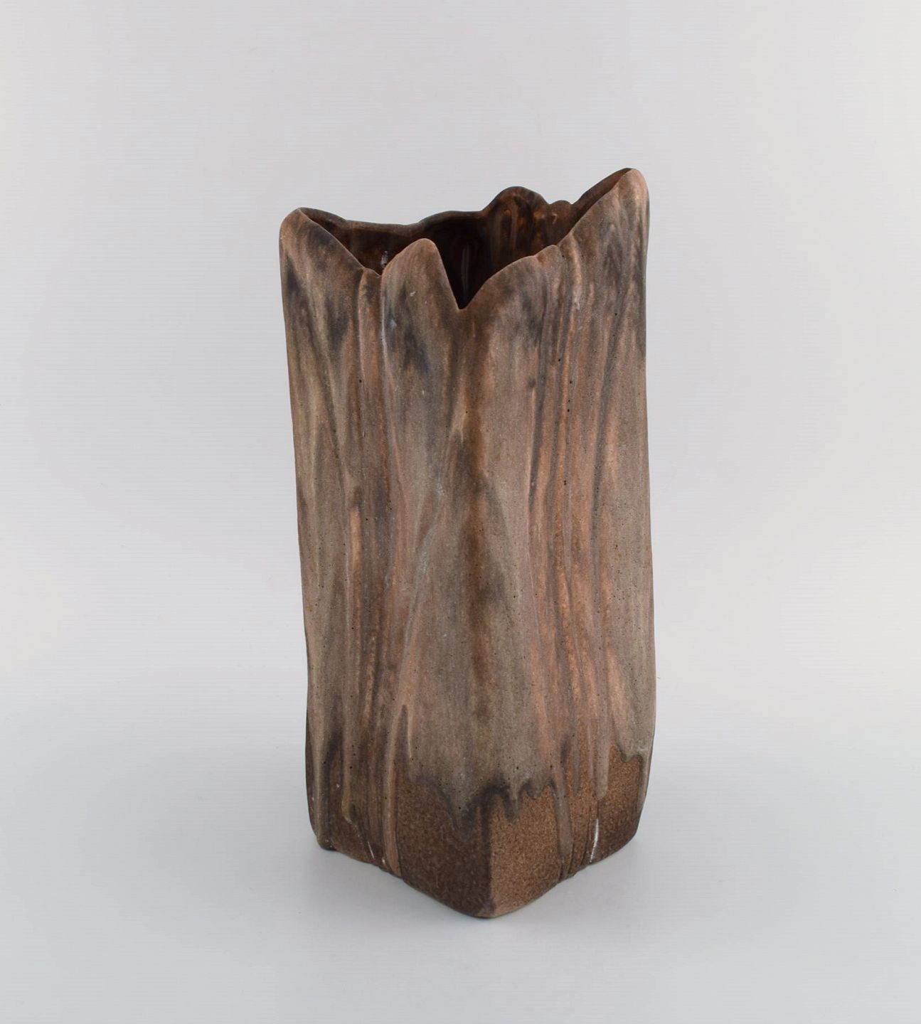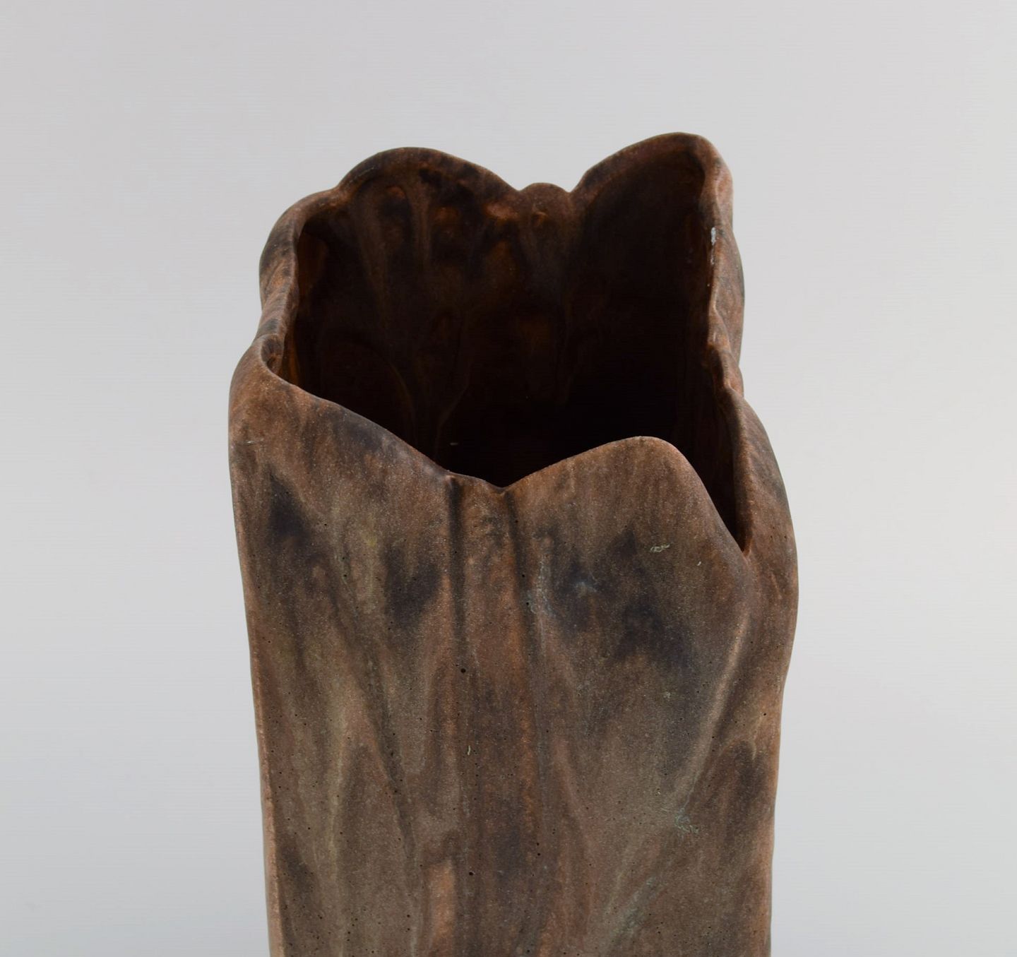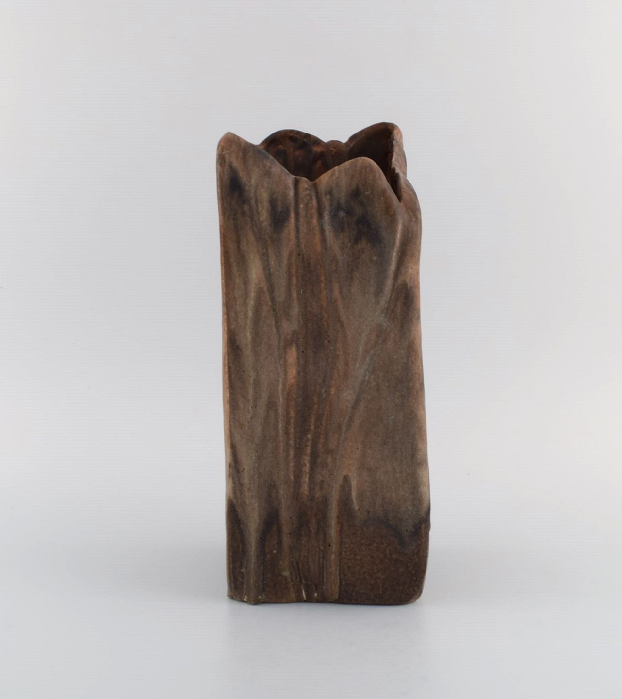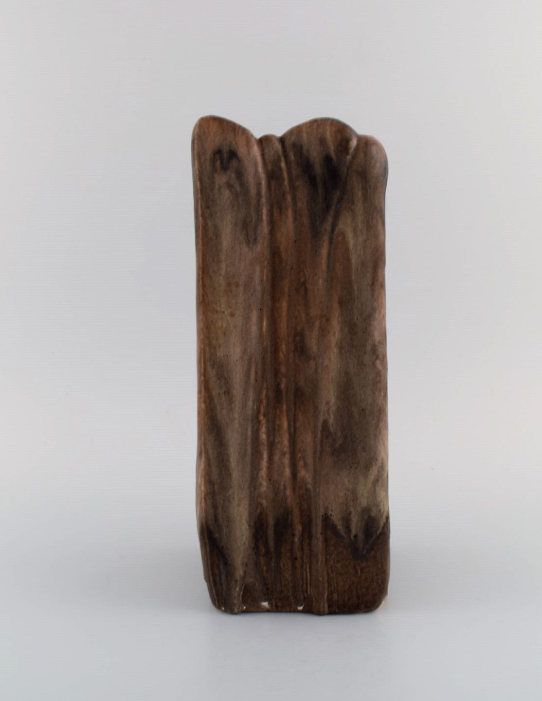European studio ceramicist. Unique vase in glazed ceramics. Beautiful glaze in brown shades. Late 20th century. Measures: 29 x 11 cm. In excellent condition.