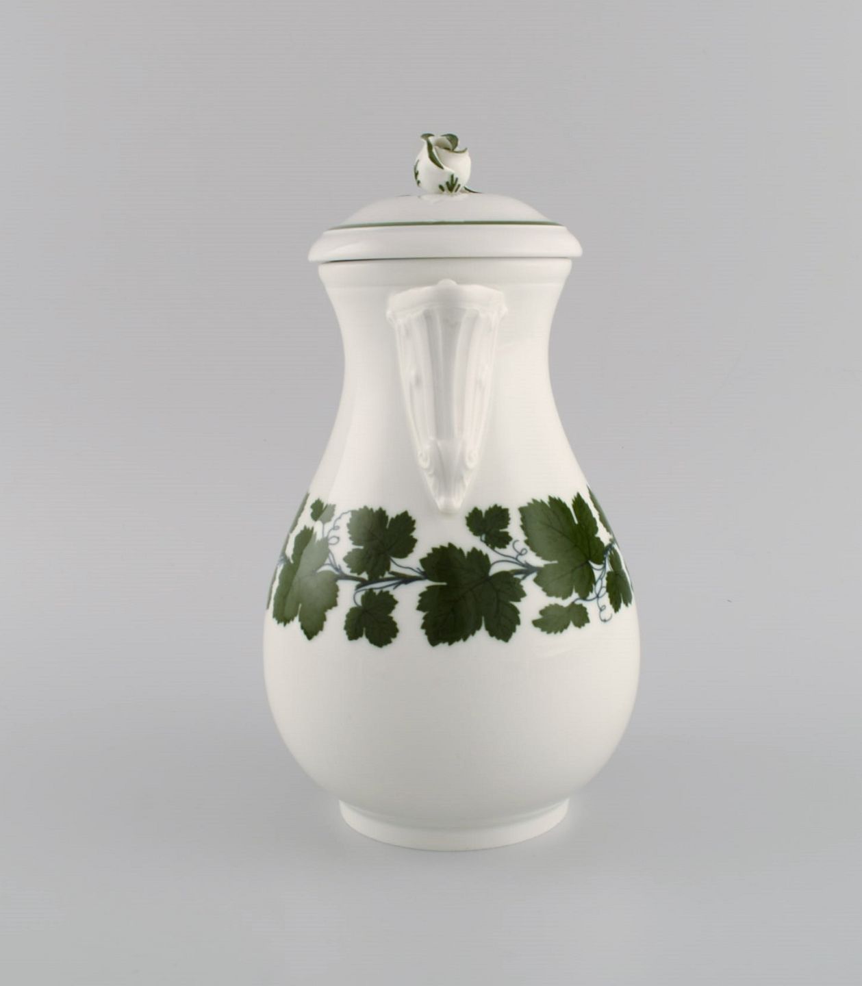 Meissen Green Ivy Vine. Kaffekande, sukkerskål og flødekande i håndmalet porcelæn. Låg modelleret med rosenknop. 1940'erne.