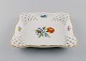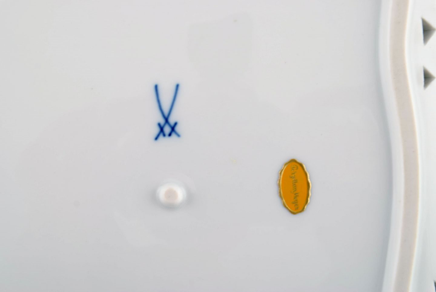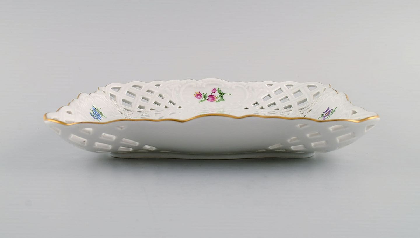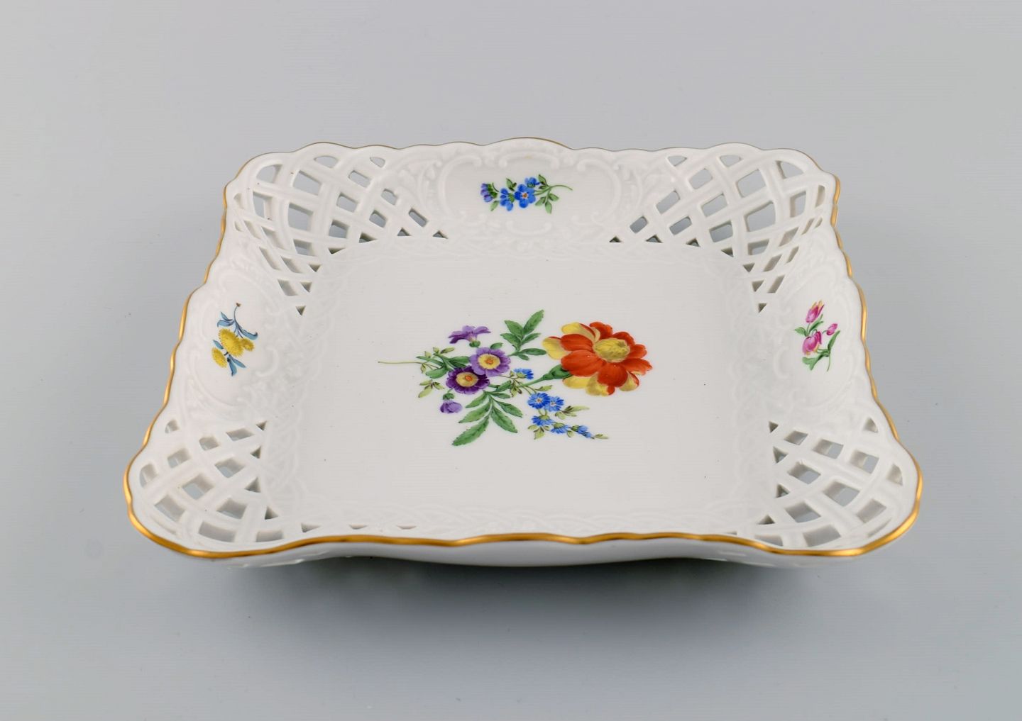 Kvadratisk Meissen fad / skål i gennembrudt porcelæn med håndmalede blomster og guldkant. Tidligt 1900-tallet. Måler: 20,5 x 3,5 cm. I flot stand. Signeret. 1. Sortering.