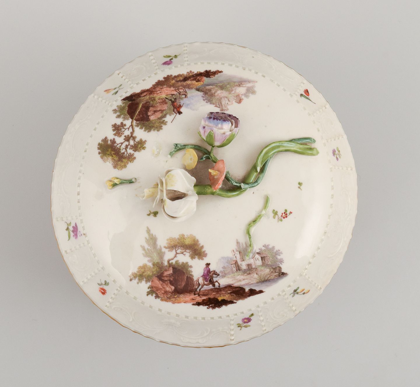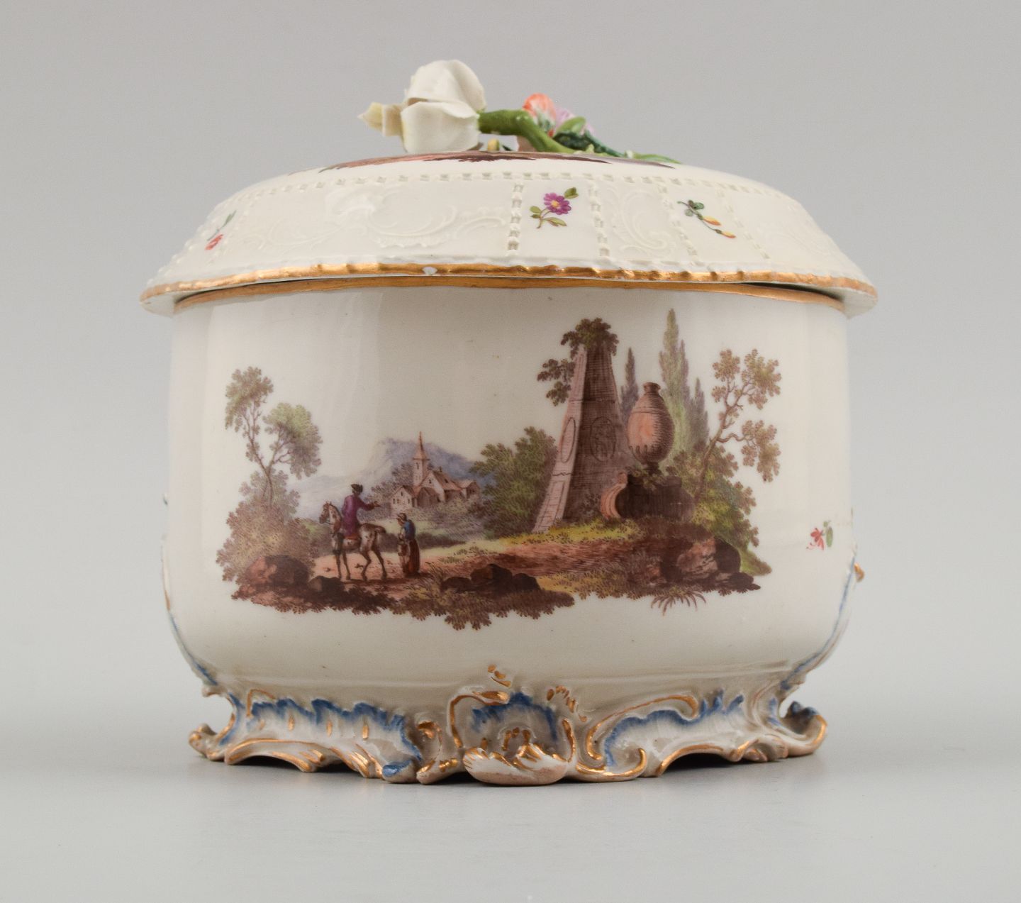 Louisbourg, Tyskland. 1700 tals stor sukkerskål, håndmalet med landskabsscenerier, låg med blomster i relief. Måler: Ø 14,0 cm. x H 12,0 cm. I pæn stand med ubetydelige mikroskår i blomster. Stemplet.