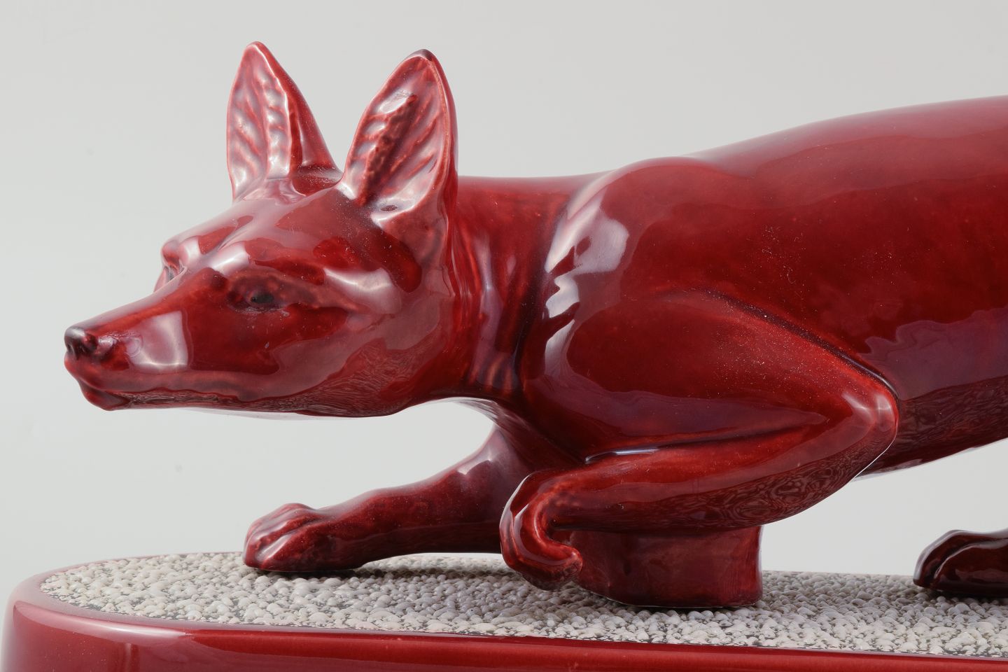 Paul Milet for Sevres, Frankrig. Stor art deco ræv i glaseret keramik. Smuk rød glasur. 1920'erne.