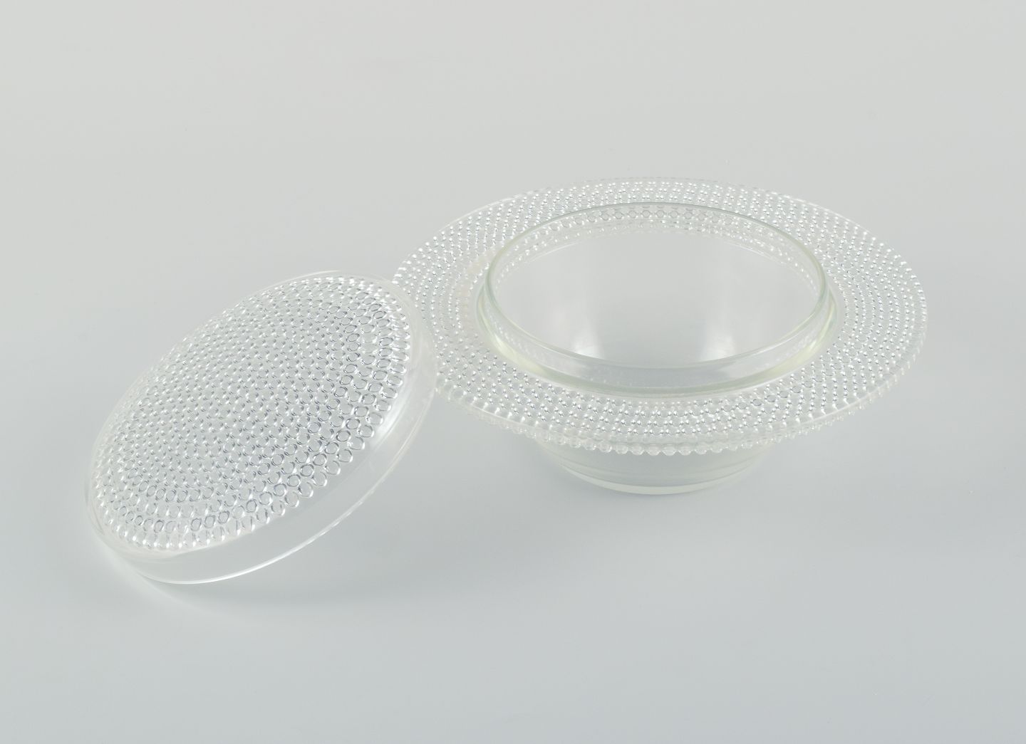 Tidlig René Lalique Nippon-4 lågskål i kunstglas med indlagte luftperler. Cirka 1933. Måler: D 19,0 cm. x H 7,0 cm. Stemplet. I flot stand.
